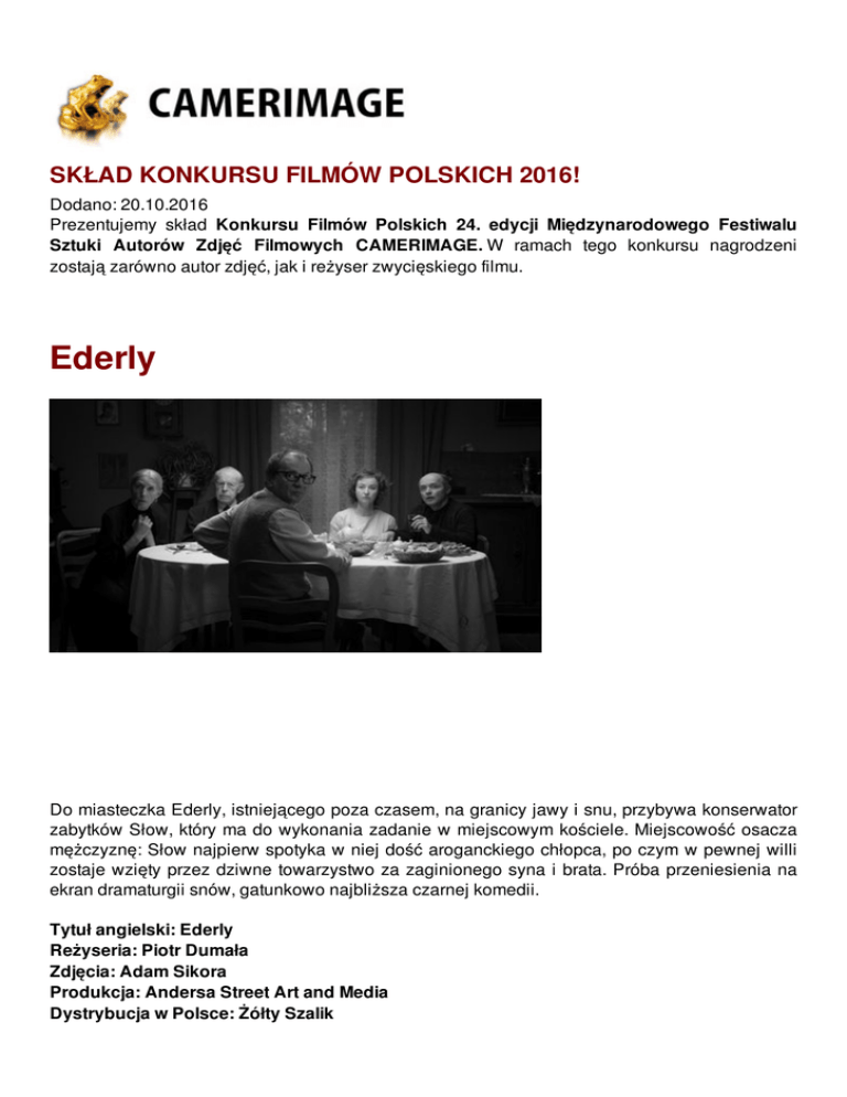 SKŁAD KONKURSU FILMÓW POLSKICH 2016! Dodano: 20.10.2016 Prezentujemy skład Konkursu Filmów Polskich 24. edycji Międzynarodowego Festiwalu Sztuki Autorów Zdjęć Filmowych CAMERIMAGE. W ramach tego konkursu nagrodzeni zostają zarówno autor zdjęć, jak i reżyser zwycięskiego filmu. Ederly Do miasteczka Ederly, istniejącego poza czasem, na granicy jawy i snu, przybywa konserwator zabytków Słow, który ma do wykonania zadanie w miejscowym kościele. Miejscowość osacza mężczyznę: Słow najpierw spotyka w niej dość aroganckiego chłopca, po czym w pewnej willi zostaje wzięty przez dziwne towarzystwo za zaginionego syna i brata. Próba przeniesienia na ekran dramaturgii snów, gatunkowo najbliższa czarnej komedii. Tytuł angielski: Ederly Reżyseria: Piotr Dumała Zdjęcia: Adam Sikora Produkcja: Andersa Street Art and Media Dystrybucja w Polsce: Żółty Szalik Las, 4 rano Frost, mężczyzna w sile wieku, wydaje się królem życia – ma dobrą posadę i pieniądze. Pewnego razu odchodzi z korporacji w sposób nie dający możliwości powrotu. Las, 4 rano kilka lat później. W lepiance mieszka na wpół zdziczały dziad, odziany w łachmany, brudny i zaniedbany, ale żyjący w zgodzie z naturą. To Frost! Kiedy w jego samotni zjawi się trzynastoletnia Jadzia, będzie zmuszony po raz kolejny zmienić swe życie. Tytuł angielski: Forest, 4AM Reżyseria: Jan Jakub Kolski Zdjęcia: Jan Jakub Kolski Produkcja: Wytwórnia Doświadczalna sp z o. o. Dystrybucja w Polsce: Wrocławska Fundacja Filmowa Na granicy Po rodzinnej tragedii pogranicznik Mateusz przybywa z dwoma dorastającymi synami, Jankiem i Tomkiem, do odciętej od cywilizacji górskiej bazy w Bieszczadach, by na nowo ułożyć relacje rodzinne. Tu z samą „dziką” naturą trzeba walczyć o przetrwanie, a sytuację Mateusza i chłopców jeszcze bardziej komplikuje pojawienie się tajemniczego Konrada. Thriller psychologiczny, którego scenariusz został inspirowany prawdziwymi wydarzeniami. Tytuł angielski: The High Frontier Reżyseria: Wojciech Kasperski Zdjęcia: Łukasz Żal Produkcja: Metro Films Sp.z o. o. Dystrybucja w Polsce: KINO ŚWIAT Sp. z o. o. Plac zabaw Koniec roku szkolnego w prowincjonalnym polskim mieście. Dla 12-letniej Gabrysi to ostatnia szansa, by wyjawić koledze z klasy, że jest w nim zakochana. Dziewczynka aranżuje sekretne spotkanie i szantażem zmusza chłopca, żeby się na nie stawił. Ale to, co miało być intymną rozmową wymyka się spod kontroli i wiedzie do nieprzewidzianych i tragicznych rezultatów. Tytuł angielski: Playground Reżyseria: Bartosz Maciej Kowalski Zdjęcia: Mateusz Skalski Produkcja: FILM IT Sp. z o. o. Dystrybucja w Polsce: NEXT FILM Sp. z o. o. Ostatnia rodzina Warszawa, rok 1977. Tomek Beksiński, kultowy dziennikarz muzyczny i tłumacz dialogów w filmach, wprowadza się do nowego mieszkania. Po sąsiedzku, na tym samym osiedlu, mieszkają jego rodzice – zaniepokojona nadwrażliwością i ekscentrycznymi zachowaniami syna Zofia Beksińska i wybitny malarz o nieprzeciętnej osobowości Zdzisław Beksiński. Film ukazuje dramatyczne losy tej rodziny, do której należą również matki Zofii i Zdzisława. Tytuł angielski: The Last Family Reżyseria: Jan P. Matuszyński Zdjęcia: Kacper Fertacz Produkcja: Aurum Film Bodzak Hickinbotham Sp. j. Dystrybucja w Polsce: KINO ŚWIAT Sp. z o. o. Szczęście świata Opowieść o mieszkańcach niezwykłej kamienicy na Śląsku, składająca się z dwóch części. Pierwsza rozgrywa się latem 1939 roku, a więc na krótko przed wybuchem II wojny światowej. Druga – po wojnie. Spojrzenia i westchnienia mieszkających w tym domu mężczyzn w różnym wieku i różnej narodowości kierują się ku ich zmysłowej sąsiadce Róży. Kobieta odsłania przed nimi magiczny świat, do którego wcześniej nie mieli dostępu. Tytuł angielski: The Happiness of the World Reżyseria: Michał Rosa Zdjęcia: Marcin Koszałka Produkcja: Argomedia Sp. z o. o. Dystrybucja w Polsce: KINO ŚWIAT Sp. z o. o. Zaćma Pułkownik Julia Brystigierowa, funkcjonariuszka reżimu stalinowskiego w Polsce, zwana „Krwawą Luną”, zawdzięczała ten przydomek osobistemu, fizycznemu i psychicznemu, torturowaniu więźniów, których przesłuchiwała w Urzędzie Bezpieczeństwa. Nadzorowała też aresztowanie ówczesnego Prymasa Polski kardynała Stefana Wyszyńskiego. I oto w początkach lat 60. w Brystigierowej rodzi się silne pragnienie spotkania z Prymasem. Tytuł angielski: Blindness Reżyseria: Ryszard Bugajski Zdjęcia: Arkadiusz Tomiak Produkcja: RB FILM Sp. z o. o. Dystrybucja w Polsce: KINO ŚWIAT Sp. z o. o. Zjednoczone Stany Miłości Spojrzenie na transformację ustrojową w Polsce pod kątem nie politycznym, lecz psychologicznym. Zaczyna się rok 1990, kraj cieszy się upragnioną wolnością, choć tli się w nim jeszcze duch poprzedniej epoki. W czterech z pozoru szczęśliwych kobietach w różnym wieku nowa rzeczywistość budzi lęk, ale zarazem wyzwala tłumione pragnienia. Agatę, Renatę, Marzenę i siostrę Marzeny, Izę, łączy silne pragnienie zmiany swojego życia. Tytuł angielski: United States of Love Reżyseria: Tomasz Wasilewski Zdjęcia: Oleg Mutu Produkcja: Manana sp. z o. o. Dystrybucja w Polsce: Agencja Promocji MAÑANA