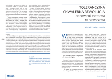 konfesyjnego, a tym samym na odejście od zakorzenienia polityki w „wyższych wartościach”. Wyraźnym torysem była nie tylko królowa Anna, ale też panujący jeszcze w XIX wieku Jerzy III (1760-1820). Bez porzucenia idei państwa konfesyjnego nie sposób jednak mówić o liberalnym konsensie, ani o jego prototypie. Zmiana fundamentów angielskiej polityki nastąpiła formalnie dopiero w wyniku wigowskich reform z lat 1828-1832. Zniesienie Penal Laws, Test and Corporation Acts, Oath of Supremacy, rezygnacja z cenzusu wyznaniowego i wprowadzenie do parlamentu katolików, protestantów, a także polityków innych wyznań były świadectwem faktycznego pluralizmu światopoglądowego w Anglii. Dopiero 288 ten przeskok kładł liberalny fundament dla polityki, z kiełkującą dopiero wolnością słowa. Zmiany te można nazwać konsensem o tyle, o ile zgodziła się na nie większość parlamentarna i król. Część torysów sprzeciwiała się odejściu od nakazu kierowania się w polityce zasadami religijnymi. Warto mieć to na uwadze, gdy uznajemy – jak Michał Zabdyr-Jamróz – że w liberalizmie „liczy się, aby nie krzywdzić innych” (2008: 68). „Starzy” torysi bowiem bez wątpienia czuli się pokrzywdzeni, nazywali oni zmianę paradygmatu politycznego „narodową apostazją” (Keble 1833: 6-27). Liberalizm dąży do zapewnienia pokoju przez rezygnację ze sporów o „wartości wyższe”. Niesprawiedliwością jest jednak pominięcie faktu, że system ten krzywdzi zwolenników tych wartości. Przypisy: 1. Penal Laws były prawami ograniczającymi lub uniemożliwiającymi katolikom, a w pewnej mierze także protestantom, praktykowanie i rozszerzanie ich wiary, a także aktywność polityczną, społeczną, edukacyjną, a nawet rodzinną. Wydawane były od czasów Elżbiety I do końca XVIII wieku; z pewnym wyjątkiem (akt o sukcesji tronu zakazujący dziedziczenia go przez katolika) zostały ostatecznie zniesione w 1829 roku. Z ich treści wynikały między innymi: zakaz przebywania duchownych katolickich na terenie Anglii, zakaz dawania schronienia duchownym katolickim, zakaz zbliżania się innowierców do Londynu, nakaz chrzczenia dzieci w Kościele anglikańskim i uczęszczania na jego nabożeństwa, konieczność uznania króla Anglii za głowę Kościoła i wyrzeczenia się wierności wobec papieża dla zajmowania urzędu publicznego, uznanie wyłączniej ważności małżeństw zawieranych wobec duchownego anglikańskiego i inne. Za niedostosowanie się do Penal Laws groziły kary grzywny, konfiskaty mienia, dożywotnie więzienia, a dla najbardziej nieposłusznych – kara śmierci. Co dalej? Krytykowany tekst Michała Zabdyr-Jamroza znajdziesz w naszym internetowym archiwum www.pressje.org.pl. Jego odpowiedź na tę miażdżącą polemikę znajduje się tuż obok. TOLERANCYJNA CHWALEBNA REWOLUCJA ODPOWIEDŹ PIOTROWI MUSIEWICZOWI Michał Zabdyr-Jamróz W odpowiedzi na polemikę Piotra Musiewicza (2010) z moim tekstem na temat korzeni liberalnego konsensu (2008) spróbuję uporać się z postawionym mi zarzutem popełnienia pięciu błędów i szeregu innych niedociągnięć. Ze względu na wygodę i różną wagę argumentów nie będę się trzymał kolejności zarzutów. Muszę jeszcze zastrzec, że moja polemika ma znacznie bardziej historyczno-prawny charakter, niż dyskutowany artykuł, który był raczej luźnym esejem o historii idei w kontekście powracających do debaty publicznej idei rewolucyjnych. Ale ad rem! Czy przed 1829 rokiem w Anglii panowała tolerancja religijna? Zacznę od argumentów odnoszących się do tolerancji religijnej (2) i (5), które uznaję za najpoważniejsze. Od tego, czy będę w stanie je odeprzeć, zależy w zupełności zasadność moich twierdzeń o „rewolucyjności” Chwalebnej Rewolucji. Na pytanie, kto był bardziej tolerancyjny – Jakub II i jego katoliccy stronnicy, czy też Maria i Wilhelm Orański wraz z anglikańską większością społeczeństwa, Piotr Musiewicz odpowiedział sobie sam. Przyznaje on, że mimo wzorcowo liberalnej frazeologii „polityka Jakuba II nie pozwala na nadanie mu tytułu rzecznika tolerancji” (2010: 286). W obliczu absolutystycznej polityki Stuarta, który dążył do obsadzenia kluczowych urzędów powolnymi mu ludźmi, intencja Declaration wydaje się całkowicie przejrzysta. Odpowiedź ta nie unieważnia jednak podstawowego zarzutu uzasadniającego kwestionowanie tezy o rewolucyjności Chwalebnej Rewolucji – stwierdzenia, że zarówno stronnicy Jakuba II, jak i jego przeciwnicy byli siebie warci. Muszę więc uporać się z drugim wypomnianym mi błędem, że „z analizy dokumentów dotyczących tolerancji w drugiej połowie XVII wieku nie wynika, by w konsekwencji «chwalebnej rewolucji» stała się ona naczelną zasadą” (Musiewicz 2010: 287). Właśnie z powodu rozchodzenia się deklaracji i faktów jestem w stanie podtrzymać swoje stanowisko, że Chwalebna Rewolucja była kamieniem węgielnym liberalizmu politycznego – również dla wolności wyznania w Anglii. Repressje 289 290 W tym miejscu muszę wypomnieć autorowi polemiki pewne niedopatrzenie. (Nie będę ukrywał, że to, co zaraz napiszę, sprawia mi pewną satysfakcję, niezmiernie rzadko bowiem nadarza się okazja, by wytykając komuś zasadniczy błąd, jednocześnie stawiać go w szeregu najwybitniejszych – korzystam z tej okazji ochoczo, gdyż o wiele mniej przyjemne jest robienie jednej z tych rzeczy osobno). Niedopatrzenie owo można nazwać błędem Monteskiusza, nawiązując do komentarza Williama Blackstone’a do uwag tego pierwszego na temat surowości Penal Laws1. Blackstone pisze: „można zauważyć (czego obcokrajowcy, którzy sądząc tylko po treści prawa stanowionego, nie są w pełni świadomi), że te prawa rzadko wykonywane są z pełną surowością. W rzeczy samej, gdyby tak się działo, byłyby one trudne do usprawiedliwienia. Powinno się je raczej brać przez wzgląd na ich 