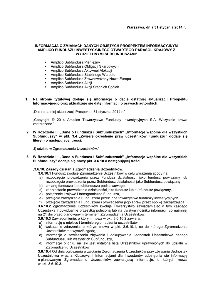 Warszawa, dnia 31 stycznia 2014 r. INFORMACJA O ZMIANACH DANYCH OBJĘTYCH PROSPEKTEM INFORMACYJNYM AMPLICO FUNDUSZU INWESTYCYJNEGO OTWARTEGO PARASOL KRAJOWY Z WYDZIELONYMI SUBFUNDUSZAMI: 1. Amplico Subfundusz Pieniężny Amplico Subfundusz Obligacji Skarbowych Amplico Subfundusz Aktywnej Alokacji Amplico Subfundusz Stabilnego Wzrostu Amplico Subfundusz Zrównoważony Nowa Europa Amplico Subfundusz Akcji Amplico Subfundusz Akcji Średnich Spółek Na stronie tytułowej dodaje się informację o dacie ostatniej aktualizacji Prospektu Informacyjnego oraz aktualizuje się datę informacji o prawach autorskich: „Data ostatniej aktualizacji Prospektu: 31 stycznia 2014 r.” „Copyright © 2014 Amplico Towarzystwo Funduszy Inwestycyjnych S.A. Wszystkie prawa zastrzeżone.” 2. W Rozdziale III „Dane o Funduszu i Subfunduszach” „Informacje wspólne dla wszystkich Subfunduszy” w pkt. 3.4 „Zwięzłe określenie praw uczestników Funduszu” dodaje się literę i) o następującej treści: „i) udziału w Zgromadzeniu Uczestników.” 3. W Rozdziale III „Dane o Funduszu i Subfunduszach” „Informacje wspólne dla wszystkich Subfunduszy” dodaje się nowy pkt. 3.6.10 o następującej treści: „3.6.10. Zasady działania Zgromadzenia Uczestników. 3.6.10.1 Fundusz zwołuje Zgromadzenie Uczestników w celu wyrażenia zgody na: a) rozpoczęcie prowadzenia przez Fundusz działalności jako fundusz powiązany lub rozpoczęcie prowadzenia przez Subfundusz działalności jako Subfundusz powiązany, b) zmianę funduszu lub subfunduszu podstawowego, c) zaprzestanie prowadzenia działalności jako fundusz lub subfundusz powiązany, d) połączenie krajowe i transgraniczne Funduszu, e) przejęcie zarządzania Funduszem przez inne towarzystwo funduszy inwestycyjnych, f) przejęcie zarządzania Funduszem i prowadzenia jego spraw przez spółkę zarządzającą. 3.6.10.2 Zgromadzenie Uczestników zwołuje Towarzystwo zawiadamiając o tym każdego Uczestnika indywidualnie przesyłką poleconą lub na trwałym nośniku informacji, co najmniej na 21 dni przed planowanym terminem Zgromadzenia Uczestników. 3.6.10.3 Zawiadomienie, o którym mowa w pkt. 3.6.10.2 zawiera: a) informację o miejscu i terminie zgromadzenia uczestników, b) wskazanie zdarzenia, o którym mowa w pkt. 3.6.10.1, co do którego Zgromadzenie Uczestników ma wyrazić zgodę, c) informację o zawieszeniu zbywania i odkupywania Jednostek Uczestnictwa danego Subfunduszu lub wszystkich Subfunduszy, d) informację o dniu, na jaki jest ustalona lista Uczestników uprawnionych do udziału w Zgromadzeniu Uczestników. 3.6.10.4 Od dnia ogłoszenia o zwołaniu Zgromadzenia Uczestników przy zbywaniu Jednostek Uczestnictwa wraz z Kluczowymi Informacjami dla Inwestorów udostępnia się informację o planowanym Zgromadzeniu Uczestników zawierającą informacje, o których mowa w pkt. 3.6.10.3. 3.6.10.5 Towarzystwo przed przekazaniem Uczestnikom zawiadomienia, o którym mowa w pkt. 3.6.10.2, ogłasza o zwołaniu Zgromadzenia Uczestników, w sposób określony dla ogłaszania zmian Statutu Funduszu. 3.6.10.6 Uprawnieni do udziału w Zgromadzeniu Uczestników są Uczestnicy wpisani do Rejestru Uczestników Funduszu według stanu na koniec drugiego dnia roboczego poprzedzającego dzień Zgromadzenia Uczestników. W sprawach dotyczących tylko danego Subfunduszu uprawnieni do udziału w Zgromadzeniu Uczestników są Uczestnicy wyłącznie tego Subfunduszu. 3.6.10.7 Zgromadzenie Uczestników jest ważne, jeżeli wezmą w nim udział Uczestnicy uprawnieni zgodnie z pkt. 3.6.10.6 posiadający co najmniej 50% Jednostek Uczestnictwa Funduszu lub Subfunduszu. 3.6.10.8 Przed podjęciem uchwały przez Zgromadzenie Uczestników Zarząd Towarzystwa przedstawia Uczestnikom swoją rekomendację oraz udziela wyjaśnień i odpowiada na zadane pytania przez Uczestników na temat zagadnień związanych ze zdarzeniem będącym przedmiotem Zgromadzenia Uczestników. Uczestnik może również w tym czasie wnioskować o przeprowadzenie dyskusji w przedmiocie zasadności wyrażenia zgody w kwestiach będących przedmiotem Zgromadzenia Uczestników. 3.6.10.9 Każda pełna Jednostka Uczestnictwa upoważnia Uczestnika do oddania jednego głosu. Ułamkowe części Jednostek Uczestnictwa podlegają zaokrągleniu w dół do pełnych Jednostek Uczestnictwa. 3.6.10.10 Uchwała o wyrażeniu zgody, o której mowa w pkt. 3.6.10.1, zapada większością 2/3 głosów Uczestników obecnych lub reprezentowanych na Zgromadzeniu Uczestników. 3.6.10.11 Uchwała Zgromadzenia Uczestników jest protokołowana przez notariusza. 3.6.10.12 Zgromadzenie Uczestników odbywa się w miejscu siedziby Funduszu. 3.6.10.13 Koszty odbycia Zgromadzenia Uczestników ponosi Towarzystwo. 3.6.10.14 Niezwłocznie, nie później jednak niż w terminie 7 dni od zakończenia Zgromadzenia Uczestników, Towarzystwo ogłasza treść podjętych na nim uchwał na stronie internetowej www.metlifeamplico.pl. 3.6.10.15 Uczestnik może zaskarżyć uchwałę Zgromadzenia Uczestników w drodze wytoczonego przeciwko Funduszowi powództwa o stwierdzenie jej nieważności na warunkach wskazanych w art. 87e Ustawy. 3.6.10.16 Tryb działania Zgromadzenia Uczestników oraz podejmowania uchwał poza sprawami określonymi w Statucie określa każdorazowo regulamin przyjęty przez dane Zgromadzenie Uczestników. 3.6.10.17 Uczestnik może ustanowić pełnomocnika do udziału w Zgromadzeniu Uczestników. Pełnomocnictwo powinno być udzielone w formie pisemnej pod rygorem nieważności.” 4. W Rozdziale III „Dane o Funduszu i Subfunduszach” „Informacje wspólne dla wszystkich Subfunduszy” w pkt. 3.8.1 „Okoliczności zawieszenia zbywania Jednostek Uczestnictwa” dodaje się ostatni akapit o następującej treści: „Ponadto w przypadku zwołania Zgromadzenia Uczestników Fundusz zawiesza zbywanie Jednostek Uczestnictwa od dnia poprzedzającego dzień, na który zwołano Zgromadzenie Uczestników do dnia Zgromadze