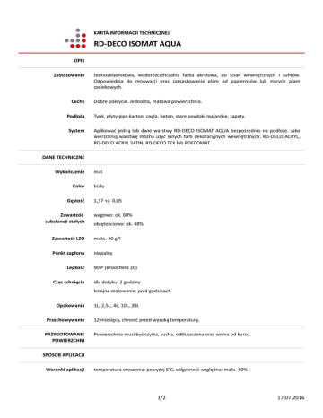 KARTA INFORMACJI TECHNICZNEJ RD-DECO ISOMAT AQUA OPIS Zastosowanie Cechy Jednoskładnikowa, wodorozcieńczalna farba akrylowa, do ścian wewnętrznych i sufitów. Odpowiednia do renowacji oraz zamaskowania plam od papierosów lub starych plam zaciekowych. Dobre pokrycie. Jednolita, matowa powierzchnia. Podłoża Tynk, płyty gips-karton, cegła, beton, stare powłoki malarskie, tapety. System Aplikować jedną lub dwie warstwy RD-DECO ISOMAT AQUA bezpośrednio na podłoże. Jako wierzchnią warstwę można użyć innych farb dekoracyjnych wewnętrznych: RD-DECO ACRYL, RD-DECO ACRYL SATIN, RD-DECO TEX lub RDECOMAT. DANE TECHNICZNE Wykończenie Kolor Gęstość Zawartość substancji stałych mat biały 1,37 +/- 0,05 wagowo: ok. 60% objętościowo: ok. 48% Zawartość LZO maks. 30 g/l Punkt zapłonu niepalny Lepkość Czas schnięcia 90 P (Brookfield 20) dla dotyku: 2 godziny kolejne malowanie: po 4 godzinach Opakowania Przechowywanie PRZYGOTOWANIE POWIERZCHNI 1L, 2,5L, 4L, 10L, 20L 12 miesięcy, chronić przed wysoką temperaturą. Powierzchnia musi być czysta, sucha, odtłuszczona oraz wolna od kurzu. SPOSÓB APLIKACJI Warunki aplikacji temperatura otoczenia: powyżej 5oC, wilgotność względna: maks. 80% 1/2 17.07.2016 Sposób aplikacji pędzel, wałek lub napęd bezpowietrzny (dysza: 013-015) Czyszczenie woda Rozcieńczanie woda Wydajność UWAGI Warunki bezpieczeństwa Karta charakterystyki Wersja ok. 8m2/l Dobrze wymieszać przed użyciem. Zapoznaj się z informacjami na puszce i ulotce. Dostępna na życzenie. 14D30 Informacje tu zawarte przekazywane są w dobrej wierze, w celach informacyjnych. Ponieważ warunki aplikacji są poza kontrolą producenta, firma RD-COATINGS nie może ponosić jakiejkolwiek odpowiedzialności lub obciążeń finansowych, które mogą wynikać z niewłaściwego zastosowania tych produktów. Firma zastrzega sobie prawo modyfikowania danych bez uprzedzenia. Niniejsza karta techniczna zastępuje wszystkie poprzednie wersje. RD-COATINGS ZI DE LA FANGE – Rue Ernest Matagne 19 - B 5330 Assesse - Belgia. W razie dodatkowych pytań prosimy o kontakt: Dystrybutor: Noxan Sp. z o.o. Tel. +48 61 870 87 03 ul. Pułtuska 13 Fax +48 61 624 32 98 61-052 Poznań www.noxan.pl 2/2 17.07.2016