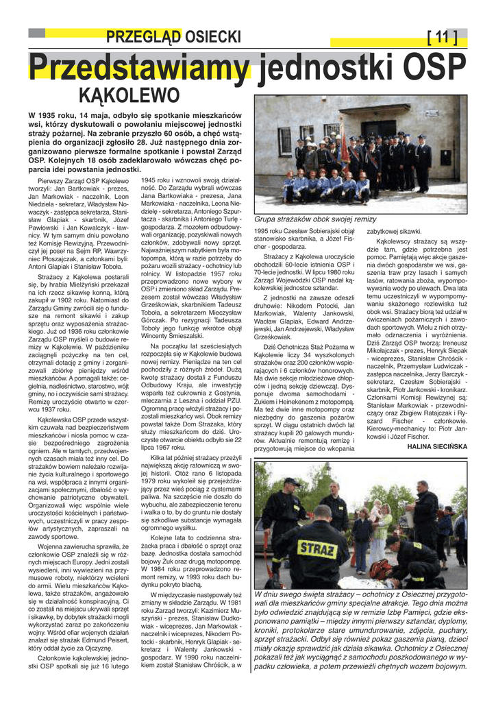 PRZEGLĄD OSIECKI [ 11 ] Przedstawiamy jednostki OSP KĄKOLEWO W 1935 roku, 14 maja, odbyło się spotkanie mieszkańców wsi, którzy dyskutowali o powołaniu miejscowej jednostki straży pożarnej. Na zebranie przyszło 60 osób, a chęć wstąpienia do organizacji zgłosiło 28. Już następnego dnia zorganizowano pierwsze formalne spotkanie i powstał Zarząd OSP. Kolejnych 18 osób zadeklarowało wówczas chęć poparcia idei powstania jednostki. Pierwszy Zarząd OSP Kąkolewo tworzyli: Jan Bartkowiak - prezes, Jan Markowiak - naczelnik, Leon Niedziela - sekretarz, Władysław Nowaczyk - zastępca sekretarza, Stanisław Glapiak - skarbnik, Józef Pawłowski i Jan Kowalczyk - ławnicy. W tym samym dniu powołano też Komisję Rewizyjną. Przewodniczył jej poseł na Sejm RP, Wawrzyniec Płoszajczak, a członkami byli: Antoni Glapiak i Stanisław Toboła. Strażacy z Kąkolewa postarali się, by hrabia Mielżyński przekazał na ich rzecz sikawkę konną, którą zakupił w 1902 roku. Natomiast do Zarządu Gminy zwrócili się o fundusze na remont sikawki i zakup sprzętu oraz wyposażenia strażackiego. Już od 1936 roku członkowie Zarządu OSP myśleli o budowie remizy w Kąkolewie. W paździeniku zaciągnęli pożyczkę na ten cel, otrzymali dotację z gminy i zorganizowali zbiórkę pieniędzy wśród mieszkańców. A pomagali także: cegielnia, nadleśnictwo, starostwo, wójt gminy, no i oczywiście sami strażacy. Remizę uroczyście otwarto w czerwcu 1937 roku. Kąkolewska OSP przede wszystkim czuwała nad bezpieczeństwem mieszkańców i niosła pomoc w czasie bezpośredniego zagrożenia ogniem. Ale w tamtych, przedwojennych czasach miała też inny cel. Do strażaków bowiem należało rozwijanie życia kulturalnego i sportowego na wsi, współpraca z innymi organizacjami społecznymi, dbałość o wychowanie patriotyczne obywateli. Organizowali więc wspólnie wiele uroczystości kościelnych i państwowych, uczestniczyli w pracy zespołów artystycznych, zapraszali na zawody sportowe. Wojenna zawierucha sprawiła, że członkowie OSP znaleźli się w różnych miejscach Europy. Jedni zostali wysiedleni, inni wywiezieni na przymusowe roboty, niektórzy wcieleni do armii. Wielu mieszkańców Kąkolewa, także strażaków, angażowało się w działalność konspiracyjną. Ci co zostali na miejscu ukrywali sprzęt i sikawkę, by dobytek strażacki mogli wykorzystać zaraz po zakończeniu wojny. Wśród ofiar wojenych działań znalazł się strażak Edmund Peisert, który oddał życie za Ojczyznę. Członkowie kąkolewskiej jednostki OSP spotkali się już 16 lutego 1945 roku i wznowoli swoją działalność. Do Zarządu wybrali wówczas Jana Bartkowiaka - prezesa, Jana Markowiaka - naczelnika, Leona Niedzielę - sekretarza, Antoniego Szpurtacza - skarbnika i Antoniego Turlę gospodarza. Z mozołem odbudowywali organizację, pozyskiwali nowych członków, zdobywali nowy sprzęt. Najważniejszym nabytkiem była motopompa, którą w razie potrzeby do pożaru wozili strażacy - ochotnicy lub rolnicy. W listopadzie 1957 roku przeprowadzono nowe wybory w OSP i zmieniono skład Zarządu. Prezesem został wówczas Władysław Grześkowiak, skarbnikiem Tadeusz Toboła, a sekretarzem Mieczysław Górczak. Po rezygnacji Tadeusza Toboły jego funkcję wkrótce objął Wincenty Śmieszalski. Na początku lat sześciesiątych rozpoczęła się w Kąkolewie budowa nowej remizy. Pieniądze na ten cel pochodziły z różnych źródeł. Dużą kwotę strażacy dostali z Funduszu Odbudowy Kraju, ale inwestycję wsparła też cukrownia z Gostynia, mleczarnia z Leszna i oddział PZU. Ogromną pracę włożyli strażacy i pozostali mieszkańcy wsi. Obok remizy powstał także Dom Strażaka, który służy mieszkańcom do dziś. Uroczyste otwarcie obiektu odbyło sie 22 lipca 1967 roku. Kilka lat później strażacy przeżyli największą akcję ratowniczą w swojej historii. Otóż rano 6 listopada 1979 roku wykoleił się przejeżdżający przez wieś pociąg z cysternami paliwa. Na szczęście nie doszło do wybuchu, ale zabezpieczenie terenu i walka o to, by do gruntu nie dostały się szkodliwe substancje wymagała ogromnego wysiłku. Kolejne lata to codzienna strażacka praca i dbałość o sprzęt oraz bazę. Jednostka dostała samochód bojowy Żuk oraz drugą motopompę. W 1984 roku przeprowadzono remont remizy, w 1993 roku dach budynku pokryto blachą. W międzyczasie następowały też zmiany w składzie Zarządu. W 1981 roku Zarząd tworzyli: Kazimierz Muszyński - prezes, Stanisław Dudkowiak - wiceprezes, Jan Markowiak naczelnik i wiceprezes, Nikodem Potocki - skarbnik, Henryk Glapiak - sekretarz i Walenty Jankowski gospodarz. W 1990 roku naczelnikiem został Stanisław Chróścik, a w Grupa strażaków obok swojej remizy 1995 roku Czesław Sobierajski objął stanowisko skarbnika, a Józef Fischer - gospodarza. Strażacy z Kąkolewa uroczyście obchodzili 60-lecie istnienia OSP i 70-lecie jednostki. W lipcu 1980 roku Zarząd Wojewódzki OSP nadał kąkolewskiej jednostce sztandar. Z jednostki na zawsze odeszli druhowie: Nikodem Potocki, Jan Markowiak, Walenty Jankowski, Wacław Glapiak, Edward Andrzejewski, Jan Andrzejewski, Władysław Grześkowiak. Dziś Ochotnicza Staż Pożarna w Kąkolewie liczy 34 wyszkolonych strażaków oraz 200 członków wspierających i 6 członków honorowych. Ma dwie sekcje młodzieżowe chłopców i jedną sekcję dziewcząt. Dysponuje dwoma samochodami Żukiem i Heinekenem z motopompą. Ma też dwie inne motopompy oraz niezbędny do gaszenia pożarów sprzęt. W ciągu ostatnich dwóch lat strażacy kupili 20 galowych mundurów. Aktualnie remontują remizę i przygotowują miejsce do wkopania zabytkowej sikawki. Kąkolewscy strażacy są wszędzie tam, gdzie potrzebna jest pomoc. Pamiętają więc akcje gaszenia dwóch gospodarstw we wsi, gaszenia traw przy lasach i samych lasów, ratowania zboża, wypompowywania wody po ulewach. Dwa lata temu uczest