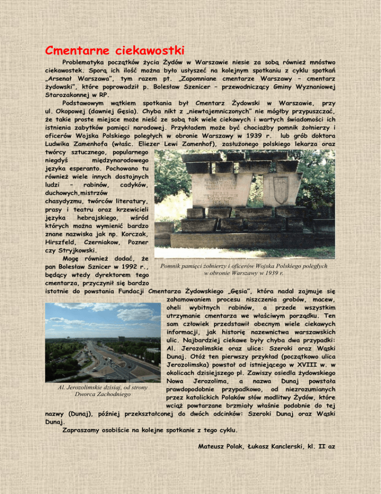 Cmentarne ciekawostki Problematyka początków życia Żydów w Warszawie niesie za sobą również mnóstwo ciekawostek. Sporą ich ilość można było usłyszeć na kolejnym spotkaniu z cyklu spotkań „Arsenał Warszawa”, tym razem pt. „Zapomniane cmentarze Warszawy – cmentarz żydowski”, które poprowadził p. Bolesław Szenicer – przewodniczący Gminy Wyznaniowej Starozakonnej w RP. Podstawowym wątkiem spotkania był Cmentarz Żydowski w Warszawie, przy ul. Okopowej (dawniej Gęsia). Chyba nikt z „niewtajemniczonych” nie mógłby przypuszczać, że takie proste miejsce może nieść ze sobą tak wiele ciekawych i wartych świadomości ich istnienia zabytków pamięci narodowej. Przykładem może być chociażby pomnik żołnierzy i oficerów Wojska Polskiego poległych w obronie Warszawy w 1939 r. lub grób doktora Ludwika Zamenhofa (właśc. Eliezer Lewi Zamenhof), zasłużonego polskiego lekarza oraz twórcy sztucznego, popularnego niegdyś międzynarodowego języka esperanto. Pochowano tu również wiele innych dostojnych ludzi – rabinów, cadyków, duchowych,mistrzów chasydyzmu, twórców literatury, prasy i teatru oraz krzewicieli języka hebrajskiego, wśród których można wymienić bardzo znane nazwiska jak np. Korczak, Hirszfeld, Czerniakow, Pozner czy Stryjkowski. Mogę również dodać, że Pomnik pamięci żołnierzy i oficerów Wojska Polskiego poległych pan Bolesław Sznicer w 1992 r., w obronie Warszawy w 1939 r. będący wtedy dyrektorem tego cmentarza, przyczynił się bardzo istotnie do powstania Fundacji Cmentarza Żydowskiego „Gęsia”, która nadal zajmuje się zahamowaniem procesu niszczenia grobów, macew, oheli wybitnych rabinów, a przede wszystkim utrzymanie cmentarza we właściwym porządku. Ten sam człowiek przedstawił obecnym wiele ciekawych informacji, jak historię nazewnictwa warszawskich ulic. Najbardziej ciekawe były chyba dwa przypadki: Al. Jerozolimskie oraz ulice: Szeroki oraz Wąski Dunaj. Otóż ten pierwszy przykład (początkowo ulica Jerozolimska) powstał od istniejącego w XVIII w. w okolicach dzisiejszego pl. Zawiszy osiedla żydowskiego Nowa Jerozolima, a nazwa Dunaj powstała Al. Jerozolimskie dzisiaj, od strony prawdopodobnie przypadkowo, od niezrozumianych Dworca Zachodniego przez katolickich Polaków słów modlitwy Żydów, które wciąż powtarzane brzmiały właśnie podobnie do tej nazwy (Dunaj), później przekształconej do dwóch odcinków: Szeroki Dunaj oraz Wąski Dunaj. Zapraszamy osobiście na kolejne spotkanie z tego cyklu. Mateusz Polak, Łukasz Kanclerski, kl. II az