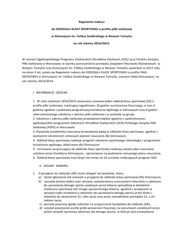 Regulamin naboru do ODDZIAŁU KLASY SPORTOWEJ o profilu piłki siatkowej w Gimnazjum im. Feliksa Szołdrskiego w Nowym Tomyślu na rok szkolny 2014/2015. W ramach Ogólnopolskiego Programu Siatkarskich Ośrodków Szkolnych /SOS/ przy Polskim Związku Piłki Siatkowej w Warszawie, w wyniku porozumienia pomiędzy Zespołem Placówek Oświatowych w Nowym Tomyślu oraz Gimnazjum im. Feliksa Szołdrskiego w Nowym Tomyślu zawartym w 2012 roku na okres 3 lat, ustala się Regulamin naboru do ODDZIAŁU KLASY SPORTOWEJ o profilu PIŁKI SIATKOWEJ w Gimnazjum im. Feliksa Szołdrskiego w Nowym Tomyślu, zwanym dalej Gimnazjum, na rok szkolny 2013/2014. I. INFORMACJE OGÓLNE. 1. W roku szkolnym 2014/2015 utworzony zostanie jeden oddział klasy sportowej [SK] o profilu piłki siatkowej, realizujący tygodniowo 10 godzin wychowania fizycznego, w tym 4 godziny zgodnie z podstawą programową kształcenia ogólnego w Gimnazjum oraz 6 godzin ukierunkowanego szkolenia z zakresu piłki siatkowej i w podziale na grupy. 2. Szkolenie z zakresu piłki siatkowej prowadzone będzie zgodnie z ujednoliconym, ogólnopolskim programem Szkolnych Ośrodków Siatkarskich (SOS) Polskiego Związku Piłki Siatkowej (PZPS) w Warszawie. 3. Pozostałe przedmioty nauczania prowadzone będą w oddziale klasy sportowej zgodnie z wymiarem określonym ramowym planem nauczania dla Gimnazjum. 4. Oddział klasy sportowej realizuje program szkolenia sportowego równolegle z programem kształcenia ogólnego, właściwym dla Gimnazjum. 5. Uczniowie uczęszczający do oddziału klasy sportowej realizują szkolny plan nauczania ustalony przez Dyrektora Gimnazjum, opracowany na podstawie ramowego planu nauczania. 6. Oddział klasy sportowej musi liczyć nie mniej niż 24 uczniów realizujących program SOS II. ZASADY NABORU. 1. O przyjęcie do oddziału [SK] może ubiegać się kandydat, który: a/ złożył zgłoszenie lub wniosek o przyjęcie do oddziału klasy sportowej [SK] Gimnazjum; b/ posiada bardzo dobry stan zdrowia, potwierdzony orzeczeniem lekarskim o zdolności do uprawiania danego sportu wydanym przez lekarza specjalistę w dziedzinie medycyny sportowej lub innego uprawnionego lekarza, zgodnie z przepisami w sprawie trybu orzekania o zdolności do uprawiania danego sportu przez dzieci i młodzież do ukończenia 21. roku życia oraz przez zawodników pomiędzy 21. a 23. rokiem życia; c/ posiada pisemną zgodę rodziców na uczęszczanie kandydata do oddziału [SK]; d/ uzyskał pozytywne wyniki prób sprawności fizycznej, na warunkach ustalonych przez polski związek sportowy właściwy dla danego sportu, w którym jest prowadzone szkolenie sportowe w danym oddziale., d/ posiada co najmniej poprawną ocenę z zachowania na świadectwie ukończenia szkoły podstawowej. 2. Wymagane dokumenty: A. niezbędne do przeprowadzenia rekrutacyjnych zajęć szkoleniowo – obserwacyjnych: a/ zgłoszenie lub wniosek o przyjęcie do Gimnazjum; b/ oświadczenie rodziców o stanie zdrowia kandydata c/ zgoda rodziców/prawnych opiekunów na udział w próbie sprawności fizycznej B. niezbędne do przyjęcia do oddziału [SK] Gimnazjum: a/ orzeczenie lekarskie o stanie zdrowia, opisanym w punkcie 1b b/ karta informacyjna o uczniu c/ świadectwo ukończenia szkoły podstawowej, 3. Termin składania dokumentów wymienionych w punkcie 2 A, przez kandydatów do oddziału [SK] w Gimnazjum upływa 16 maja 2014 r., dokumentów wymienionych w punkcie 2 B upływa 1 lipca 2014 r. 4. Próby sprawności fizycznej dla kandydatów do oddziału klasy sportowej Gimnazjum , bez względu na kategorię wyboru /I, II, czy III wybór/,przeprowadzone zostaną jednorazowo w hali sportowej Gimnazjum w dniach 21 i 22 maja 2014 r. od godz. 17:00 5. Listę uczniów przyjętych do oddziału klasy sportowej, zgodnie z „Procedurami postępowania rekrutacyjnego…”, ogłasza Dyrektor Gimnazjum w terminie do dnia 7 lipca 2014 r. 6. W pierwszej kolejności przyjmowani są do oddziału [SK] kandydaci z obwodu Gimnazjum, a następnie – o ile pozostaną wolne miejsca -‐ kandydaci spoza obwodu Gimnazjum, którzy uzyskali wymaganą ilość punktów kwalifikujących do oddziału; 7. W przypadku równej liczby punktów na liście rankingowej o zakwalifikowaniu do [SK] na pierwszym etapie postępowania rekrutacyjnego decyduje lepszy wynik próby sprawnościowej; 8. W przypadku równorzędnych wyników uzyskanych na pierwszym etapie postępowania rekrutacyjnego, na drugim etapie postępowania rekrutacyjnego, są brane pod uwagę kryteria określone w „Procedurach postępowania rekrutacyjnego”… : 9. W przypadku mniejszej liczby uczniów, którzy osiągną wymaganą liczbę punktów prawo przyjęcia zyskuje kolejna osoba z największą liczbą punktów bez względu na miejsce zamieszkania. 10. W przypadku zwolnienia się miejsc w oddziale, rekrutację do oddziału klasy sportowej można przeprowadzić także w trakcie roku szkolnego, na wniosek ucznia za zgodą rodziców/prawnych opiekunów, nauczyciela lub trenera, po spełnieniu wymagań opisanych w punkcie II.1. III. REZYGNACJA I WYKLUCZENIE UCZNIA Z ODDZIAŁU KLASY SPORTOWEJ. 1. Uczniowie w porozumieniu z rodzicami/prawnymi opiekunami, na umotywowany wniosek złożony do dyrektora Gimnazjum, mogą zrezygnować z nauki ucznia w oddziale klasy sportowej; uczniowie zostają wtedy przeniesieni przez dyrektora Gimnazjum do oddziału o podstawowym profilu kształcenia, a uczniowie spoza obwodu Gimnazjum skierowani zostają do szkoły właściwej ich obwodowi szkolnemu; 2. Uczniowie oddziału klasy sportowej za złe zachowanie lub niezadawalające wyniki w nauce mogą być zawieszeni przez dyrektora Gimnazjum w rozgrywkach lub treningach do czasu poprawy /na wniosek wychowawcy klasy w porozumieniu z rodzicami, nauczycielem wychowania fizycznego i trenerami/; 3. Uczniowie oddziału klasy sportowej, których stan zdrowia orzeczony po przyjęciu ucznia do klasy sportowej wykluczy uprawianie sportu, zostają przeniesieni przez dy