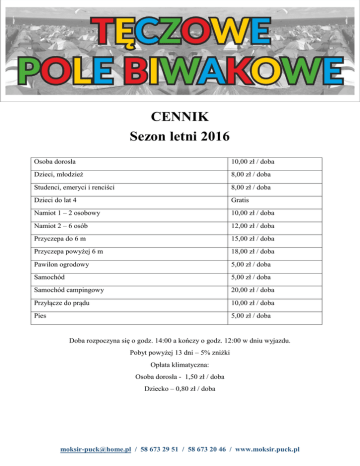 CENNIK Sezon letni 2016 Osoba dorosła 10,00 zł / doba Dzieci, młodzież 8,00 zł / doba Studenci, emeryci i renciści 8,00 zł / doba Dzieci do lat 4 Gratis Namiot 1 – 2 osobowy 10,00 zł / doba Namiot 2 – 6 osób 12,00 zł / doba Przyczepa do 6 m 15,00 zł / doba Przyczepa powyżej 6 m 18,00 zł / doba Pawilon ogrodowy 5,00 zł / doba Samochód 5,00 zł / doba Samochód campingowy 20,00 zł / doba Przyłącze do prądu 10,00 zł / doba Pies 5,00 zł / doba Doba rozpoczyna się o godz. 14:00 a kończy o godz. 12:00 w dniu wyjazdu. Pobyt powyżej 13 dni – 5% zniżki Opłata klimatyczna: Osoba dorosła - 1,50 zł / doba Dziecko – 0,80 zł / doba [email protected] / 58 673 29 51 / 58 673 20 46 / www.moksir.puck.pl