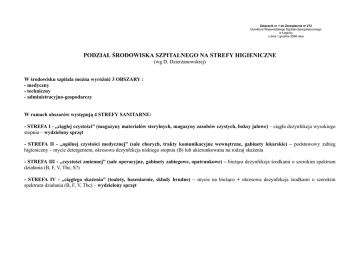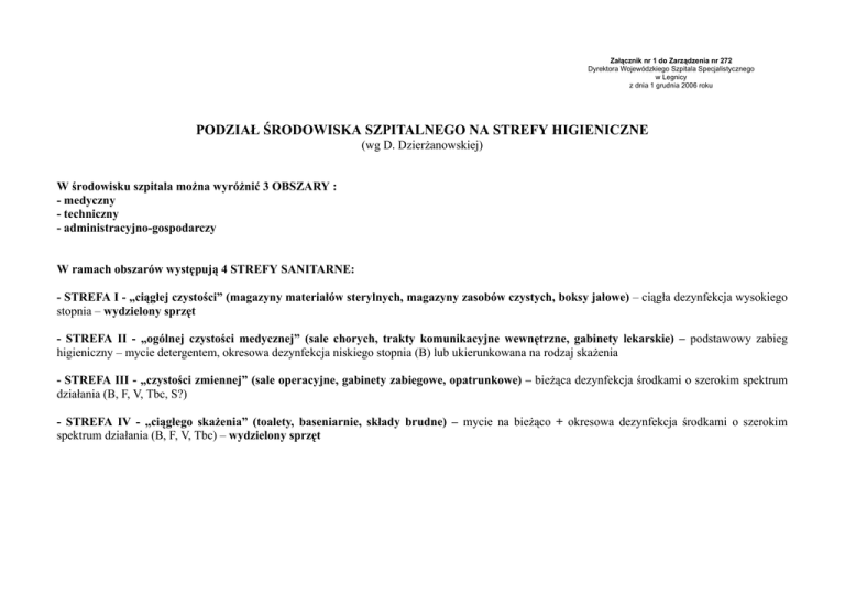 Załącznik nr 1 do Zarządzenia nr 272 Dyrektora Wojewódzkiego Szpitala Specjalistycznego w Legnicy z dnia 1 grudnia 2006 roku PODZIAŁ ŚRODOWISKA SZPITALNEGO NA STREFY HIGIENICZNE (wg D. Dzierżanowskiej) W środowisku szpitala można wyróżnić 3 OBSZARY : - medyczny - techniczny - administracyjno-gospodarczy W ramach obszarów występują 4 STREFY SANITARNE: - STREFA I - „ciągłej czystości” (magazyny materiałów sterylnych, magazyny zasobów czystych, boksy jałowe) – ciągła dezynfekcja wysokiego stopnia – wydzielony sprzęt - STREFA II - „ogólnej czystości medycznej” (sale chorych, trakty komunikacyjne wewnętrzne, gabinety lekarskie) – podstawowy zabieg higieniczny – mycie detergentem, okresowa dezynfekcja niskiego stopnia (B) lub ukierunkowana na rodzaj skażenia - STREFA III - „czystości zmiennej” (sale operacyjne, gabinety zabiegowe, opatrunkowe) – bieżąca dezynfekcja środkami o szerokim spektrum działania (B, F, V, Tbc, S?) - STREFA IV - „ciągłego skażenia” (toalety, baseniarnie, składy brudne) – mycie na bieżąco + okresowa dezynfekcja środkami o szerokim spektrum działania (B, F, V, Tbc) – wydzielony sprzęt
