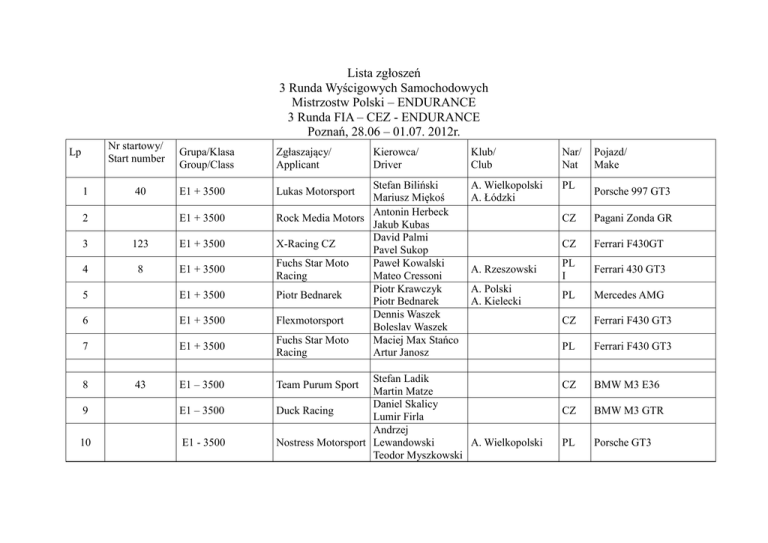 Lista zgłoszeń 3 Runda Wyścigowych Samochodowych Mistrzostw Polski – ENDURANCE 3 Runda FIA – CEZ - ENDURANCE Poznań, 28.06 – 01.07. 2012r. Nr startowy/ Start number Lp 1 40 2 Grupa/Klasa Group/Class Zgłaszający/ Applicant E1 + 3500 Lukas Motorsport E1 + 3500 3 123 E1 + 3500 4 8 E1 + 3500 5 E1 + 3500 6 E1 + 3500 7 E1 + 3500 8 43 E1 – 3500 9 E1 – 3500 10 E1 - 3500 Kierowca/ Driver Stefan Biliński Mariusz Miękoś Antonin Herbeck Rock Media Motors Jakub Kubas David Palmi X-Racing CZ Pavel Sukop Fuchs Star Moto Paweł Kowalski Racing Mateo Cressoni Piotr Krawczyk Piotr Bednarek Piotr Bednarek Dennis Waszek Flexmotorsport Boleslav Waszek Fuchs Star Moto Maciej Max Stańco Racing Artur Janosz Klub/ Club Nar/ Nat A. Wielkopolski A. Łódzki PL Porsche 997 GT3 CZ Pagani Zonda GR CZ Ferrari F430GT A. Rzeszowski PL I Ferrari 430 GT3 A. Polski A. Kielecki PL Mercedes AMG CZ Ferrari F430 GT3 PL Ferrari F430 GT3 CZ BMW M3 E36 CZ BMW M3 GTR PL Porsche GT3 Stefan Ladik Martin Matze Daniel Skalicy Duck Racing Lumir Firla Andrzej Nostress Motorsport Lewandowski A. Wielkopolski Teodor Myszkowski Team Purum Sport Pojazd/ Make 11 25 E1 – 2000 IP Racing Shop 12 66 E1 – 2000 KT Motosport s.r.o 13 89 E1 – 2000 KT Motosport s.r.o Milan Valaśek Christian Malcharek Petr Mandelik Josef Zaruba Marek Fried Milan Braun CZ Renault Clio III RS CZ Lotus Exige GT-R CZ Lotus Exige Lista zgłoszeń 5 i 6 Runda Wyścigowych Samochodowych Mistrzostwa Polski – SPRINT 9 i 10 Runda FIA CEZ - SPRINT Poznań, 28.06 – 01.07. 2012r. 1 5 Grupa/Kla sa Zgłaszający/ Group/Cla Applicant ss E1 + 3500 Fuchs Star Moto Racing 2 8 E1 + 3500 Fuchs Star Moto Racing Paweł Kowalski 3 E1 + 3500 Bohemia Racing Team Tomas Kostka CZ Audi A4 4 E1 + 3500 Rock Media Motors Antonin Herbeck CZ Pagani Zonda GR PL Porsche 997 GT3 SL Porsche 911 GT3 RS Lp Nr startowy/ Start number Kierowca/ Driver Klub/ Club Nar/ Pojazd/ Nat Make Artur Janosz A. Kielecki PL Ferrari 430 GT3 A. Rzeszowski PL Ferrari 430 GT3 5 96 E1 + 3500 GT 3 Poland Jarosław Budzyński 6 60 E1 + 3500 TopCar Machanek Rudolf Machanek 7 21 E1 + 3500 GT 3 Poland Bartosz Opioła A. Rzeszowski PL Porsche 997 GT3 5i6 8 1 E1 + 3500 Fuchs Star Moto Racing Maciej Stańco A. Kielecki PL Ferrari 430 GT3 9 44 E1 + 3500 Racing Trevor Attila Barta H BMW B6 GT3 E1 + 3500 FlexMotorSport Nostress&Premium E1 + 3500 Motosport Poland Dennis Waszek CZ Ferrari F430 GT3 10 11 Scarpaccio Luis A. Rzeszowski A. Wielkoplski Mercedes AMG SLS 12 43 E1 – 3500 Team Purum Sport Martin Matzke CZ BMW M3 E 36 13 25 E1 – 3500 Senkyr Motosport Michal Harasek CZ BMW M3 E36 GTR 14 23 E1 – 3500 Senkyr Motosport Lukas Vrecka CZ BMW E36 GTR 15 24 E1 – 3500 Senkyr Motosport Milan Braun CZ BMW M3 E36 GTR 16 36 E1 – 3500 K&K Racing Team Zdenek Tesarik CZ BMW Z4 GTR 17 27 E1 – 3500 Duck Racing Peter Kacirek CZ BMW M3 GTR 18 88 E1 – 3500 KT Motosport s.r.o CZ Lotus Evora GT-R A. Wielkopolski PL Porsche GT3 A. Galicyjski 19 E1 – 3500 20 E1 - 3500 Senkyr Motorsport Tomaś Kusy Andrzej Lewandowski Vrecka Lukas Nostress Motorsport 21 147 E1 – 2000 Filip Mocie Filip Mocie 22 89 E1 – 2000 KT Motosport s.r.o 23 66 24 46 25 BMW M3 E36 GTR PL Renault Clio Marek Fried CZ Lotus Exige Petr Mandelik CZ Lotus Exige GT-R Petr Muzik CZ Renault Clio Sport 48 E1 – 2000 KT Motosport s.r.o MARIUS PEDERSEN E1 – 2000 TEAM E1 – 2000 Cezary Ruszkowski Cezary Ruszkowski A. Rzemieślnik PL Lotus Exige 26 44 E1 – 2000 Basen Hurt PMR Team Marek Rzepecki A. Wielkopolski PL Renault Clio III RS 27 47 E1 – 2000 Basen Hurt PMR Team Adam Rzepecki A. Wielkopolski PL Renault Clio III RS 28 144 E1 – 2000 Basen Hurt PMR Team Marcin Scheffler A. Wielkopolski PL Honda Type-R 29 49 E1 – 2000 Basen Hurt PMR Team Maciej RochPietrzak A. Wielkopolski PL Honda Type-R 30 E1 – 2000 Nostress Motorsport Paweł Tarnawski 31 E1 – 2000 Waab Motorsport Maciej OstojaChyżyński ALFA ROMOE 147 A. Rzemieślnik PL Renault Clio III RS Lista zgłoszeń 5 i 6 Runda Wyścigowych Samochodowych Mistrzostw Polski – Formuł E2-2000 9 i 10 Runda FIA-CEZ Formuła E2-2000 Poznań, 28.06 – 01.07.2012r. Nr startowy/ Start number Grupa/Klasa Group/Class Zgłaszający/ Applicant Kierowca/ Driver 1 E2 – 2000 Inter Europol Competition 2 E2 – 2000 Chabrmotorsport 3 E2 – 2000 4 E2 – 2000 Lp Nar/ Nat Pojazd/ Make Jakub Śmiechowski A. Rzemieślnik PL Formuła Renault Tomaś Chabr junior CZ Tomis AMK ECCE Homo Petr Trnka CZ Gloria C8FT Roman Hoffmann A Tatuus Honda Roman Hoffmann Klub/ Club Lista zgłoszeń 3 i 4 Runda Wyścigowego Pucharu Polski Poznań, 28.06 – 01.07. 2012r. LP Nr startowy 1 3 WPP - 1 N Łukasz Janiak Łukasz Janiak A. Wielkopolski Na Samochód r PL Fiat Cinquecento 2 4 WPP - 1 N Bartosz Knast A. Wielkopolski PL Fiat Seicento 3 6 WPP - 1 N Przemysław Kaźmierczak A. Wielkopolski PL Fiat Seicento 4 7 WPP – 1 N Michał Bordzioł Bartosz Knast Przemysław Kaźmierczak Michał Bordzioł A. Polski PL Fiat Seicento 5 10 WPP – 1 N Dawid Kaniewski Dawid Kaniewski A. Wielkopolski PL Fiat Seicento 6 101 WPP – 1 N Mariusz Szkudlarek Mariusz Szkudlarek A. Wielkopolski PL Fiat Seicento 7 102 WPP – 1 N Arkadiusz Urbański Arkadiusz Urbański A. Wielkopolski PL Fiat Cinquecento 8 104 WPP – 1 N Michał Bastjan Michał Bastjan A. Rzemieślnik PL Fiat Seicento 9 106 WPP – 1 N Łukasz Trzeciak Łukasz Trzeciak A. Kielecki PL Fiat Seicento 10 8 WPP – 1 N Kamil Talarczyk Kamil Talarczyk A. Wielkopolski PL Fiat Seicento 11 105 WPP – 1 N Michał Bieniecki Bieniecki Michał A. Rzemieślnik PL Fiat Cinquecento 12 103 WPP – 1 N Bartosz Rybienik Bartosz Rybienik A. Rzemieślnik PL Fiat Seicento 13 9 WPP – 1 N Adrian Wielowiejski Adrian Wielowiejski A. Wielkopolski PL Fiat Seicento WPP – 1 N Mikołaj Jóżwiak Mikołaj Jóżwiak A. Wielkopolski PL Fiat Seicento 14 Klasa Zgłaszający Kierowca Klub 15 12 WPP – 1 A Karol Wyka Karol Wyka A. Rzemieślnik PL Fiat Seicento 16 16 WPP – 1 A Tomasz Zawada Tomasz Zawada A. Rz