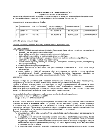 BURMISTRZ MIASTA TARNOWSKIE GÓRY zaprasza do udziału w rokowaniach na sprzedaż nieruchomości gruntowych niezabudowanych będących własnością Gminy położonych w Tarnowskich Górach w rej. ul. Opatowickiej (obręb Tarnowskie Góry arkusz 2) Nieruchomość gruntowa stanowi działkę: Lp. Numer działki pow. (w m2)/ użytek Cena wywoławcza w pierwszym przetargu Wysokość zaliczki 1 2646/146 1562 RV 183.500,00 zł 36.700,00 zł GL1T/00042096/4 2 2666/146 827 RV 95.400,00 zł 19.080,00 zł GL1T/00042096/4 Numer KW użytki: R - grunty orne, dr-droga Do ceny sprzedaży zostanie doliczony podatek VAT w wysokości 23%. Opis nieruchomości: nieruchomości stanowią własność Gminy Tarnowskie Góry, nie są obciążone prawami osób trzecich i nie są przedmiotem zobowiązań, teren oddalony od dróg o znacznym natężeniu ruchu kołowego, sąsiedztwo bezpośrednie to tereny mieszkaniowe, pola i łąki, nieco dalej znajdują się budynki usługowo-handlowe, budynki użyteczności publicznej, uzbrojenie w zasięgu - wzdłuż ulicy Opatowickiej, kształt działek regularny zbliżony do prostokąta - teren płaski, porośnięty zielenią nieurządzoną, niezagospodarowany, lokalizacja w strefie peryferyjnej miasta, dojazd wydzieloną (przewidzianą do tymczasowego utwardzenia w 2015 roku) drogą wewnętrzną. przez działkę nr 2646/146 przebiega sieć wodociągowa, w związku z czym zabudowa przedmiotowych działek ograniczona. Położenie budynków (wymaganą odległość od wodociągu) należy uzgodnić z właścicielem sieci tj. Veolia - PWiK spółka z o.o. Uzbrojenie: Posiada dostęp do podstawowych urządzeń infrastruktury technicznej tj. sieci wodociągowej, energetycznej. Niezbędna budowa podstawowej infrastruktury wodno-kanalizacyjnej. Zgodnie z prawem Energetycznym oraz wydanymi do niego rozporządzeniami na operatorze sieci elektroenergetycznej ciąży obowiązek realizacji oraz finansowania budowy i rozbudowy elektroenergetycznych urządzeń zasilających. Warunkiem jest zawarcie przez podmiot przyłączany umowy przyłączeniowej i wniesienie przez niego opłaty za przyłączenie. Na sprzedaż nieruchomości przeprowadzono dwa przetargi ustne nieograniczone: pierwszy: w dniu 13 i 27 listopada 2014r. drugi: w dniu 13 i 27 kwietnia 2015r. Burmistrz Miasta zaprasza osoby fizyczne i prawne zainteresowane nabyciem w/w nieruchomości do składania do dnia 1 września 2015r. do godziny 1600 w Kancelarii Ogólnej Urzędu Miejskiego w budynku przy ulicy Sienkiewicza 2 w Tarnowskich Górach, pisemnych zgłoszeń w zaklejonych kopertach z napisem „Oferta dotycząca nabycia nieruchomości gruntowej niezabudowanej położonej w rej. ul. Opatowickiej w Tarnowskich Górach (podać nr działki) – nie otwierać” Zgłoszenia powinny zawierać: 1. imię, nazwisko i adres albo nazwę lub firmę oraz siedzibę, jeżeli zgłaszającym jest osoba prawna lub inny podmiot, 2. w przypadku osób fizycznych (lub osoby fizyczne prowadzące działalność gospodarczą) dowód tożsamości, w/w osoby pozostające w związku małżeńskim i posiadające ustrój wspólności majątkowej – dodatkowe pisemne oświadczenie współmałżonka, iż wyraża on zgodę na nabycie nieruchomości będącej przedmiotem przetargu po cenie wylicytowanej przez współmałżonka przystępującego do przetargu, 3. w przypadku osób prawnych i jednostek organizacyjnych nie posiadających osobowości prawnej 4. 5. 6. 7. 8. aktualny wypis z właściwego dla danego podmiotu rejestru, pełnomocnictwo, dowód tożsamości osób reprezentujących podmiot, Datę sporządzenia zgłoszenia, Oświadczenie, że zgłaszający zapoznał się z warunkami rokowań i przyjmuje te warunki bez zastrzeżeń, Proponowaną cenę (podając numer działki) i sposób zapłaty, Kserokopię wpłaty zaliczki pobieranej w celu zabezpieczenia kosztów w przypadku uchylenia się od zawarcia umowy, Podpis zgłaszającego (osoby upoważnionej do składania oświadczeń woli w imieniu oferenta). Pełnomocnicy osób fizycznych oraz osoby fizyczne umocowane do działania w imieniu osób prawnych winni przedstawić notarialnie poświadczone pełnomocnictwo. Warunkiem przystąpienia do rokowań jest a) złożenie oferty, b) wpłacenie w/w zaliczki - zaliczkę wnosi się na konto tut. Urzędu - ING Bank Śląski S.A. Nr rachunku 68 1050 1230 1000 0090 3045 9466 do dnia 1 września 2015r, c) obecność oferenta podczas otwarcia ofert na części jawnej rokowań, Za dzień wniesienia zaliczki uważa się dzień wpływu na konto Urzędu Miejskiego. Otwarcie zgłoszeń w obecności uczestników rokowań nastąpi w dniu 7 września 2015r. o godzinie: 1200 poz. nr 1 1400 poz. nr 2 w pokoju nr 40 w budynku przy ul. Sienkiewicza 2 w Tarnowskich Górach. Oferentom, których oferta nie zostanie przyjęta wpłacona zaliczka zostanie zwrócona w ciągu trzech dni roboczych od dnia zamknięcia lub odwołania rokowań przelewem na podane konto bankowe uczestnika rokowań. Zaliczki wpłacone przez nabywców wyłonionych w rokowaniach, zostaną zaliczone na poczet ceny nabycia nieruchomości. Zaliczka przepada, jeżeli nabywca uchyli się od podpisania aktu notarialnego w wyznaczonym terminie. W terminie do 21 dni od daty podpisania protokołu z rokowań zostanie wyznaczony termin zawarcia umowy sprzedaży. Koszt zawarcia umowy notarialnej wraz z kosztami opłaty sądowej ponosi nabywca. Wynegocjowana w rokowaniach cena (do której zostanie doliczony podatek VAT w wysokości 23%) nieruchomości powinna być wpłacona na konto Urzędu Miejskiego przed zawarciem aktu notarialnego (zgodnie z protokołem z przeprowadzonych rokowań) i znajdować się na koncie Urzędu trzy dni przed podpisaniem umowy notarialnej. Cudzoziemców wiążą przepisy ustawy z dnia 24.03.1920r.o nabywaniu nieruchomości przez cudzoziemców (tekst jednolity Dz. U. z 2004r., Nr 167 poz. 1754 z późniejszymi zmianami), Burmistrz Miasta zastrzega sobie prawo zamknięcia rokowań bez wybrania nabywc