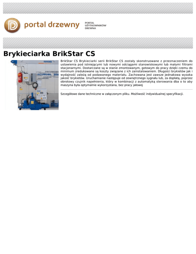 Brykieciarka BrikStar CS BrikStar CS Brykieciarki serii BrikStar CS zostały skonstruowane z przeznaczeniem do ustawienia pod istniejącymi lub nowymi odciągami stanowiskowymi lub małymi filtrami stacjonarnymi. Dostarczane są w stanie zmontowanym, gotowym do pracy dzięki czemu do minimum zredukowane są koszty związane z ich zainstalowaniem. Długości brykietów jak i wydajność zależą od podawanego materiału. Zachowana jest zawsze jednakowa wysoka jakość brykietów. Uruchamianie następuje od zewnętrznego sygnału lub, za dopłatą, poprzez obrotowy czujnik napełnienia, który w kombinacji z automatyką sterowania dba o to aby maszyna była optymalnie wykorzystana, bez pracy jałowej Szcegółowe dane techniczne w załączonym pliku. Możliwość indywidualnej specyfikacji.