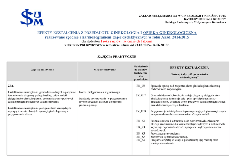 ZAKŁAD PIELĘGNIARSTWA W GINEKOLOGII I POŁOŻNICTWIE KATEDRY ZDROWIA KOBIETY Śląskiego Uniwersytetu Medycznego w Katowicach EFEKTY KSZTAŁCENIA Z PRZEDMIOTU GINEKOLOGIA I OPIEKA GINEKOLOGICZNA realizowane zgodnie z harmonogramem zajęć dydaktycznych w roku Akad. 2014/2015 dla studentów I roku studiów stacjonarnych I stopnia semestrze letnim od 23.02.2015– 14.06.2015r. KIERUNEK POŁOŻNICTWO w ZAJĘCIA PRAKTYCZNE Zajęcia praktyczne Moduł tematyczny ZP.1. Kształtowanie umiejętności gromadzenia danych o pacjentce, Proces pielęgnowania w ginekologii. formułowania diagnozy pielęgniarskiej, celów opieki pielęgniarsko-ginekologicznej, dokonania oceny podjętych Standardy postępowania w przygotowaniu działań pielęgniarskich oraz dokumentowania. psychofizycznym dalszym do operacji ginekologicznej. Kształtowanie umiejętności pielęgniarskich niezbędnych w przygotowaniu chorej do operacji ginekologicznej przygotowanie dalsze. Odniesienie do efektów kształcenia dla przedmiotu EFEKTY KSZTAŁCENIA Student, który zaliczył przedmiot wie/umie/potrafi: EK_U8 Sprawuje opiekę nad pacjentką chorą ginekologicznie leczoną zachowawczo i operacyjnie. EK_U17 Gromadzi dane o kobiecie, formułuje diagnozę pielęgniarskoginekologiczną, formułuje cele i plan opieki pielęgniarskoginekologicznej, dokonuje oceny podjętych działań pielęgniarskich oraz dokumentuje swoje działania. EK_U19 Przygotowuje kobietę do zabiegów operacyjnych ginekologicznych przeprowadzanych z zastosowaniem różnych technik. EK_K1 Szanuje godność i autonomie osób powierzonych opiece oraz okazuje zrozumienie dla różnic światopoglądowych i kulturowych. Wykazuje odpowiedzialność za pacjenta i wykonywanie zadań zawodowych. Przestrzega praw pacjenta. Zachowuje tajemnicę zawodową. Przejawia empatię w relacji z podopieczną i jej rodziną oraz współpracownikami. EK_K4 EK_K5 EK_K7 EK_K9 ZP.2. Kształtowanie umiejętności pielęgniarskich niezbędnych w przygotowaniu chorej do operacji ginekologicznej przygotowanie bliższe. Standardy postępowania w przygotowaniu psychofizycznym bliższym pacjentki do operacji ginekologicznej. Tryb przygotowania planowy i nagły. EK_U19 Przygotowuje kobietę do zabiegów operacyjnych ginekologicznych przeprowadzanych z zastosowaniem różnych technik. Kształtowanie umiejętności pielęgnowania pacjentki w pierwszej i kolejnych dobach po operacji ginekologicznej: - przygotowanie sali pooperacyjnej na przyjęcie pacjentki z bloku operacyjnego. - wczesna opieka pooperacyjna nad pacjentką. - obserwacja i pielęgnacja pacjentki w pierwszej i kolejnych dobach po operacji, planowanie opieki, prowadzenie dokumentacji. Zasady wczesnego nadzoru pielęgniarskiego nad pacjentką po zabiegu operacyjnym. EK_U21 Współpracuje w zespole terapeutycznym w ramach opieki ginekologiczno-pielęgniarskiej nad kobietą po zabiegu ginekologicznym. Obserwacja i pielęgnacja pacjentki we wczesnych dobach po operacji ginekologicznej. Wczesne powikłania pooperacyjne. EK_K1 Szanuje godność i autonomie osób powierzonych opiece oraz okazuje zrozumienie dla różnic światopoglądowych i kulturowych. EK_K4 Zasady obserwacji i pielęgnacji pacjentki w dalszych dobach po operacji ginekologicznej. Późne powikłania pooperacyjne. EK_K5 EK_K7 EK_K9 Wykazuje odpowiedzialność za pacjenta i wykonywanie zadań zawodowych Przestrzega praw pacjenta. Zachowuje tajemnicę zawodową. Przejawia empatię w relacji z podopieczną i jej rodziną oraz współpracownikami. WYKŁADY Lp. W.1. Tematyka Zaburzenia statyki narządów rodnych kobiety - diagnostyka i metody leczenia. Wysiłkowe nietrzymanie moczu - przyczyny, objawy, diagnostyka, leczenie. Zasady opieki nad kobietą z zaburzeniami statyki narządów płciowych. Model opieki nad pacjentką z wysiłkowym nietrzymaniem moczu. Odniesienie do efektów kształcenia dla przedmiotu EFEKTY KSZTAŁCENIA Student, który zaliczył przedmiot wie/umie/potrafi: EK_W19-23 Charakteryzuje zaburzenia statyki narządu rodnego. Przedstawia przyczyny i objawy wysiłkowego nietrzymania moczu. Omawia rolę i zadania położnej w przygotowaniu kobiety do badań diagnostycznych i postępowaniu terapeutycznym i pielęgnacyjnym w zaburzeniach statyki narządu rodnego oraz wysiłkowego nietrzymania moczu. Omawia rolę położnej w przygotowaniu pacjentki do operacji ginekologicznej. Charakteryzuje metody operacji ginekologicznych oraz standardy postępowania. EK_K1 Systematycznie aktualizuje wiedzę zawodową i kształtuje swoje umiejętności dążąc do profesjonalizmu. W.2. Zabiegi diagnostyczne w obrębie narządu rodnego. Udział położnej w przygotowaniu psychofizycznym chorej do badań i zabiegów diagnostyczno-terapeutycznych w ginekologii. Zasady opieki po badaniach/zabiegach. EK_W29 -31 Określa udział położnej w diagnozowaniu pacjentek ze schorzeniami ginekologicznych (ocena ekosystemu pochwy, cyodiagnostyka, kolposkopia, badania patomorfologiczne, diagnostyka endokrynologiczna). Omawia metody pobierania i sposoby postępowania z materiałem do badania ekosystemu pochwy, cytologicznego, badania patomorfologicznego, diagnostyki endokrynologicznej, badań biochemicznych serologicznych oraz interpretację wyników. Charakteryzuje badanie ekosystemu pochwy, badanie cytologiczne, cytodiagnostykę, kolposkopię, diagnostykę endokrynologiczną, zabiegi endoskopowe (histeroskopię, laparoskopię). EK_W38 Omawia standardy opieki ginekologiczno-pielęgniarskiej nad kobietą po zabiegach ginekologicznych. EK_K1 W.3. W.4. Przygotowanie chorej do operacji ginekologicznej drogą pochwową i przez powłoki brzuszne. Standardy postępowania w przygotowaniu psychofizycznym pacjentki do histerektomii, vulvectomii, operacji plastycznej krocza. Tryb przygotowania do operacji planowy i nagły. Opieka pielęgniarska po operacjach ginekologicznych. Systematycznie aktualizuje wiedzę zawodową i kształtuje swoje umiejętności dążąc do profesjonalizmu. EK_W22-23 Omawia rol