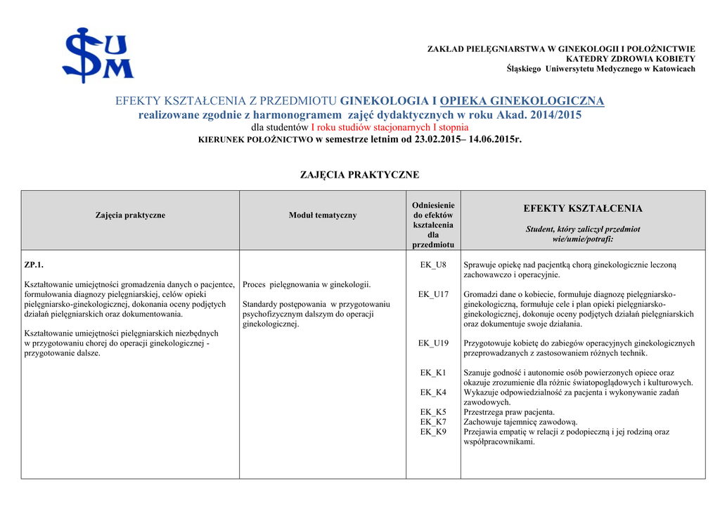 EFEKTY KSZTAŁCENIA Z PRZEDMIOTU GINEKOLOGIA I OPIEKA