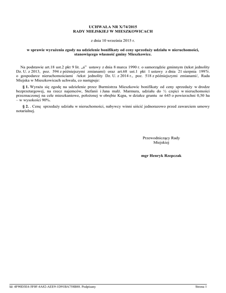 UCHWAŁA NR X/74/2015 RADY MIEJSKIEJ W MIESZKOWICACH z dnia 10 września 2015 r. w sprawie wyrażenia zgody na udzielenie bonifikaty od ceny sprzedaży udziału w nieruchomości, stanowiącego własność gminy Mieszkowice. Na podstawie art.18 ust.2 pkt 9 lit. „a” ustawy z dnia 8 marca 1990 r. o samorządzie gminnym (tekst jednolity Dz. U. z 2013, poz. 594 z późniejszymi zmianami) oraz art.68 ust.1 pkt 1 ustawy z dnia 21 sierpnia 1997r. o gospodarce nieruchomościami /tekst jednolity Dz. U. z 2014 r., poz. 518 z późniejszymi zmianami/, Rada Miejska w Mieszkowicach uchwala, co następuje: § 1. Wyraża się zgodę na udzielenie przez Burmistrza Mieszkowic bonifikaty od ceny sprzedaży w drodze bezprzetargowej, na rzecz najemców, Stefanii i Jana małż. Marmura, udziału do ½ części w nieruchomości przeznaczonej na cele mieszkaniowe, położonej w obrębie Kępa, w działce gruntu nr 645 o powierzchni 0,50 ha – w wysokości 90%. § 2. . Cenę sprzedaży udziału w nieruchomości, nabywcy winni uiścić jednorazowo przed zawarciem umowy notarialnej. Przewodniczący Rady Miejskiej mgr Henryk Rzepczak Id: 4F90D3E4-5F0F-4A82-AEE9-1D91BA758B88. Podpisany Strona 1 Uzasadnienie Państwo Stefania i Jan małż. Marmura, będący od roku 1995 najemcami udziału do ½ części w nieruchomości zabudowanej, szczegółowo opisanej w § 1 projektu uchwały, wystąpili z wnioskiem o jego nabycie . W uzasadnieniu wniosku wskazali, że przez okres najmu ponosili duże nakłady związane z remontem, między innymi zawalonego stropu w lokalu, co było spowodowane przeciekającym dachem. Pozostały udział w powyższej nieruchomości stanowi ich własność. Zgodnie art.68 ust.1 pkt 1 ustawy z dnia 21 sierpnia 1997r.o gospodarce nieruchomościami „właściwy organ może udzielić bonifikaty od ceny ustalonej zgodnie z art. 67 ust.3, na podstawie…uchwały rady… jeżeli nieruchomość jest sprzedawana na cele mieszkaniowe…” Id: 4F90D3E4-5F0F-4A82-AEE9-1D91BA758B88. Podpisany Strona 1