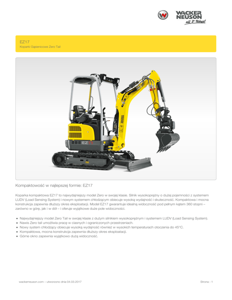 EZ17 Koparki Gąsienicowe Zero Tail Kompaktowość w najlepszej formie: EZ17 Koparka kompaktowa EZ17 to najwydajniejszy model Zero w swojej klasie. Silnik wysokoprężny o dużej pojemności z systemem LUDV (Load Sensing System) i nowym systemem chłodzącym obiecuje wysoką wydajność i skuteczność. Kompaktowa i mocna konstrukcja zapewnia dłuższy okres eksploatacji. Model EZ17 gwarantuje idealną widoczność pod pełnym kątem 360 stopni – zarówno w górę, jak i w dół – i oferuje wyjątkowe duże pole widoczności. Najwydajniejszy model Zero Tail w swojej klasie z dużym silnikiem wysokoprężnym i systemem LUDV (Load Sensing System). Nawis Zero tail umożliwia pracę w ciasnych i ograniczonych przestrzeniach. Nowy system chłodzący obiecuje wysoką wydajność również w wysokich temperaturach otoczenia do 45°C. Kompaktowa, mocna konstrukcja zapewnia dłuższy okres eksploatacji. Górne okno zapewnia wyjątkowo dużą widoczność. wackerneuson.com – utworzono dnia 04.03.2017 Strona : 1 Parametry techniczne parametry eksploatacyjne masa transportowa min. ciężar roboczy 1.595 kg 1.724 - 1.950 kg siła skrawania maks. 9,1 kN siła odspajania maks. 18,7 kN głębokość kopania maks. wysokość wysypu 2.486 mm 2 436 - 2 550 mm wysokość wysypu maks. 2.550 mm promień urabiania maks. 4.050 mm Prędkość obrotowa nadwozia dł. x szer. x wys. 9,4 1/min 3 584 x 990 x 2 362 mm parametry silnika producent silnika Yanmar typ silnika 3TNV76 silnik pojemność skokowa 3-cylindrowy silnik wysokoprężny chłodzony wodą 1.116 cm³ prędkość obrotowa 2.200 1/min moc silnika wg ISO 13,4 kW akumulator pojemność baku 30 Ah 22 l układ hydrauliczny pompa robocza wydajność pompy Pompa podwójna o zmiennej wydajności & pompa zębata podwójna 39,6 l/min ciśnienie robocze dla hydrauliki roboczej i trakcyjnej 240 bar ciśnienie robocze Mechanizm obrotu 150 bar zbiornik oleju hydraulicznego 21 l układ jezdny prędkość jazdy maks. 4,8 km/h szerokość gąsienicy 230 mm prześwit pojazdu 156 mm lemiesz wyrównujący szerokość 1.300 mm wysokość 230 mm wackerneuson.com – utworzono dnia 04.03.2017 Strona : 2 poziom ciśnienia akustycznego poziom ciśnienia akustycznego (LwA) wg 2000/14/WE 93 dB(A) poziom ciśnienia akustycznego w kabinie w LpA wg ISO 6394 79 dB(A) wackerneuson.com – utworzono dnia 04.03.2017 Strona : 3 Wymiary A wysokość B szerokość dachu operatora 885 mm B szerokość obrotowego nadwozia 990 mm B szerokość Szerokość podwozia, wsuniętego 1.300 mm C długość transportowa (krótkie ramię) 3.584 mm C długość transportowa (długie ramię) 3.551 mm D głębokość kopania maks. Maks. (krótkie ramię) 2.326 mm D głębokość kopania maks. Maks. (długie ramię) 2.486 mm E głębokość kopania pionowego Maks., pion. (krótkie ramię) 1.713 mm E głębokość kopania pionowego Maks., pion. (długie ramię) 1.863 mm wackerneuson.com – utworzono dnia 04.03.2017 2.362 mm Strona : 4 F wysokość rozwartej łyżki Maks. (krótkie ramię) 3.462 mm F wysokość rozwartej łyżki Maks. (długie ramię) 3.576 mm G wysokość wysypu maks. Maks. (krótkie ramię) 2.436 mm G wysokość wysypu maks. Maks. (długie ramię) 2.550 mm H promień urabiania maks. Maks. (krótkie ramię) 3.899 mm H promień urabiania maks. Maks. (długie ramię) 4.050 mm I Zasięg Maks., rozpiętość na ziemi (krótkie ramię) 3.848 mm I Zasięg Maks., rozpiętość na ziemi (długie ramię) 4.002 mm J promień zachodzenia tyłu nadwozia Min. 660 mm K przesunięcie boczne wysięgnika Maks., przesunięcie wysięgnika do środka łyżki, po prawej stronie 533 mm K przesunięcie boczne wysięgnika Maks., przesunięcie wysięgnika do środka łyżki, po lewej stronie 418 mm L wysokość podnoszenia Maks. lemiesz ponad ziemią 271 mm M głębokość skrawania gruntu Maks. lemiesz poniżej ziemi 390 mm N długość Całkowita gąsienica O kąt obrotu Maks., z prawej strony 57 ° P kąt obrotu Maks., z lewej strony 65 ° Q szerokość gąsienicy 230 mm -- rozstaw łyżka i głębokość lemiesza (krótkie ramię) 332 mm -- rozstaw łyżka i głębokość lemiesza (długie ramię) 260 mm R zasięg wysięgnika środek 1.627 mm -- zasięg wysięgnika po prawej stronie 1.519 mm -- zasięg wysięgnika po lewej stronie 1.372 mm -- wysokość Lemiesz wackerneuson.com – utworzono dnia 04.03.2017 1.607 mm 230 mm Strona : 5 Uwaga Należy pamiętać, że dostępność produktów może się różnić w zależności od kraju. Jest możliwe, że przedstawione informacje / produkty mogą nie być dostępne w Państwa kraju. Szczegółowe informacje na temat wydajności silnika znajdują się w instrukcji obsługi; rzeczywista moc urządzenia uwarunkowana jest konkretnymi warunkami eksploatacji. Z zastrzeżeniem zmian i pomyłek. Dotyczy również ilustracji. Copyright © 2017 Wacker Neuson SE. wackerneuson.com – utworzono dnia 04.03.2017 Strona : 6