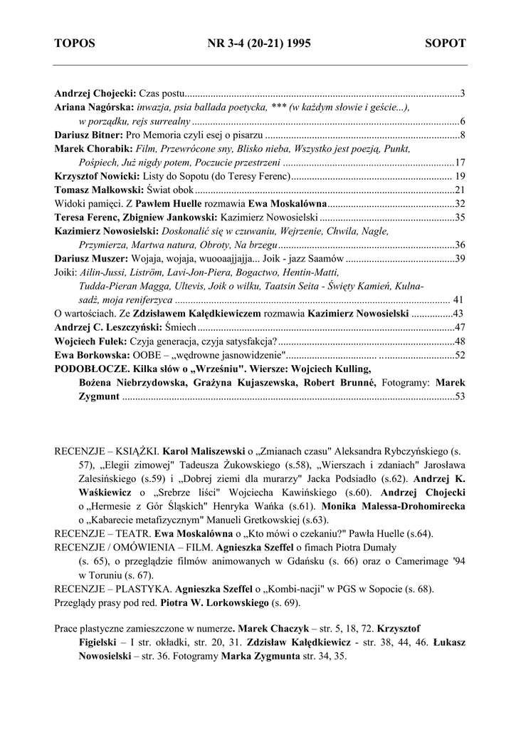 TOPOS NR 3-4 (20-21) 1995 SOPOT Andrzej Chojecki: Czas postu..........................................................................................................3 Ariana Nagórska: inwazja, psia ballada poetycka, *** (w każdym słowie i geście...), w porządku, rejs surrealny .......................................................................................................6 Dariusz Bitner: Pro Memoria czyli esej o pisarzu ...........................................................................8 Marek Chorabik: Film, Przewrócone sny, Blisko nieba, Wszystko jest poezją, Punkt, Pośpiech, Już nigdy potem, Poczucie przestrzeni ..................................................................17 Krzysztof Nowicki: Listy do Sopotu (do Teresy Ferenc) .............................................................. 19 Tomasz Małkowski: Świat obok ....................................................................................................21 Widoki pamięci. Z Pawłem Huelle rozmawia Ewa Moskalówna .................................................32 Teresa Ferenc, Zbigniew Jankowski: Kazimierz Nowosielski ....................................................35 Kazimierz Nowosielski: Doskonalić się w czuwaniu, Wejrzenie, Chwila, Nagle, Przymierza, Martwa natura, Obroty, Na brzegu ....................................................................36 Dariusz Muszer: Wojaja, wojaja, wuooaajjajja... Joik - jazz Saamów ..........................................39 Joiki: Ailin-Jussi, Liström, Lavi-Jon-Piera, Bogactwo, Hentin-Matti, Tudda-Pieran Magga, Ultevis, Joik o wilku, Taatsin Seita - Święty Kamień, Kulnasadż, moja reniferzyca .......................................................................................................... 41 O wartościach. Ze Zdzisławem Kałędkiewiczem rozmawia Kazimierz Nowosielski ................43 Andrzej C. Leszczyński: Śmiech ...................................................................................................47 Wojciech Fułek: Czyja generacja, czyja satysfakcja? ....................................................................48 Ewa Borkowska: OOBE – „wędrowne jasnowidzenie"................................... .. ...........................52 PODOBŁOCZE. Kilka słów o „Wrześniu". Wiersze: Wojciech Kulling, Bożena Niebrzydowska, Grażyna Kujaszewska, Robert Brunné, Fotogramy: Marek Zygmunt ................................................................................................................................53 RECENZJE – KSIĄŻKI. Karol Maliszewski o „Zmianach czasu" Aleksandra Rybczyńskiego (s. 57), „Elegii zimowej" Tadeusza Żukowskiego (s.58), „Wierszach i zdaniach" Jarosława Zalesińskiego (s.59) i „Dobrej ziemi dla murarzy" Jacka Podsiadło (s.62). Andrzej K. Waśkiewicz o „Srebrze liści" Wojciecha Kawińskiego (s.60). Andrzej Chojecki o „Hermesie z Gór Śląskich" Henryka Wańka (s.61). Monika Malessa-Drohomirecka o „Kabarecie metafizycznym" Manueli Gretkowskiej (s.63). RECENZJE – TEATR. Ewa Moskalówna o „Kto mówi o czekaniu?" Pawła Huelle (s.64). RECENZJE / OMÓWIENIA – FILM. Agnieszka Szeffel o fimach Piotra Dumały (s. 65), o przeglądzie filmów animowanych w Gdańsku (s. 66) oraz o Camerimage '94 w Toruniu (s. 67). RECENZJE – PLASTYKA. Agnieszka Szeffel o „Kombi-nacji" w PGS w Sopocie (s. 68). Przeglądy prasy pod red. Piotra W. Lorkowskiego (s. 69). Prace plastyczne zamieszczone w numerze. Marek Chaczyk – str. 5, 18, 72. Krzysztof Figielski – I str. okładki, str. 20, 31. Zdzisław Kałędkiewicz - str. 38, 44, 46. Łukasz Nowosielski – str. 36. Fotogramy Marka Zygmunta str. 34, 35.