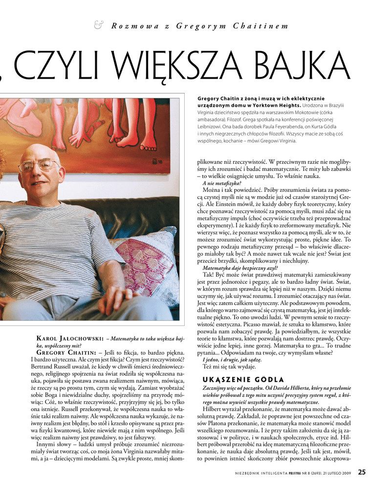 Rozmowa z Gregorym Chaitinem , czyli większa bajka Gregory Chaitin z żoną i muzą w ich eklektycznie urządzonym domu w Yorktown Heights. Urodzona w Brazylii Virginia dzieciństwo spędziła na warszawskim Mokotowie (córka ambasadora). Filozof. Grega spotkała na konferencji poświęconej Leibnizowi. Ona bada dorobek Paula Feyerabenda, on Kurta Gödla i innych niegrzecznych chłopców filozofii. Wszyscy macie ze sobą coś wspólnego, kochanie – mówi Gregowi Virginia. plikowane niż rzeczywistość. W przeciwnym razie nie moglibyśmy ich zrozumieć i badać matematycznie. Te mity lub zabawki – to wielkie osiągnięcie umysłu. To właśnie nauka. A nie metafizyka? Można i tak powiedzieć. Próby zrozumienia świata za pomocą czystej myśli nie są w modzie już od czasów starożytnej Grecji. Ale Einstein mówił, że każdy dobry fizyk teoretyczny, który chce poznawać rzeczywistość za pomocą myśli, musi zdać się na metafizyczny impuls (choć oczywiście trzeba też przeprowadzać eksperymenty). I że każdy fizyk to zreformowany metafizyk. Nie wierzysz więc, że poznasz wszystko za pomocą myśli, ale w to, że możesz zrozumieć świat wykorzystując proste, piękne idee. To pewnego rodzaju metafizyczny przesąd – bo właściwie dlaczego miałoby tak być? A może nawet tak wcale nie jest? Świat jest przecież brzydki, skomplikowany i niechlujny. Matematyka daje bezpieczny azyl? K A ROL J A Ł OCHOW SK I : – Matematyka to taka większa bajka, współczesny mit? G R EG ORY C H A I T I N : – Jeśli to fikcja, to bardzo piękna. I bardzo użyteczna. Ale czym jest fikcja? Czym jest rzeczywistość? Bertrand Russell uważał, że kiedy w chwili śmierci średniowiecznego, religijnego spojrzenia na świat rodziła się współczesna nauka, pojawiła się postawa zwana realizmem naiwnym, mówiąca, że rzeczy są po prostu tym, czym się wydają. Zamiast wyobrażać sobie Boga i niewidzialne duchy, spojrzeliśmy na przyrodę mówiąc: Cóż, to właśnie rzeczywistość, przyjrzyjmy się jej, bo tylko ona istnieje. Russell przekonywał, że współczesna nauka to właśnie taki realizm naiwny. Ale współczesna nauka wykazuje, że naiwny realizm jest błędny, bo stół i krzesło opisywane są przez prawa fizyki kwantowej, które niewiele mają z nim wspólnego. Jeśli więc realizm naiwny jest prawdziwy, to jest fałszywy. Innymi słowy – ludzki umysł próbuje zrozumieć niezrozumiały świat tworząc coś, co moja żona Virginia nazwałaby mitami, a ja – dziecięcymi modelami. Są zwykle proste, mniej skom- Tak! Być może świat prawdziwej matematyki zamieszkiwany jest przez jednorożce i pegazy, ale to bardzo ładny świat. Świat, w którym rozum sprawdza się lepiej niż w naszym. Dzięki niemu uczymy się, jak używać rozumu. I zrozumieć otaczający nas świat. Jest więc zatem całkiem użyteczny. Ale podstawowym powodem, dla którego warto zajmować się czystą matematyką, jest jej intelektualne piękno. To ono uwodzi ludzi. W pewnym sensie to rzeczywistość estetyczna. Picasso mawiał, że sztuka to kłamstwo, które pozwala nam zobaczyć prawdę. Ja powiedziałbym, że wszystkie teorie to kłamstwa, które pozwalają nam dostrzec prawdę. Oczywiście jedne lepiej, inne gorzej. Matematyka to gra... To trudne pytania... Odpowiadam na twoje, czy wymyślam własne? I jedno, i drugie, jak sądzę. Też mi się tak wydaje. Uk ąszenie Gödla Zacznijmy więc od początku. Od Davida Hilberta, który na przełomie wieków próbował z tego mitu uczynić precyzyjny system reguł, z którego można wywieść wszystkie prawdy matematyczne. Hilbert wyrażał przekonanie, że matematyka może dawać absolutną prawdę. Zakładał, że poprawne jest powszechne od czasów Platona przekonanie, że matematyka może stanowić model wszelkiego rozumowania. I że przy takim założeniu da się ją zastosować i w polityce, i w naukach społecznych, etyce itd. Hilbert próbował przerobić na ideę matematyczną filozoficzne przekonanie, że nauka daje absolutną prawdę. Jeśli tak jest, mówił, to powinien istnieć skończony zbiór powszechnie akceptowa- N I E Z B Ę D N I K I N T E L I G E N T A P O L I T Y K A NR 8 (2693), 21 LUTEGO 2009 25
