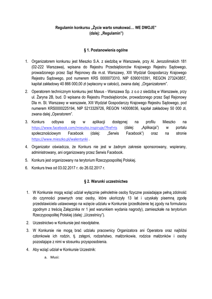 Regulamin konkursu „Życie warto smakować… WE DWOJE” (dalej: „Regulamin”) § 1. Postanowienia ogólne 1. Organizatorem konkursu jest Mieszko S.A. z siedzibą w Warszawie, przy Al. Jerozolimskich 181 (02-222 Warszawa), wpisana do Rejestru Przedsiębiorców Krajowego Rejestru Sądowego, prowadzonego przez Sąd Rejonowy dla m.st. Warszawy, XIII Wydział Gospodarczy Krajowego Rejestru Sądowego, pod numerem KRS 0000073310, NIP 6390010391, REGON 273243857, kapitał zakładowy 40 866 000,00 zł (wpłacony w całości), zwana dalej „Organizatorem”. 2. Operatorem technicznym konkursu jest Maxus - Warszawa Sp. z o.o z siedzibą w Warszawie, przy ul. Żaryna 2B, bud. D wpisana do Rejestru Przedsiębiorców, prowadzonego przez Sąd Rejonowy Dla m. St. Warszawy w warszawie, XIII Wydział Gospodarczy Krajowego Rejestru Sądowego, pod numerem KRS0000225194, NIP 5213329726, REGON 140008036, kapitał zakładowy 50 000 zł, zwana dalej „Operatorem”. 3. Konkurs odbywa się w aplikacji dostępnej na profilu Mieszko na https://www.facebook.com/mieszko.inspiruje/?fref=ts (dalej: „Aplikacja”) w portalu społecznościowym Facebook (dalej: „Serwis Facebook”) oraz na stronie https://www.mieszko.pl/walentynki . 4. Organizator oświadcza, że Konkurs nie jest w żadnym zakresie sponsorowany, wspierany, administrowany, ani organizowany przez Serwis Facebook. 5. Konkurs jest organizowany na terytorium Rzeczypospolitej Polskiej. 6. Konkurs trwa od 03.02.2017 r. do 26.02.2017 r. § 2. Warunki uczestnictwa 1. W Konkursie mogą wziąć udział wyłącznie pełnoletnie osoby fizyczne posiadające pełną zdolność do czynności prawnych oraz osoby, które ukończyły 13 lat i uzyskały pisemną zgodę przedstawiciela ustawowego na wzięcie udziału w Konkursie (przedłożenie tej zgody na formularzu zgodnym z treścią Załącznika nr 1 jest warunkiem wydania nagrody), zamieszkałe na terytorium Rzeczypospolitej Polskiej (dalej: „Uczestnicy”). 2. Uczestnictwo w Konkursie jest nieodpłatne. 3. W Konkursie nie mogą brać udziału pracownicy Organizatora ani Operatora oraz najbliżsi członkowie ich rodzin, tj. zstępni, rodzeństwo, małżonkowie, rodzice małżonków i osoby pozostające z nimi w stosunku przysposobienia. 4. Aby wziąć udział w Konkursie Uczestnik: a. Musi: i. posiadać swój profil Serwisie Facebook (jeżeli Uczestnik nie posiada jeszcze profilu w Serwisie Facebook, konieczna jest rejestracja poprzez stronę główną pod adresem http://www.facebook.com) lub ii. posiadać swój publiczny profil na Instagramie lub iii. skorzystać z Aplikacji oraz b. musi wykonać zadanie konkursowe, o którym mowa w § 3 Regulaminu. § 3. Przebieg Konkursu 1. W pierwszym dniu trwania Konkursu Organizator opublikuje w Aplikacji zadanie konkursowe: „Życie warto smakować…WE DWOJE z produktami od Mieszko! Pokaż jak wspólnie ze swoją ukochaną osobą smakujecie życie we dwoje i zrób zdjęcie z jednym z zakupionych produktów Mieszko: Amoretta, Chocoladorro, Cherrisimo. Na zdjęciu musi znaleźć się produkt. Zachowaj paragon w celu weryfikacji. Zdjęcie możesz dodać poprzez aplikację bądź wrzucić je na Instagram oraz wykorzystaj następujące #tagi: #zyciewartosmakowac #wedwoje #mieszko oraz oznacz profil @mieszko_inspiruje”. 2. Po opublikowaniu zadania konkursowego zgodnie z ust. 1 powyżej, przez cały czas trwania Konkursu, Uczestnicy mogą dodawać w Aplikacji swoje zdjęcia albo linki do swoich zdjęć zamieszczonych na Instagramie otagowanych każdym z następujących tagów: #zyciewartosmakowac #wedwoje #mieszko @mieszko_inspiruje (dalej: „Odpowiedzi”). Zdjęcie musi zawierać wizerunek dwóch osób oraz opakowanie przynajmniej jednego z następujących produktów Organizatora: Amoretta, Chocoladorro, Cherrisimo. 3. Odpowiedzi powinny być wolne od wulgaryzmów i treści powszechnie uznanych za obraźliwe, a także od treści o charakterze pornograficznym lub mogących obrazić uczucia lub przekonania innych osób, bądź naruszających prawa osób trzecich (w tym w szczególności dóbr osobistych i praw autorskich). 4. Zgłaszając na Konkurs Odpowiedź, Uczestnik udziela Organizatorowi i Operatorowi nieodpłatnej licencji niewyłącznej na wykorzystanie Odpowiedzi (oraz utrwalonego w niej wizerunku Uczestnika oraz innej osoby) na następujących zasadach: a. pola eksploatacji: Internet, b. okres: 5 lat, c. terytorium: bez ograniczeń. 5. Uczestnik może zgłosić zdjęcie do Konkursu tylko wtedy, gdy uzyskał zgodę na rozpowszechnianie wizerunku innej osoby utrwalonej na zdjęciu w zakresie określonym w ust. 4 niniejszego paragrafu. § 4. Nagrody 1. Odpowiedzi zostaną poddane ocenie komisji konkursowej składającej się z przedstawicieli Organizatora (dalej: „Komisja”): 2. Komisja, spośród Odpowiedzi zgłoszonych na Konkurs, wybierze 40 Odpowiedzi, które w ocenie Komisji najlepiej realizują temat określony w zadaniu konkursowym. Uczestnicy, którzy zgłosili na Konkurs wybrane przez Komisję Odpowiedzi (dalej: „Zwycięzcy”) otrzymają nagrody: a. 10 Uczestników, którzy zgłosili najlepsze - według Komisji – Odpowiedzi - voucher o wartości 1045 złotych, dla dwóch osób na 1 nocleg oraz zabiegi, do wykorzystania w SPA u Dr Irena Ersi w jednym z trzech ośrodków do wyboru : Polanica Zdrój (południowy zachód Polski), Krynica Zdrój (południe, południowy-wschód Polski), Wzgórza Dylewskie (północ, centrum Polski). Termin realizacji voucheru do 20 grudnia 2017 roku z wyłączeniem dni świątecznych. Przed odbyciem wizyty należy potwierdzić termin przybycia bezpośrednio z wybranym ośrodkiem SPA. b. Kolejnych 30 Uczestników, którzy zgłosili kolejne najlepsze - według Komisji – Odpowiedzi – kosz słodyczy Mieszko o wartości 100 złotych. 3. Każdy Zwycięzca otrzyma dodatkową nagrodę pieniężną w wysokości określonej przepisami prawa, które nie zostanie wydana Zwycięzcy i zostanie przeznaczona przez Organizatora
