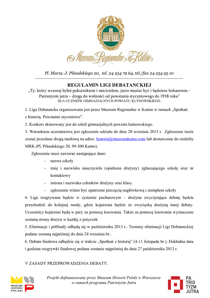 Pl. Marsz. J. Piłsudskiego 20, tel. 24 254 79 64, tel./fax 24 254 95 10 REGULAMIN LIGI DEBATANCKIEJ „Ty, który wczoraj byłeś pokutnikiem i mścicielem, jutro musisz być i będziesz bohaterem Patriotyzm jutra – droga do wolności od powstania styczniowego do 1918 roku” DLA UCZNIÓW GIMNAZJALNYCH POWIATU KUTNOWSKIEGO. 1. Liga Debatancka organizowana jest przez Muzeum Regionalne w Kutnie w ramach „Spotkań z historią. Powstanie styczniowe”. 2. Konkurs skierowany jest do szkół gimnazjalnych powiatu kutnowskiego. 3. Warunkiem uczestnictwa jest zgłoszenie udziału do dnia 20 września 2013 r. Zgłoszenie może zostać przesłane drogą mailową na adres: [email protected] lub dostarczone do siedziby MRK (Pl. Piłsudskiego 20, 99-300 Kutno). Zgłoszenie musi zawierać następujące dane: - nazwa szkoły - imię i nazwisko nauczyciela (opiekuna drużyny) zgłaszającego szkołę oraz nr kontaktowy - imiona i nazwiska członków drużyny oraz klasy - zgłoszenie winno być opatrzone pieczęcią nagłówkową i stemplem szkoły 4. Liga rozgrywana będzie w systemie pucharowym – drużyna zwyciężająca debatę będzie przechodzić do kolejnej rundy, gdzie kojarzona będzie ze zwycięską drużyną innej debaty. Uczestnicy kojarzeni będą w pary za pomocą losowania. Także za pomocą losowania wyznaczone zostaną strony drużyn w każdej z potyczek. 5. Eliminacje i półfinały odbędą się w październiku 2013 r.. Terminy eliminacji Ligi Debatanckiej podane zostaną najpóźniej do dnia 24 września br.. 6. Debata finałowa odbędzie się w trakcie „Spotkań z historią” (4-11 listopada br.). Dokładna data i godzina rozgrywki finałowej podana zostanie najpóźniej do dnia 27 października 2013 r. V ZASADY PRZEPROWADZENIA DEBATY. Projekt dofinansowany przez Muzeum Historii Polski w Warszawie w ramach programu Patriotyzm Jutra Pl. Marsz. J. Piłsudskiego 20, tel. 24 254 79 64, tel./fax 24 254 95 10 1. Dyskutują ze sobą dwie pięcioosobowe drużyny. 2. Pierwsza osoba przedstawia członków drużyny i ogólny zarys argumentacji. Trzy kolejne osoby początek swojej wypowiedzi powinny poświęcić na ustosunkowanie się do argumentów drużyny przeciwnej. Następnie rozwijają szczegółowo merytoryczne płaszczyzny: - Klęska czy chwała – próba oceny powstania styczniowego (kwestie społeczne, militarne, polityczne, tajne państwo – jego działalność) - Lojalni obywatele czy romantyczni mściciele lub pozytywni desperaci. Postawy Polaków (między Wielopolskim – czerwonymi i białymi) - Pokłosie - skutki powstania Piąty mówca ustosunkowuje się do argumentów drużyny przeciwnej i podsumowuje wypowiedź drużyny. Czas mówców jest ograniczony do 4 min. dla pierwszego i ostatniego mówcy, zaś dla środkowych do 3 min. 3. Uczestnicy debaty wypowiadają się bez pomocy kartek i mogą korzystać z materiałów statystycznych i wykresów, które musi otrzymać również drużyna przeciwna. Materiały te muszą być opatrzone źródłem, z którego pochodzą. 4. W trakcie debaty między członkami tej samej drużyny dopuszczalna jest komunikacja niewerbalna w postaci kartek. VI REGUŁY OCENIANIA 1. Sędziowie będą oceniali: - Rzeczowość argumentacji (w skali od 1 do 10 pkt.) - Logikę wypowiedzi drużyny (w skali od 1 do 10 pkt.) - Przestrzeganie czasu (w skali od 1 do 10 pkt.) - Umiejętność kontrargumentacji (w skali od 1 do 10 pkt.) Projekt dofinansowany przez Muzeum Historii Polski w Warszawie w ramach programu Patriotyzm Jutra Pl. Marsz. J. Piłsudskiego 20, tel. 24 254 79 64, tel./fax 24 254 95 10 - Stylistykę wypowiedzi (w skali od 1 do 10 pkt.) 2. Punkty będą przyznawane drużynie, a nie poszczególnym uczestnikom. 3. Z każdej debaty zostanie wytypowany najlepszy mówca. 5. Do następnego etapu przechodzi drużyna, która uzyska większą ilość punktów. 6. Debata finałowa pomiędzy dwoma najlepszymi drużynami eliminacyjnymi odbędzie się z udziałem publiczności i mediów. - Zasady sędziowania pozostaną bez zmian. VII NAGRODY. Dla uczestników debaty finałowej przewidziane są cenne nagrody. Nagrodzona zostanie również szkoła, którą będzie reprezentowała zwycięska drużyna. VIII PRZYKŁADOWA LITERATURA: - Polityka. Pomocnik Historyczny, Powstanie styczniowe 1863, wydanie specjalne 1/2013 - Halicz, Emanuel. Demokracja polska w powstaniu styczniowym / wybór źródeł oprac. E. Halicz, I.Kobeszlowa, I. Radtke. Wrocław : Zakład Narodowy im. Ossolińskich, 1961. - Łubieński, Tomasz, Bić się czy nie bić ? : o polskich powstaniach, [Wyd.3]. Kraków : Wydawnictwo Literackie, 1989 - Ćwiek, Zbigniew. Przywódcy powstania styczniowego : sześć sylwetek, Warszawa : "Wiedza Powszechna", 1963 - Kieniewicz, Stefan. Trzy powstania narodowe : kościuszkowskie, listopadowe, styczniowe; pod red. Władysława Zajewskiego. Wyd. 2 popr. i uzup. Warszawa : "Książka i Wiedza", 1994 Projekt dofinansowany przez Muzeum Historii Polski w Warszawie w ramach programu Patriotyzm Jutra Pl. Marsz. J. Piłsudskiego 20, tel. 24 254 79 64, tel./fax 24 254 95 10 - Kieniewicz, Stefan. Warszawa w powstaniu styczniowym, Wyd. 3. Warszawa : "Wiedza Powszechna", 1965. - Kieniewicz, Stefan. Powstanie styczniowe, Wyd. 2. Warszawa : Państwowe Wydawnictwo Naukowe, 1983 - Dzieje narodu i państwa polskiego; III-49 Kieniewicz, Stefan. Powstanie styczniowe, Warszawa : Krajowa Agencja Wydawnicza, 1987 - Piłsudski, Józef. Rok 1863; wstęp i oprac. Stefan Kieniewicz. Warszawa : "Książka i Wiedza", 1989. - Powstanie Styczniowe 1863-1864 : wrzenie, bój, Europa, wizje / pod red. Sławomira Kalembki ; [przedm. Stefan Kieniewicz]. Warszawa : Państwowe Wydawnictwo Naukowe, 1990 - Rzadkowska, Helena, Marian Langiewicz, Warszawa : Państwowe Wydawnictwo Naukowe, 1967 - Skąpski, Antoni. Nadziei promienie : pamiętniki z XIX wieku; wstęp, opracowanie tekstu, komentarz Józef Pociecha. Wyd. 2. Kraków : Wydawnictwo Literackie, 1981. - Strumph-Wojtkiewicz, Stanisław. P