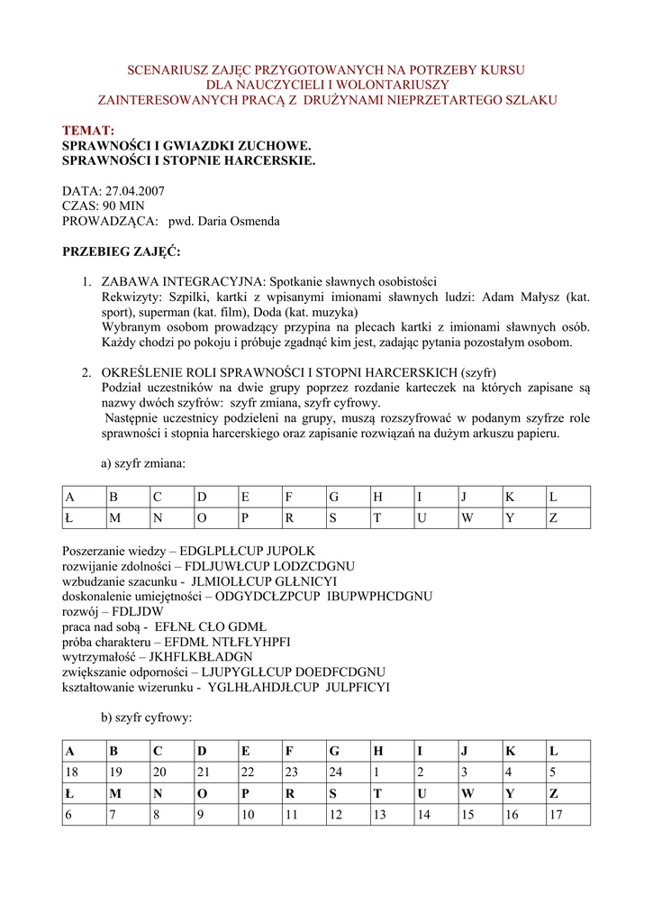 SCENARIUSZ ZAJĘC PRZYGOTOWANYCH NA POTRZEBY KURSU DLA NAUCZYCIELI I WOLONTARIUSZY ZAINTERESOWANYCH PRACĄ Z DRUŻYNAMI NIEPRZETARTEGO SZLAKU TEMAT: SPRAWNOŚCI I GWIAZDKI ZUCHOWE. SPRAWNOŚCI I STOPNIE HARCERSKIE. DATA: 27.04.2007 CZAS: 90 MIN PROWADZĄCA: pwd. Daria Osmenda PRZEBIEG ZAJĘĆ: 1. ZABAWA INTEGRACYJNA: Spotkanie sławnych osobistości Rekwizyty: Szpilki, kartki z wpisanymi imionami sławnych ludzi: Adam Małysz (kat. sport), superman (kat. film), Doda (kat. muzyka) Wybranym osobom prowadzący przypina na plecach kartki z imionami sławnych osób. Każdy chodzi po pokoju i próbuje zgadnąć kim jest, zadając pytania pozostałym osobom. 2. OKREŚLENIE ROLI SPRAWNOŚCI I STOPNI HARCERSKICH (szyfr) Podział uczestników na dwie grupy poprzez rozdanie karteczek na których zapisane są nazwy dwóch szyfrów: szyfr zmiana, szyfr cyfrowy. Następnie uczestnicy podzieleni na grupy, muszą rozszyfrować w podanym szyfrze role sprawności i stopnia harcerskiego oraz zapisanie rozwiązań na dużym arkuszu papieru. a) szyfr zmiana: A B C D E F G H I J K L Ł M N O P R S T U W Y Z Poszerzanie wiedzy – EDGLPLŁCUP JUPOLK rozwijanie zdolności – FDLJUWŁCUP LODZCDGNU wzbudzanie szacunku - JLMIOLŁCUP GLŁNICYI doskonalenie umiejętności – ODGYDCŁZPCUP IBUPWPHCDGNU rozwój – FDLJDW praca nad sobą - EFŁNŁ CŁO GDMŁ próba charakteru – EFDMŁ NTŁFŁYHPFI wytrzymałość – JKHFLKBŁADGN zwiększanie odporności – LJUPYGLŁCUP DOEDFCDGNU kształtowanie wizerunku - YGLHŁAHDJŁCUP JULPFICYI b) szyfr cyfrowy: A B C D E F G H I J K L 18 19 20 21 22 23 24 1 2 3 4 5 Ł M N O P R S T U W Y Z 6 7 8 9 10 11 12 13 14 15 16 17 Spostrzegawczość - 12 10 9 12 13 11 17 22 24 18 15 20 17 9 12 20 logiczne myślenie – 5 9 24 2 20 17 8 22 7 16 12 5 22 8 2 22 eliminowanie wad -22 5 2 7 2 8 9 15 18 8 2 22 15 18 21 wzmacnianie zalet – 15 17 7 18 20 8 2 18 8 2 22 17 18 5 22 13 pomoc drugiemu człowiekowi - 10 9 7 9 20 21 11 14 24 2 22 7 14 20 17 6 9 15 2 22 4 9 15 2 wytrwałość – 15 16 13 11 15 18 6 9 12 20 rozbudzanie zainteresowań - 11 9 17 19 14 21 17 18 8 2 22 17 18 2 8 13 22 11 22 12 9 15 18 8 eliminowanie pokus - 22 5 2 7 2 8 9 15 18 8 2 22 10 9 4 14 12 kształtowanie postaw - 4 12 17 13 18 6 13 9 15 18 8 2 22 10 9 12 13 18 15 zaangażowanie - 17 18 18 8 24 18 17 9 15 18 8 2 22 3. PRZERYWNIK MUZYCZNY 4. ETAPY ZDOBYWANIA SPRAWNOŚCI ZUCHOWYCH, GWIAZDEK I STOPNI - rozsypanka wyrazowa podział na dwie grupy – kartki w czterech kolorach papieru HARCERSKICH, a) etapy zdobywania sprawności harcerskich: - Wybór sprawności i zapoznanie się z programem - Ułożenie zadań, przygotowanie karty próby - Wykonanie zadań - Informacja o wykonaniu zadań i oddanie wypełnionej karty próby - Podjęcie decyzji o przyznaniu sprawności - Ogłoszenie w rozkazie zdobycia sprawności b) zdobywanie sprawności zuchowych: - Wybór sprawności i zapoznanie się z programem - Wspólne ustalenie z drużynowym zadań do wykonania - Wykonanie zadań - Prezentacja na zbiórce wybranych zadań - Podjęcie w Kręgu Rady decyzji o przyznaniu sprawności - Obrzędowe nadanie sprawności z wręczeniem znaczka c) etapy zdobywanie gwiazdek zuchowych: - poznanie i zrozumienie Prawa Zucha; - złożenie obietnicy zuchowej; - zapoznanie się z programem danej gwiazdki; - ułożenie zadań i przygotowanie karty próby; - wykonanie zadań; - oddanie karty próby drużynowemu; - podjęcie w Kręgu Rady decyzji o przyznaniu gwiazdki; - uroczyste wręczenie gwiazdki po powtórzeniu przez zucha obietnicy zuchowej; - uwiecznienie w księdze gromady i książeczce zucha faktu zdobycia gwiazdki; d) etapy zdobywania stopni harcerskich: - poznanie i zrozumienie Prawa Harcerskiego; - Złożenie Przyrzeczenia Harcerskiego; - zapoznanie się z programem danego stopnia; - ułożenie zadań i przygotowanie karty próby; - realizacja zadań; - oddanie wypełnionej karty próby drużynowemu; - przyznanie stopnia harcerskiego przez: w drużynie harcerskiej – drużynowy przy współudziale rady drużyny, w drużynie starszoharcerskiej – rada drużyny, w drużynie wędrowniczej – członkowie drużyny zgodnie z konstytucją drużyny; - ogłoszenie w rozkazie zdobycia stopnia; 5. ZABAWA NA ROZLUŹNIENIE - zwierzaki Rekwizyty: papier z zapisanymi nazwami zwierząt Wszyscy stają w kręgu. Osoba prowadząca wręcza każdemu kartkę, na której napisana jest nazwa zwierzęcia. Wszyscy próbują naśladować głosy tych zwierząt i starają się, chodząc po pokoju, znaleźć drugą osobę, która wydaje odgłosy takie jak oni (czyli takie s samo zwierzę). 6. JAK TO ZROBIĆ PRACA Z KARTAMI PRÓBY NA SPRAWNOŚCI ZUCHOWE , HARCERSKIE, GWIAZDKI ZUCHOWE I STOPNIE HARCERSKIE. Podział zespołu na 3 grupy – zuchy , harcerze i harcerze starsi, poprzez wręczenie uczestnikom symboli gwiazdek zuchowych i stopni harcerskich. Zadaniem uczestników jest takie dobranie się w grupy aby ich symbol zgadzał się z pionem wiekowym. Następnie ma miejsce praca w grupach; a) zuchy - zadania: charakterystyka pionu wiekowego zuchów; (1 koperta-zadania z lukami) przedstawienie wymagań na poszczególne gwiazdki; (3 koperty – szyfr ramka, ga-de-ry, ułamkowy); właściwe dobranie zadań w karcie próby na daną gwiazdkę; (3 koperty – paski ze zdaniami) odpowiednie ułożenie i przedstawienie karty próby na sprawność; ( 1 koperta) b) harcerze zadania: charakterystyka pionu wiekowego harcerzy; (1 koperta – zdania z lukami) przedstawienie wymagań na poszczególne stopnie; (2 koperty – szyfr liczbowy,litwa) właściwe dobranie zadań w karcie próby na dany stopień (2 koperty – paski z zadaniami) dobór zadań do wymogów na daną sprawność; ( 1 koperta) c) harcerze starsi – zadania: charakterystyka pionu wiekowego harcerzy starszych ; (1 koperta – zdania z lukami) przedstawienie wymagań na poszczególne stopnie; (2 koperty – koniecmatury, właściwe dobranie zadań w karcie próby na dany stopień (2 koperty- paski z zada