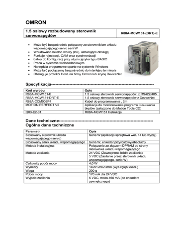 OMRON 1.5 osiowy rozbudowany sterownik serwonapędów • • • • • • • • R88A-MCW151-(DRT)-E Może być bezpośrednio połączony ze sterownikiem układu wspomagającego servo serii W Wbudowane lokalne we/wy (I/O), ułatwiające obsługę Funkcje rejestracji, CAM oraz synchronizacji Łatwy do konfiguracji przy użyciu języka typu BASIC Praca w systemie wielozadaniowym Narzędzia programowe oparte na systemie Windows Może być podłączony bezpośrednio do interfejsu terminala Obsługuje protokół HostLink firmy Omron lub szynę DeviceNet Specyfikacja------------------------------------------------------------------------Kod wyrobu R88A-MCW151-E R88A-MCW151-DRT-E R88A-CCM002P4 MOTION PERFECT V2 I203-E2-01 Opis 1.5 osiowy sterownik serwonapędów. z RS422/485 1.5 osiowy sterownik serwonapędów z DeviceNet Kabel do programowania , 2m Aplikacja do monitorowania programu i usu-wania błędów (załączone do Motion Tools CD) R88A-MCW151 Instrukcja Dane techniczne------------------------------------------------------------------Ogólne dane techniczne Parametr Stosowany sterownik układu wspomagającego (servo) Stosowany silnik układu wspomagającego Metoda instalacyjna: Metoda zasilania Całkowity pobór mocy Wymiary Waga Pobór mocy Wyjście zasilania Opis Seria W (aplikacja sprzętowa wer. 14 lub wyżej) Seria W, enkoder przyrostowy/absolutny Połączenie ze złączem DPRAM od strony sterownika układu wspomagającego 24 VDC (Zewnętrzne źródło zasilania) 5 VDC (Zasilanie przez sterownik układu wspomagającego, seria W) 4,0 W 142x128x20mm (wys.xgłęb.xszer.) 200 g 170 mA dla 24 VDC 5 VDC, maks.160 mA (do enkodera zewnętrznego) Dane techniczne dotyczące środowiska Parametr Środowisko Temperatura otoczenia (robocza) Temperatura otoczenia (składowanie) Wilgotność otoczenia robocza/składowanie Odporność na wibracje Odporność na udar Opis Wolne od gazów korodujących i wybuchowych Dobra wentylacja Wolne od pyłu i wilgoci 0 … +55 °C -20 … +75 °C <90% RH lub mniej (bez kondensacji) 0.5G (4.9 m/s2) 2G (19.6 m/s2) Dane techniczne dotyczące działania Parametr Całkowita ilość osi Oś sterowana przez sterownik układu wspomagającego Maks. ilość osi wejścia lub wyjścia Maks. ilość osi wirtualnych Cykl pętli układu wspomagającego Wejścia rejestracyjne Jednostki pomiarowe Funkcje autodiagnostyczne Programowanie Język programowania Liczba zadań Maks. ilość programów Pamięć do dyspozycji programów użytkownika Pojemność pamięci danych Zapisywanie danych programu, sterownik serwonapędów Zapisywanie danych programu, sterownik serwonapędów Sterowanie ruchem Sterowanie szybkością Sterowanie momentem obrotowym Przełącznik sterujący Operacje pozycjonowania Krzywe przyspieszania/hamowania Opis 3 1 1 2 Wybierany do 0.5 ms lub 1.0 ms. 2x moduł MCW151 dla osi wejścia enkodera 1x sterownik W dla osi układu wspomagającego Definiowane przez użytkownika Wykrywanie błędów pamięci przy użyciu sumy kontrolnej Wykrywanie błędu przepełnienia licznika BASIC Do 3 zadań obsługiwanych jednocześnie plus zadanie z wiersza poleceń 14 128KB 251 (VR) + 8000 (tabela) Pamięć o dostępie swobodnym (RAM) oraz zapasowa pamięć błyskowa (Flash) Aplikacja Motion Perfect zarządza kopią zapasową na dysku twardym komputera. Zależna pętla zamknięta z PID, szybkość wyjściowa oraz przyrost szybkości do przodu Szybkość referencyjna (otwarta pętla) Możliwość ograniczenia momentu obrotowego Referencyjny moment obrotowy (otwarta pętla) Możliwość ograniczenia szybkości Przełączanie sterowania funkcji szybkość / moment obrotowy Interpolacja liniova Interpolacja kołowa Przesunięcie profilu CAM Łącze przekładni elektronicznej Przesunięcie połączonego profilu CAM Przesunięcie połączone dla dowolnych dwóch osi Osie dodające Krzywa trapezowa lub krzywa S Dostęp sterownika układu wspomagającego Sterowanie ruchem Sterowanie szybkością Sterowanie momentem obrotowym Sprzężenie zwrotne położenia Sterownik aktywny Rejestracja druku sterownika Monitorowanie Stan alarmowy i ostrzegawczy sterownika Ogólny stan sterownika Wejście cyfrowe sterownika Wejście analogowe sterownika Włączniki ograniczające sterownika Sterowanie ogólne Kasowanie alarmu sterownika Kasowanie sterownika Dostęp do parametrów Parametry odczytu i zapisu Pn Parametry odczytu Un Dane techniczne we/wy (I/O) Wejścia cyfrowe Parametr Liczba wejść Opis 8 Maks. napięcie wejściowe 24 VDC +10% Izolacja galwaniczna Typ Pomiędzy we/wy (I/O) i innymi częściami systemu oraz pomiędzy wejściami i wyjściami NPN lub PNP Impedancja wejściowa 3.3 KΩ Prąd sygnału wejściowego Napięcie “ON” 7 mA przy 24VDC Napięcie “OFF” 1 V maks. Czas reakcji wejścia Okres dla układu wspomagającego Wysoki priorytet zadania Wysoki priorytet zadania 2 Ilość wejść rejestracyjnych Czas reakcji wejścia rejestracyjnego 11 V min. 0,5 ms 1,0 ms 1.8 ms (maks.) 2,8 ms (maks.) 2,3 ms (maks.) 3,3 ms (maks.) Wejście cyfrowe I0/R0 oraz I1/R1 (zbocze ON) Wejście cyfrowe I0/R0 oraz I1/R1 (zbocze OFF) Znacznik Z (zbocze ON) Znacznik Z (zbocze OFF) 50 µs 150 µs 2 µs 2 µs Wyjścia cyfrowe Parametr Ilość wyjść Opis 6 Maks. napięcie 24 VDC +10% Izolacja galwaniczna Typ Pomiędzy we/wy (I/O) i innymi częściami systemu oraz pomiędzy wejściami i wyjściami PNP Pojemność prądowa 100 mA każde wyjście (600 mA całkowita wartość dla 6) Napięcie “On” 11 V min. Napięcie “OFF” 1 V maks. Czas reakcji wyjścia Okres układu wspomagającego 0.5 ms 0,8 ms (maks.) Okres układu wspomagającego 1 ms 1,3 ms (maks.) Prądowe, temperaturowe oraz bezpiecznik 2A na wejściu wspólnym Zabezpieczenia Wejścia enkodera Parametr Liczba wejść enkodera Opis 1 Sygnały enkodera: A(+), A(-), B(+), B(-), Z(+), Z(-) Poziom sygnału Standardy EIA RS-422A (sterownik linii) Impedancja wejściowa 48 KΩ min Częstotliwość reakcji 1500 kps (6000 kcps) Rezystancja obci