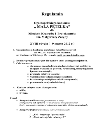 Regulamin Ogólnopolskiego konkursu „ MAŁA PĘTELKA” dla Młodych Krawców i Projektantów im. Małgorzaty Zaręby XVIII edycja ( 9 marca 2012 r.) 1. Organizatorem konkursu jest Zespół Szkół OdzieŜowych im. WŁ. St. Reymonta w Poznaniu ul. Kazimierza Wielkiego 17, e-mail: zso@ poznan.interklasa.pl. 2. Konkurs przeznaczony jest dla uczniów szkół ponadgimnazjalnych. 3. Cele konkursu: • stwarzanie szans ludziom młodym, twórczym i ambitnym, chcącym wykazać się polotem, wyobraźnią, dobrym gustem i poczuciem estetyki, • promocja młodych talentów, • wymiana doświadczeń między szkołami, • kształcenie przedsiębiorczości i kreatywności, • promowanie mody młodzieŜowej. 4. Konkurs odbywa się w 2 kategoriach: • ubiór, • fryzura, Uwaga! • Kategoria ubiór moŜe być prezentowana w wersji awangardowej lub uŜytkowej ( w zaleŜności od decyzji projektanta). Stroje awangardowe mogą być wykonane z materiałów niekonwencjonalnych. • Kategoria fryzura przewidziana jest w dwóch tematach: 1. „Kok - inspiracja i prowokacja” 2. „Kontrast – styl dla odwaŜnych” 5. Kolekcje muszą składać się z minimum: • dla kategorii „ubiór” – 3 modeli, • dla kategorii „ fryzura” – 1 modelu, 6. Zgłoszenie dla kategorii ubiór powinno zawierać: • projekty rysunkowe modeli: - wykonane na arkuszu A4, - Ŝurnalowe lub modelowe, - w kolorze. • informacje o kolekcji i autorze ( według załącznika). 7. Autor we własnym zakresie przygotowuje aranŜację pokazu. Czas pokazu nie moŜe przekroczyć: • dla 3 modeli – 2 minut, 8. Jury powołane przez organizatorów konkursu oceniać będzie: pomysł, kolorystykę, zharmonizowanie całości, wizjonerstwo, zgodność z trendami mody, ciekawą formę prezentacji. Autorom najlepszych prac przyznane zostaną „Małe Pętelki” i nagrody rzeczowe. 9. Podczas prezentacji nagrodzonych kolekcji poza szkołą organizatorzy zastrzegają sobie prawo do zmiany aranŜacji i doboru modelek. 10. Organizatorzy mogą uniewaŜnić przyznaną nagrodę w przypadku udowodnienia plagiatu lub niedopełnienia wymogów regulaminowych. 11. W sprawach nienormowanych niniejszym regulaminem decyzje podejmuje przewodnicząca konkursu dyr ZSO GraŜyna Łakomiec. 12. Wszelkich informacji udziela organizatorka konkursu p.Iwona Hryncewicz. Ostateczny termin zgłoszeń (zał. 2,3) 20 lutego 2012 r. Z przyczyn organizacyjnych prosimy o przesłanie muzyki do kolekcji na poniŜszy adres mailowy. Zgłoszenia przyjmuje p. I. Hryncewicz osobiście, lub listownie na adres szkoły z dopiskiem „ MAŁA PĘTELKA”. Wstępne zgłoszenie do dnia 20 grudnia (zał. 1) Nazwa, adres, telefon szkoły ……………………………………………………………………………………………………… ……………………………………………………………………………………………………… ………...…………………………………………………….……………………………………… ……………….………………………………... 1) Orientacyjna liczba kolekcji- ubiór: ............................................. Orientacyjna liczba modeli: ............................................................. 2) Orientacyjna liczba kolekcji-fryzury: ........................................... Orientacyjna liczba modeli: ........................................................... 3) Orientacyjna liczba fryzur (pojedyncze):....................................... Zgłoszenie końcowe do dnia 20 lutego- ubiór (zał.2) 1. Nazwa, adres, telefon szkoły ............................................................................. ............................................................................................................................ ............................................................................................................................ ............................................................................................................................ 2. Imię i nazwisko projektanta ............................................................................... 3. Tytuł kolekcji. .................................................................................................... ............................................................................................................................ ............................................................................................................................ 4. Liczba modeli..................................................................................................... 5. Kategoria : awangardowa / uŜytkowa ( niepotrzebne skreślić) 6. Opis kolekcji: ..................................................................................................... ........................................................................................................................................ ........................................................................................................................................ ........................................................................................................................................ ........................................................................................................................................ ........................................................................................................................................ ........................................................................................................................................ ........................................................................................................................................ ........................................................................................................................................ ................................