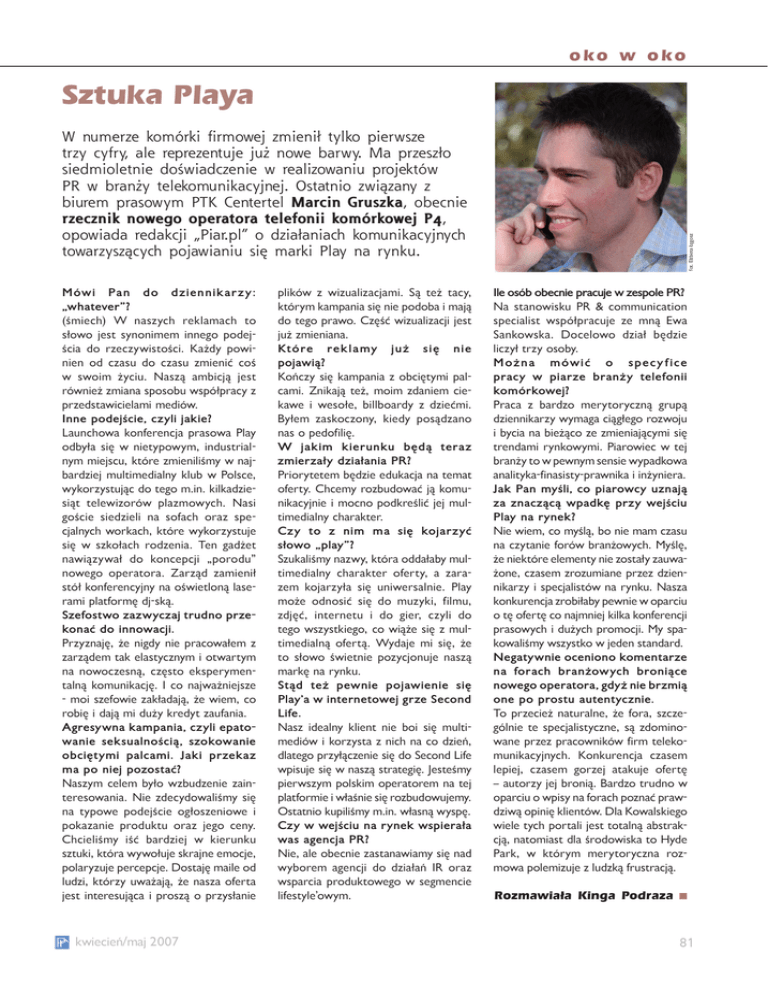 oko w oko Sztuka Playa Mówi Pan do dziennikar z y: „whatever”? (śmiech) W naszych reklamach to słowo jest synonimem innego podejścia do rzeczywistości. Każdy powinien od czasu do czasu zmienić coś w swoim życiu. Naszą ambicją jest również zmiana sposobu współpracy z przedstawicielami mediów. Inne podejście, czyli jakie? Launchowa konferencja prasowa Play odbyła się w nietypowym, industrialnym miejscu, które zmieniliśmy w najbardziej multimedialny klub w Polsce, wykorzystując do tego m.in. kilkadziesiąt telewizorów plazmowych. Nasi goście siedzieli na sofach oraz specjalnych workach, które wykorzystuje się w szkołach rodzenia. Ten gadżet nawiązywał do koncepcji „porodu” nowego operatora. Zarząd zamienił stół konferencyjny na oświetloną laserami platformę dj-ską. Szefostwo zazwyczaj trudno przekonać do innowacji. Przyznaję, że nigdy nie pracowałem z zarządem tak elastycznym i otwartym na nowoczesną, często eksperymentalną komunikację. I co najważniejsze ‑ moi szefowie zakładają, że wiem, co robię i dają mi duży kredyt zaufania. Agresywna kampania, czyli epatowanie seksualnością, szokowanie obciętymi palcami. Jaki przekaz ma po niej pozostać? Naszym celem było wzbudzenie zainteresowania. Nie zdecydowaliśmy się na typowe podejście ogłoszeniowe i pokazanie produktu oraz jego ceny. Chcieliśmy iść bardziej w kierunku sztuki, która wywołuje skrajne emocje, polaryzuje percepcje. Dostaję maile od ludzi, którzy uważają, że nasza oferta jest interesująca i proszą o przysłanie kwiecień/maj 2007 plików z wizualizacjami. Są też tacy, którym kampania się nie podoba i mają do tego prawo. Część wizualizacji jest już zmieniana. Które rek la my już się nie pojawią? Kończy się kampania z obciętymi palcami. Znikają też, moim zdaniem ciekawe i wesołe, billboardy z dziećmi. Byłem zaskoczony, kiedy posądzano nas o pedofilię. W jakim kierunku będą teraz zmierzały działania PR? Priorytetem będzie edukacja na temat oferty. Chcemy rozbudować ją komunikacyjnie i mocno podkreślić jej multimedialny charakter. Czy to z nim ma się kojarzyć słowo „play”? Szukaliśmy nazwy, która oddałaby multimedialny charakter oferty, a zarazem kojarzyła się uniwersalnie. Play może odnosić się do muzyki, filmu, zdjęć, internetu i do gier, czyli do tego wszystkiego, co wiąże się z multimedialną ofertą. Wydaje mi się, że to słowo świetnie pozycjonuje naszą markę na rynku. Stąd też pewnie pojawienie się Play’a w internetowej grze Second Life. Nasz idealny klient nie boi się multimediów i korzysta z nich na co dzień, dlatego przyłączenie się do Second Life wpisuje się w naszą strategię. Jesteśmy pierwszym polskim operatorem na tej platformie i właśnie się rozbudowujemy. Ostatnio kupiliśmy m.in. własną wyspę. Czy w wejściu na rynek wspierała was agencja PR? Nie, ale obecnie zastanawiamy się nad wyborem agencji do działań IR oraz wsparcia produktowego w segmencie lifestyle’owym. fot. Elżbieta Łęgosz W numerze komórki firmowej zmienił tylko pierwsze trzy cyfry, ale reprezentuje już nowe barwy. Ma przeszło siedmioletnie doświadczenie w realizowaniu projektów PR w branży telekomunikacyjnej. Ostatnio związany z biurem prasowym PTK Centertel Marcin Gruszka, obecnie rzecznik nowego operatora telefonii komórkowej P4, opowiada redakcji „Piar.pl” o działaniach komunikacyjnych towarzyszących pojawianiu się marki Play na rynku. Ile osób obecnie pracuje w zespole PR? Na stanowisku PR & communication specialist współpracuje ze mną Ewa Sankowska. Docelowo dział będzie liczył trzy osoby. Moż na mów ić o s pec y f ice pracy w piarze branży telefonii komórkowej? Praca z bardzo merytoryczną grupą dziennikarzy wymaga ciągłego rozwoju i bycia na bieżąco ze zmieniającymi się trendami rynkowymi. Piarowiec w tej branży to w pewnym sensie wypadkowa analityka-finasisty-prawnika i inżyniera. Jak Pan myśli, co piarowcy uznają za znaczącą wpadkę przy wejściu Play na rynek? Nie wiem, co myślą, bo nie mam czasu na czytanie forów branżowych. Myślę, że niektóre elementy nie zostały zauważone, czasem zrozumiane przez dziennikarzy i specjalistów na rynku. Nasza konkurencja zrobiłaby pewnie w oparciu o tę ofertę co najmniej kilka konferencji prasowych i dużych promocji. My spakowaliśmy wszystko w jeden standard. Negatywnie oceniono komentarze na forach branżowych broniące nowego operatora, gdyż nie brzmią one po prostu autentycznie. To przecież naturalne, że fora, szczególnie te specjalistyczne, są zdominowane przez pracowników firm telekomunikacyjnych. Konkurencja czasem lepiej, czasem gorzej atakuje ofertę – autorzy jej bronią. Bardzo trudno w oparciu o wpisy na forach poznać prawdziwą opinię klientów. Dla Kowalskiego wiele tych portali jest totalną abstrakcją, natomiast dla środowiska to Hyde Park, w którym merytoryczna rozmowa polemizuje z ludzką frustracją. Rozmawiała Kinga Podraza 81