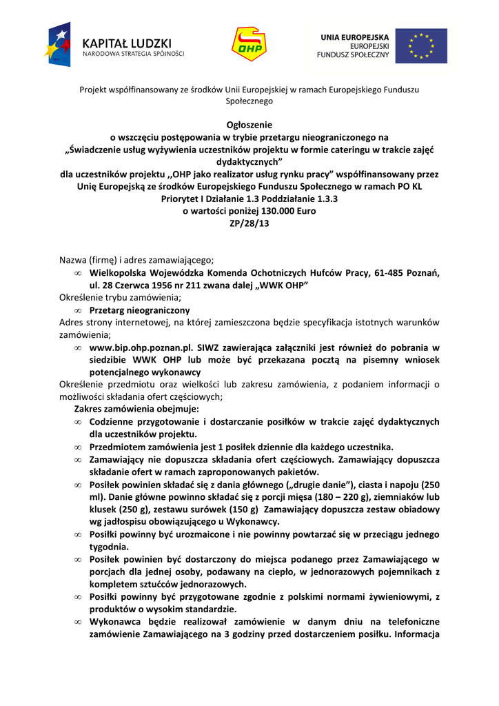 Projekt współfinansowany ze środków Unii Europejskiej w ramach Europejskiego Funduszu Społecznego Ogłoszenie o wszczęciu postępowania w trybie przetargu nieograniczonego na „Świadczenie usług wyżywienia uczestników projektu w formie cateringu w trakcie zajęć dydaktycznych” dla uczestników projektu ,,OHP jako realizator usług rynku pracy” współfinansowany przez Unię Europejską ze środków Europejskiego Funduszu Społecznego w ramach PO KL Priorytet I Działanie 1.3 Poddziałanie 1.3.3 o wartości poniżej 130.000 Euro ZP/28/13 Nazwa (firmę) i adres zamawiającego; • Wielkopolska Wojewódzka Komenda Ochotniczych Hufców Pracy, 61-485 Poznań, ul. 28 Czerwca 1956 nr 211 zwana dalej „WWK OHP” Określenie trybu zamówienia; • Przetarg nieograniczony Adres strony internetowej, na której zamieszczona będzie specyfikacja istotnych warunków zamówienia; • www.bip.ohp.poznan.pl. SIWZ zawierająca załączniki jest również do pobrania w siedzibie WWK OHP lub może być przekazana pocztą na pisemny wniosek potencjalnego wykonawcy Określenie przedmiotu oraz wielkości lub zakresu zamówienia, z podaniem informacji o możliwości składania ofert częściowych; Zakres zamówienia obejmuje: • Codzienne przygotowanie i dostarczanie posiłków w trakcie zajęć dydaktycznych dla uczestników projektu. • Przedmiotem zamówienia jest 1 posiłek dziennie dla każdego uczestnika. • Zamawiający nie dopuszcza składania ofert częściowych. Zamawiający dopuszcza składanie ofert w ramach zaproponowanych pakietów. • Posiłek powinien składać się z dania głównego („drugie danie”), ciasta i napoju (250 ml). Danie główne powinno składać się z porcji mięsa (180 – 220 g), ziemniaków lub klusek (250 g), zestawu surówek (150 g) Zamawiający dopuszcza zestaw obiadowy wg jadłospisu obowiązującego u Wykonawcy. • Posiłki powinny być urozmaicone i nie powinny powtarzać się w przeciągu jednego tygodnia. • Posiłek powinien być dostarczony do miejsca podanego przez Zamawiającego w porcjach dla jednej osoby, podawany na ciepło, w jednorazowych pojemnikach z kompletem sztućców jednorazowych. • Posiłki powinny być przygotowane zgodnie z polskimi normami żywieniowymi, z produktów o wysokim standardzie. • Wykonawca będzie realizował zamówienie w danym dniu na telefoniczne zamówienie Zamawiającego na 3 godziny przed dostarczeniem posiłku. Informacja • telefoniczna zawierać będzie informację o miejscu dostarczenia posiłku i liczbie posiłków. Liczba uczestników projektu i dni żywieniowych: nie więcej niż: 1. profesjonalny sprzedawca z elementami obsługi kas fiskalnych i terminali płatniczych (OSZ Krotoszyn, 30 osób II grupy po 15 osób, maksymalnie 16 dni dla każdej grupy) 2. magazynier z obsługą komputera i wózków jezdniowych z napędem silnikowym (OSZ Krotoszyn, 30 osób, II grupy po 15 osób, maksymalnie 27 dni dla każdej grupy) 3. operator obrabiarek sterowanych numerycznie CNC (OSZ Kępno, 10 osób, maksymalnie 23 dni szkoleniowe) 4. manicure i stylizacja paznokci ( OSZ Kępno, 10 osób, maksymalnie 8 dni szkoleniowych) 5. stolarz/ pomocnik stolarza (OSZ Kępno, 10 osób, maksymalnie 23 dni szkoleniowe) 6. murarz tynkarz z ocieplaniem budynków (OSZ Śrem,12 osób, maksymalnie 21 dni szkoleniowych) 7. spawacz metodą MAG (OSZ Śrem, 12 osób, maksymalnie 20 dni szkoleniowych) 8. magazynier z obsługą wózka jezdniowego (OSZ Śrem, 10 osób, maksymalnie 16 dni szkoleniowych) 9. spawacz metodą MAG (OSZ Turek, 13 osób, maksymalnie 23 dni) 10. operator koparko –ładowarki (OSZ Turek, 13 osób, maksymalnie 23 dni) 11. szwaczka (OSZ Turek, 10 osób ,maksymalnie 21 dni) 12. profesjonalny sprzedawca z elementami obsługi kas fiskalnych i terminali płatniczych , podstawy HACCP (OSZ Wolsztyn, 10 osób, maksymalnie 16 dni) 13. kierowca z prawem jazdy kat C (OSZ Wolsztyn, 10 osób, maksymalnie 5 dni) 14. opiekunka osób starszych z modułem języka niemieckiego (OSZ Wolsztyn, 10 osób, maksymalnie 19 dni) Nazwa: Usługi dostarczania posiłków Kod CPV: 55520000-1. Miejsce realizacji zamówienia oraz maksymalna ilość posiłków: PAKIET 1: OSZ Krotoszyn: sala Ośrodka szkolenia Zawodowego w Krotoszynie, ul. Kobylińska 10A, 63-700 Krotoszyn oraz sala wskazana przez Zamawiającego na terenie miasta Krotoszyna. Maksymalna ilość posiłków w ramach pakietu nr 1: nazwa szkolenia w ramach pakietu ilość osób maksymalnie uczestniczących w szkoleniu maksymalna ilość dni szkolenia maksymalna ilość posiłków do przygotowania profesjonalny sprzedawca z elementami obsługi kas fiskalnych i terminali płatniczych- GRUPA 1 profesjonalny sprzedawca z elementami obsługi kas fiskalnych i terminali płatniczych- GRUPA 2 15 osób 16 dni 240 posiłków 15 osób 16 dni 240 posiłków magazynier z obsługą 15 osób komputera i wózków jezdniowych z napędem silnikowym- GRUPA 1 magazynier z obsługą 15 osób komputera i wózków jezdniowych z napędem silnikowym- GRUPA 2 Łączna maksymalna ilość posiłków w ramach pakietu 27 dni 405 posiłków 27 dni 405 posiłków 1290 posiłków Pakiet 2: OSZ Kępno: sala Ośrodka szkolenia Zawodowego w Kępnie, ul. Marcinkowskiego 12C, 63-600 Kępno oraz sala wskazana przez Zamawiającego na terenie miasta Kępna. Maksymalna ilość posiłków w ramach pakietu nr 2: nazwa szkolenia w ramach pakietu ilość osób maksymalnie uczestniczących w szkoleniu operator obrabiarek 10 osób sterowanych numerycznie CNC manicure i stylizacja 10 osób paznokci stolarz/pomocnik 10 osób stolarza Łączna maksymalna ilość posiłków w ramach pakietu maksymalna ilość dni szkolenia maksymalna ilość posiłków do przygotowania 23 dni 230 posiłków 8 dni 80 posiłków 23 dni 230 posiłków 540 posiłków Pakiet 3: OSZ Śrem: sala Ośrodka Szkolenia Zawodowego w Śremie, ul. 1 Maja 11, 63-100 Śrem oraz sala wskazana przez Zamawiającego na terenie miasta Śremu. Maksymalna ilość posiłk