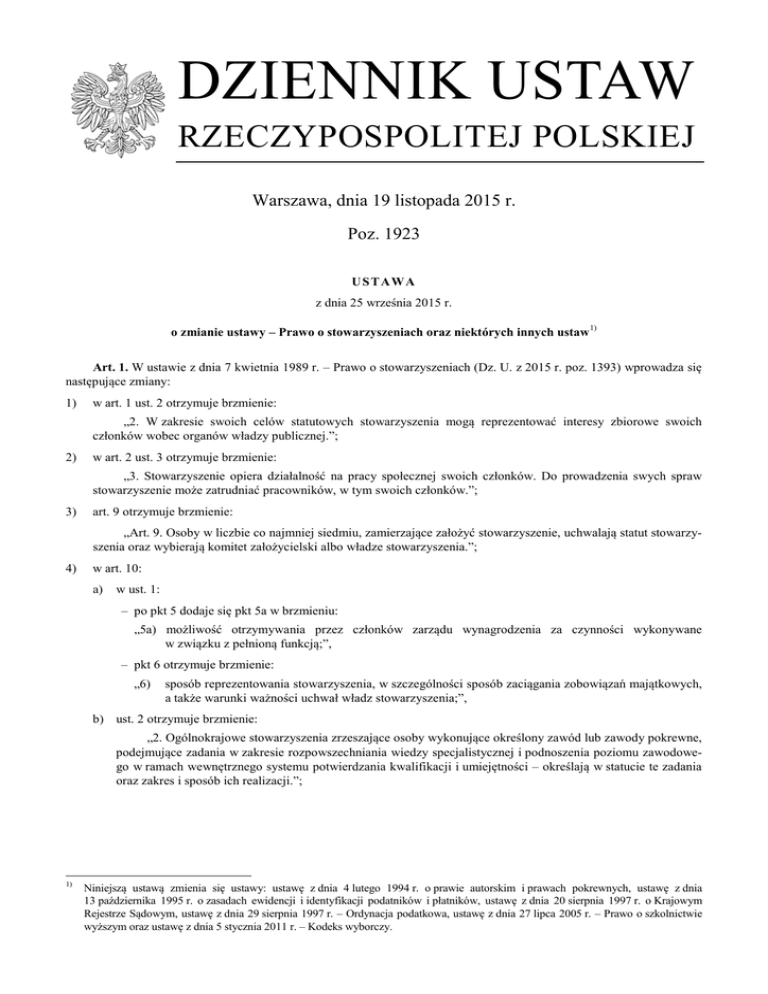 DZIENNIK USTAW RZECZYPOSPOLITEJ POLSKIEJ Warszawa, dnia 19 listopada 2015 r. Poz. 1923 US T AW A z dnia 25 września 2015 r. o zmianie ustawy – Prawo o stowarzyszeniach oraz niektórych innych ustaw1) Art. 1. W ustawie z dnia 7 kwietnia 1989 r. – Prawo o stowarzyszeniach (Dz. U. z 2015 r. poz. 1393) wprowadza się następujące zmiany: 1) w art. 1 ust. 2 otrzymuje brzmienie: „2. W zakresie swoich celów statutowych stowarzyszenia mogą reprezentować interesy zbiorowe swoich członków wobec organów władzy publicznej.”; 2) w art. 2 ust. 3 otrzymuje brzmienie: „3. Stowarzyszenie opiera działalność na pracy społecznej swoich członków. Do prowadzenia swych spraw stowarzyszenie może zatrudniać pracowników, w tym swoich członków.”; 3) art. 9 otrzymuje brzmienie: „Art. 9. Osoby w liczbie co najmniej siedmiu, zamierzające założyć stowarzyszenie, uchwalają statut stowarzyszenia oraz wybierają komitet założycielski albo władze stowarzyszenia.”; 4) w art. 10: a) w ust. 1: – po pkt 5 dodaje się pkt 5a w brzmieniu: „5a) możliwość otrzymywania przez członków zarządu wynagrodzenia za czynności wykonywane w związku z pełnioną funkcją;”, – pkt 6 otrzymuje brzmienie: „6) sposób reprezentowania stowarzyszenia, w szczególności sposób zaciągania zobowiązań majątkowych, a także warunki ważności uchwał władz stowarzyszenia;”, b) ust. 2 otrzymuje brzmienie: „2. Ogólnokrajowe stowarzyszenia zrzeszające osoby wykonujące określony zawód lub zawody pokrewne, podejmujące zadania w zakresie rozpowszechniania wiedzy specjalistycznej i podnoszenia poziomu zawodowego w ramach wewnętrznego systemu potwierdzania kwalifikacji i umiejętności – określają w statucie te zadania oraz zakres i sposób ich realizacji.”; 1) Niniejszą ustawą zmienia się ustawy: ustawę z dnia 4 lutego 1994 r. o prawie autorskim i prawach pokrewnych, ustawę z dnia 13 października 1995 r. o zasadach ewidencji i identyfikacji podatników i płatników, ustawę z dnia 20 sierpnia 1997 r. o Krajowym Rejestrze Sądowym, ustawę z dnia 29 sierpnia 1997 r. – Ordynacja podatkowa, ustawę z dnia 27 lipca 2005 r. – Prawo o szkolnictwie wyższym oraz ustawę z dnia 5 stycznia 2011 r. – Kodeks wyborczy. Dziennik Ustaw 5) –2– Poz. 1923 po art. 10 dodaje się art. 10a i art. 10b w brzmieniu: „Art. 10a. 1. Stowarzyszenie może tworzyć terenowe jednostki organizacyjne. W takim przypadku statut stowarzyszenia określa: 1) zasady tworzenia oraz rozwiązania terenowej jednostki organizacyjnej; 2) strukturę organizacyjną terenowej jednostki organizacyjnej; 3) organy terenowej jednostki organizacyjnej, w tym zarząd, oraz tryb dokonywania ich wyboru lub powoływania; 4) możliwość otrzymywania przez członków zarządu terenowej jednostki organizacyjnej wynagrodzenia za czynności wykonywane w związku z pełnioną funkcją, w przypadku gdy w statucie stowarzyszenia przewidziano możliwość otrzymywania takiego wynagrodzenia przez członków zarządu stowarzyszenia. 2. Terenowa jednostka organizacyjna prowadzi działalność na podstawie statutu stowarzyszenia. Na zasadach i w trybie określonym w statucie stowarzyszenia terenowa jednostka organizacyjna może przyjąć regulamin określający szczegółową jej organizację i sposób działania. 3. Jeżeli statut stowarzyszenia tak stanowi, terenowa jednostka organizacyjna może uzyskać osobowość prawną. W takim przypadku statut stowarzyszenia określa: 1) warunki, które muszą być spełnione, aby mogła ona uzyskać osobowość prawną; 2) zasady gospodarowania majątkiem; 3) sposób reprezentowania, w szczególności zaciągania zobowiązań majątkowych oraz zawierania umów z członkami jej zarządu; 4) szczegółowe zasady likwidacji. 4. Wniosek o wpis oraz wniosek o wykreślenie terenowej jednostki organizacyjnej, o której mowa w ust. 3, z Krajowego Rejestru Sądowego składa zarząd stowarzyszenia. 5. Terenowa jednostka organizacyjna uzyskuje osobowość prawną i może rozpocząć działalność po wpisie do Krajowego Rejestru Sądowego. 6. Z chwilą wykreślenia z Krajowego Rejestru Sądowego terenowej jednostki organizacyjnej z osobowością prawną traci ona osobowość prawną, a stowarzyszenie wstępuje we wszystkie prawa i obowiązki tej jednostki. 7. W przypadku rozwiązania terenowej jednostki organizacyjnej posiadającej osobowość prawną, przeprowadza się jej likwidację. Majątek pozostały po likwidacji pozostaje majątkiem stowarzyszenia. Do likwidacji przepisy art. 36 i art. 37 stosuje się odpowiednio. Art. 10b. 1. W przypadku gdy działalność terenowej jednostki organizacyjnej posiadającej osobowość prawną wykazuje rażące lub uporczywe naruszanie przepisów prawa lub statutu stowarzyszenia, jeżeli statut stowarzyszenia tak stanowi, organ w nim wskazany może podjąć uchwałę o powołaniu zarządu komisarycznego w tej jednostce. 2. Zarząd komisaryczny powołuje się na okres niezbędny do usunięcia nieprawidłowości związanych z rażącym lub uporczywym naruszaniem przepisów prawa lub statutu stowarzyszenia, nie dłuższy jednak niż przewidziany w statucie stowarzyszenia. 3. Uchwała o powołaniu zarządu komisarycznego wskazuje sposób reprezentacji terenowej jednostki organizacyjnej przez ten zarząd. 4. Z dniem podjęcia uchwały o powołaniu zarządu komisarycznego członkowie zarządu terenowej jednostki organizacyjnej zostają odwołani z mocy prawa. 5. Zarząd stowarzyszenia składa wniosek o wpis zarządu komisarycznego do Krajowego Rejestru Sądowego, w terminie 7 dni od dnia podjęcia uchwały, o której mowa w ust. 1, oraz zawiadamia o jej podjęciu organ nadzorujący, właściwy ze względu na siedzibę terenowej jednostki organizacyjnej. Po ustaniu przyczyny powołania zarządu komisarycznego albo upływu okresu, na jaki został on ustanowiony zarząd stowarzyszenia składa wniosek o jego wykreślenie z Krajowego Rejestru Sądowego.”; 6) w ar