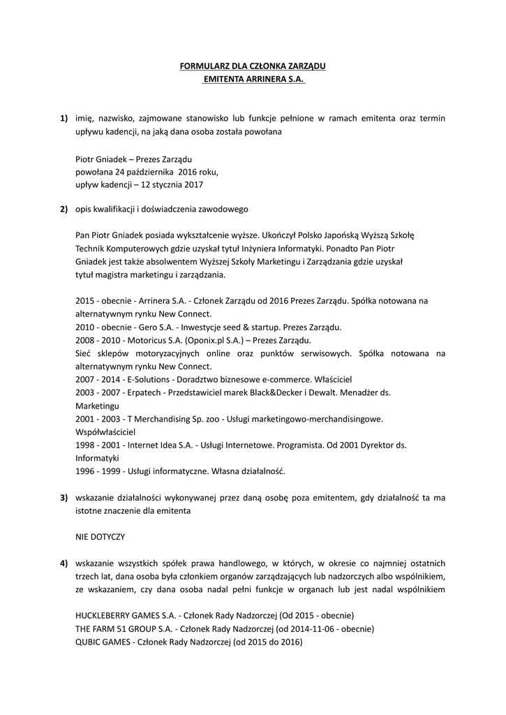 FORMULARZ DLA CZŁONKA ZARZĄDU EMITENTA ARRINERA S.A. 1) imię, nazwisko, zajmowane stanowisko lub funkcje pełnione w ramach emitenta oraz termin upływu kadencji, na jaką dana osoba została powołana Piotr Gniadek – Prezes Zarządu powołana 24 października 2016 roku, upływ kadencji – 12 stycznia 2017 2) opis kwalifikacji i doświadczenia zawodowego Pan Piotr Gniadek posiada wykształcenie wyższe. Ukończył Polsko Japońską Wyższą Szkołę Technik Komputerowych gdzie uzyskał tytuł Inżyniera Informatyki. Ponadto Pan Piotr Gniadek jest także absolwentem Wyższej Szkoły Marketingu i Zarządzania gdzie uzyskał tytuł magistra marketingu i zarządzania. 2015 - obecnie - Arrinera S.A. - Członek Zarządu od 2016 Prezes Zarządu. Spółka notowana na alternatywnym rynku New Connect. 2010 - obecnie - Gero S.A. - Inwestycje seed & startup. Prezes Zarządu. 2008 - 2010 - Motoricus S.A. (Oponix.pl S.A.) – Prezes Zarządu. Sieć sklepów motoryzacyjnych online oraz punktów serwisowych. Spółka notowana na alternatywnym rynku New Connect. 2007 - 2014 - E-Solutions - Doradztwo biznesowe e-commerce. Właściciel 2003 - 2007 - Erpatech - Przedstawiciel marek Black&Decker i Dewalt. Menadżer ds. Marketingu 2001 - 2003 - T Merchandising Sp. zoo - Usługi marketingowo-merchandisingowe. Współwłaściciel 1998 - 2001 - Internet Idea S.A. - Usługi Internetowe. Programista. Od 2001 Dyrektor ds. Informatyki 1996 - 1999 - Usługi informatyczne. Własna działalność. 3) wskazanie działalności wykonywanej przez daną osobę poza emitentem, gdy działalność ta ma istotne znaczenie dla emitenta NIE DOTYCZY 4) wskazanie wszystkich spółek prawa handlowego, w których, w okresie co najmniej ostatnich trzech lat, dana osoba była członkiem organów zarządzających lub nadzorczych albo wspólnikiem, ze wskazaniem, czy dana osoba nadal pełni funkcje w organach lub jest nadal wspólnikiem HUCKLEBERRY GAMES S.A. - Członek Rady Nadzorczej (Od 2015 - obecnie) THE FARM 51 GROUP S.A. - Członek Rady Nadzorczej (od 2014-11-06 - obecnie) QUBIC GAMES - Członek Rady Nadzorczej (od 2015 do 2016) GERO SA - Prezes Zarządu (od 2010 r. - obecnie) ERNE SA - Członek Rady Nadzorczej (od 2013-02-08 do 2013-03-28) 5) informacje na temat prawomocnych wyroków, na mocy których dana osoba została skazana za przestępstwa oszustwa w okresie co najmniej ostatnich pięciu lat oraz wskazanie, czy w okresie co najmniej ostatnich pięciu lat osoba taka otrzymała sądowy zakaz działania jako członek organów zarządzających lub nadzorczych w spółkach prawa handlowego NIE DOTYCZY 6) szczegóły wszystkich przypadków upadłości, zarządu komisarycznego lub likwidacji, w okresie co najmniej ostatnich pięciu lat, w odniesieniu do podmiotów, w których dana osoba pełniła funkcje członka organu zarządzającego lub nadzorczego NIE DOTYCZY 7) informację, czy dana osoba prowadzi działalność, która jest konkurencyjna w stosunku do działalności emitenta, oraz czy jest wspólnikiem konkurencyjnej spółki cywilnej lub osobowej albo członkiem organu spółki kapitałowej lub członkiem organu jakiejkolwiek konkurencyjnej osoby prawnej NIE DOTYCZY 8) informację, czy dana osoba figuruje w rejestrze dłużników niewypłacalnych, prowadzonym na podstawie ustawy z dnia 20 sierpnia 1997 r. o Krajowym Rejestrze Sądowym Pan Piotr Gniadek nie figuruje w rejestrze dłużników niewypłacalnych, prowadzonym na podstawie ustawy z dnia 20 sierpnia 1997 r. o Krajowym Rejestrze Sądowym.
