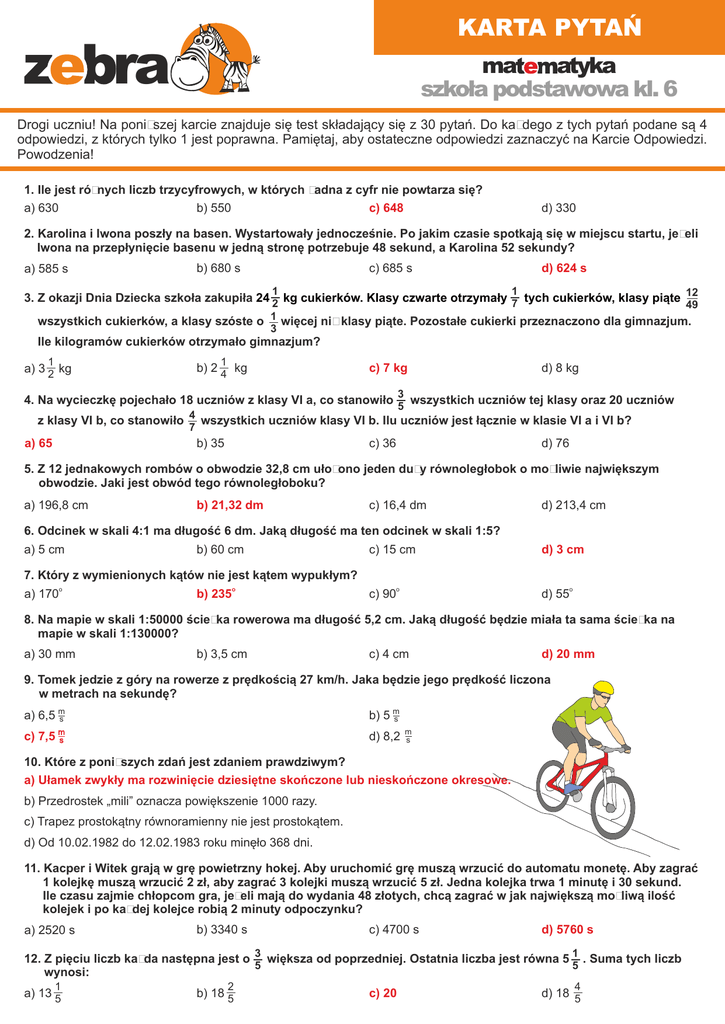 KARTA PYTAŃ ra ma atyka szkoła podstawowa kl. 6 Drogi uczniu! Na poniższej karcie znajduje się test składający się z 30 pytań. Do każdego z tych pytań podane są 4 odpowiedzi, z których tylko 1 jest poprawna. Pamiętaj, aby ostateczne odpowiedzi zaznaczyć na Karcie Odpowiedzi. Powodzenia! 1. Ile jest różnych liczb trzycyfrowych, w których żadna z cyfr nie powtarza się? a) 630 b) 550 c) 648 d) 330 2. Karolina i Iwona poszły na basen. Wystartowały jednocześnie. Po jakim czasie spotkają się w miejscu startu, jeżeli Iwona na przepłynięcie basenu w jedną stronę potrzebuje 48 sekund, a Karolina 52 sekundy? b) 680 s a) 585 s c) 685 s 1 d) 624 s 1 3. Z okazji Dnia Dziecka szkoła zakupiła 24 2 kg cukierków. Klasy czwarte otrzymały 7 tych cukierków, klasy piąte 12 49 wszystkich cukierków, a klasy szóste o 1 więcej niż klasy piąte. Pozostałe cukierki przeznaczono dla gimnazjum. 3 Ile kilogramów cukierków otrzymało gimnazjum? 1 1 b) 2 4 kg a) 3 2 kg c) 7 kg d) 8 kg 3 4. Na wycieczkę pojechało 18 uczniów z klasy VI a, co stanowiło 5 wszystkich uczniów tej klasy oraz 20 uczniów z klasy VI b, co stanowiło 4 wszystkich uczniów klasy VI b. Ilu uczniów jest łącznie w klasie VI a i VI b? 7 b) 35 a) 65 c) 36 d) 76 5. Z 12 jednakowych rombów o obwodzie 32,8 cm ułożono jeden duży równoległobok o możliwie największym obwodzie. Jaki jest obwód tego równoległoboku? a) 196,8 cm b) 21,32 dm c) 16,4 dm d) 213,4 cm 6. Odcinek w skali 4:1 ma długość 6 dm. Jaką długość ma ten odcinek w skali 1:5? a) 5 cm b) 60 cm c) 15 cm d) 3 cm c) 90o d) 55o 7. Który z wymienionych kątów nie jest kątem wypukłym? a) 170o b) 235o 8. Na mapie w skali 1:50000 ścieżka rowerowa ma długość 5,2 cm. Jaką długość będzie miała ta sama ścieżka na mapie w skali 1:130000? a) 30 mm b) 3,5 cm c) 4 cm d) 20 mm 9. Tomek jedzie z góry na rowerze z prędkością 27 km/h. Jaka będzie jego prędkość liczona w metrach na sekundę? a) 6,5 ms b) 5 ms c) 7,5 ms d) 8,2 m s 10. Które z poniższych zdań jest zdaniem prawdziwym? a) Ułamek zwykły ma rozwinięcie dziesiętne skończone lub nieskończone okresowe. b) Przedrostek „mili” oznacza powiększenie 1000 razy. c) Trapez prostokątny równoramienny nie jest prostokątem. d) Od 10.02.1982 do 12.02.1983 roku minęło 368 dni. 11. Kacper i Witek grają w grę powietrzny hokej. Aby uruchomić grę muszą wrzucić do automatu monetę. Aby zagrać 1 kolejkę muszą wrzucić 2 zł, aby zagrać 3 kolejki muszą wrzucić 5 zł. Jedna kolejka trwa 1 minutę i 30 sekund. Ile czasu zajmie chłopcom gra, jeżeli mają do wydania 48 złotych, chcą zagrać w jak największą możliwą ilość kolejek i po każdej kolejce robią 2 minuty odpoczynku? a) 2520 s b) 3340 s c) 4700 s d) 5760 s 12. Z pięciu liczb każda następna jest o 3 większa od poprzedniej. Ostatnia liczba jest równa 5 1 . Suma tych liczb 5 5 wynosi: 1 a) 13 5 2 b) 18 5 c) 20 4 d) 18 5 13. Pole rombu, którego jedna przekątna ma 1,2 dm długości, a druga jest 1 1 raza krótsza wynosi: 3 a) 48 cm2 b) 54 cm2 c) 6 cm2 d) 63 cm2 14. Wujek Zosi jest pilotem i pilotuje duże samoloty pasażerskie jak Boeing 747. Zaciekawiona Zosia zapytała go, ile waży taki samolot? Wujek odpowiedział: „100 ton i jeszcze cztery razy po 1 swojej masy”. Ile waży samolot? 9 a) 120 t b) 150 t c) 180 t d) 1200 t 15. W pewnym trójkącie miara drugiego kąta jest trzy razy większa od miary pierwszego kąta. Miara trzeciego kąta jest dwa razy większa od sumy pierwszego i drugiego kąta. O jakim trójkącie mowa? a) prostokątny b) równoramienny 16. Trójkąt o kątach: 42o, 51o, 87o nazywamy trójkątem: a) rozwartokątnym b) prostokątnym c) ostrokątny d) rozwartokątny c) równoramiennym d) różnobocznym 17. Tata Doroty przygotował w ogródku dwie prostokątne rabatki kwiatowe. Pierwsza ma długość 4,4 m i szerokość 2 m. Długość drugiej rabatki jest o 60 cm mniejsza od szerokości pierwszej, zaś szerokość drugiej rabatki stanowi 5 długości pierwszej. Ile m2 zajmują obie rabatki? 11 b) 2,80 m2 a) 8,80 m2 c) 10,40 m2 d) 11,60 m2 18. Patrząc na poruszające się wskazówki zegara („godzinową” i „minutową”) Eliza zastanawiała się, ile razy od godziny 0500 do godziny 1700 wskazówki zegara utworzą kąt prosty. Wskaż prawidłową odpowiedź. a) 18 razy b) 22 razy c) 20 razy d) 15 razy 19. Basia kupiła 15 lizaków po 35 gr za sztukę. Ile reszty otrzymała z 10 zł? a) 5,25 zł b) 5,75 zł c) 3,75 zł d) 4,75 zł c) 24 : (-3) - 12 = (-20) d) (-72) : (-3)2 + 5 = (-3) 20. W którym obliczeniu popełniono błąd? a) (-7) · 3 + (-15) = (-36) b) (-7) · (-8) - 17 = (-39) 21. Akwarium w kształcie prostopadłościanu ma wymiary: długość 40 cm, szerokość 20 cm i wysokość 30 cm. Ile litrów wody jest w akwarium, jeżeli Patrycja napełniła je do 2 wysokości? 3 a) 24 litry b) 36 litrów 22. Trójkąt o kątach 47o i 86o to trójkąt: a) równoramienny b) prostokątny c) 16 litrów d) 40 litrów c) równoboczny d) rozwartokątny 23. Pole powierzchni bocznej sześcianu wynosi 144 cm2. Jaka jest jego objętość? a) 36 cm3 b) 12 cm3 c) 216 cm3 d) 128 cm3 24. Iloczyn liczb 163 i 18 wynosi: a) MMCCMXXXIV b) MMCMXXXIV c) MCMXXXIV d) MMCMXXIV c) 14 d) 11 c) 30000 m2 d) 0,04 km2 25. Ile przekątnych ma siedmiokąt? a) 21 b) 7 26. Która z podanych powierzchni jest największa? a) 4,5 ha b) 70 a 27. Jaką liczbę otrzymasz, jeżeli 7,28 podzielisz najpierw przez 100, a następnie pomnożysz przez 1000? a) 7,28 b) 0,728 c) 7280 d) 72,8 28. Test składał się z 40 pytań. Za poprawną odpowiedź na pytanie można było otrzymać 5 punktów. Udzielenie błędnej odpowiedzi lub brak odpowiedzi na pytanie powodowały zmniejszenie zdobytej dotychczas liczby punktów o 10. Kamil zdobył w teście 70 punktów. Na ile pytań nie udzielił poprawnej odpowiedzi? a) od 0 do 4 29. Kąt a) ostry b) od 5 do 9 = 37o. Kąt trzykrotnie większy to kąt: b) wklęsły 30