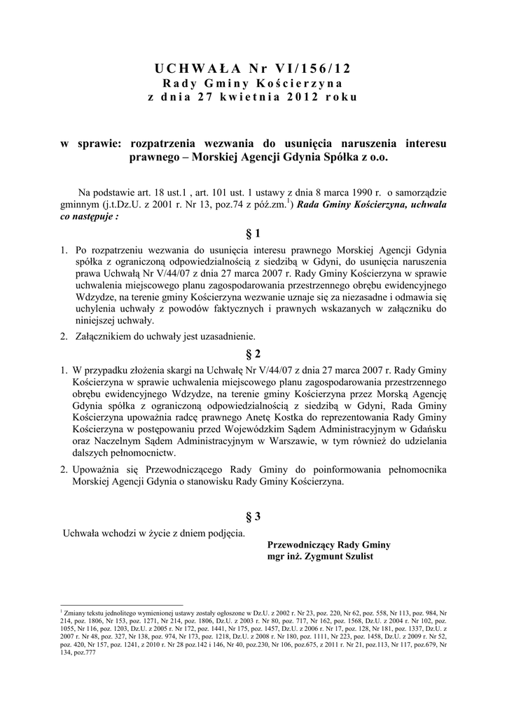UCHWAŁA Nr VI/156/12 Rady Gminy Kościerzyna z dnia 27 kwietnia 2012 roku w sprawie: rozpatrzenia wezwania do usunięcia naruszenia interesu prawnego – Morskiej Agencji Gdynia Spółka z o.o. Na podstawie art. 18 ust.1 , art. 101 ust. 1 ustawy z dnia 8 marca 1990 r. o samorządzie gminnym (j.t.Dz.U. z 2001 r. Nr 13, poz.74 z póź.zm.1) Rada Gminy Kościerzyna, uchwala co następuje : §1 1. Po rozpatrzeniu wezwania do usunięcia interesu prawnego Morskiej Agencji Gdynia spółka z ograniczoną odpowiedzialnością z siedzibą w Gdyni, do usunięcia naruszenia prawa Uchwałą Nr V/44/07 z dnia 27 marca 2007 r. Rady Gminy Kościerzyna w sprawie uchwalenia miejscowego planu zagospodarowania przestrzennego obrębu ewidencyjnego Wdzydze, na terenie gminy Kościerzyna wezwanie uznaje się za niezasadne i odmawia się uchylenia uchwały z powodów faktycznych i prawnych wskazanych w załączniku do niniejszej uchwały. 2. Załącznikiem do uchwały jest uzasadnienie. §2 1. W przypadku złoŜenia skargi na Uchwałę Nr V/44/07 z dnia 27 marca 2007 r. Rady Gminy Kościerzyna w sprawie uchwalenia miejscowego planu zagospodarowania przestrzennego obrębu ewidencyjnego Wdzydze, na terenie gminy Kościerzyna przez Morską Agencję Gdynia spółka z ograniczoną odpowiedzialnością z siedzibą w Gdyni, Rada Gminy Kościerzyna upowaŜnia radcę prawnego Anetę Kostka do reprezentowania Rady Gminy Kościerzyna w postępowaniu przed Wojewódzkim Sądem Administracyjnym w Gdańsku oraz Naczelnym Sądem Administracyjnym w Warszawie, w tym równieŜ do udzielania dalszych pełnomocnictw. 2. UpowaŜnia się Przewodniczącego Rady Gminy do poinformowania pełnomocnika Morskiej Agencji Gdynia o stanowisku Rady Gminy Kościerzyna. §3 Uchwała wchodzi w Ŝycie z dniem podjęcia. Przewodniczący Rady Gminy mgr inŜ. Zygmunt Szulist 1 Zmiany tekstu jednolitego wymienionej ustawy zostały ogłoszone w Dz.U. z 2002 r. Nr 23, poz. 220, Nr 62, poz. 558, Nr 113, poz. 984, Nr 214, poz. 1806, Nr 153, poz. 1271, Nr 214, poz. 1806, Dz.U. z 2003 r. Nr 80, poz. 717, Nr 162, poz. 1568, Dz.U. z 2004 r. Nr 102, poz. 1055, Nr 116, poz. 1203, Dz.U. z 2005 r. Nr 172, poz. 1441, Nr 175, poz. 1457, Dz.U. z 2006 r. Nr 17, poz. 128, Nr 181, poz. 1337, Dz.U. z 2007 r. Nr 48, poz. 327, Nr 138, poz. 974, Nr 173, poz. 1218, Dz.U. z 2008 r. Nr 180, poz. 1111, Nr 223, poz. 1458, Dz.U. z 2009 r. Nr 52, poz. 420, Nr 157, poz. 1241, z 2010 r. Nr 28 poz.142 i 146, Nr 40, poz.230, Nr 106, poz.675, z 2011 r. Nr 21, poz.113, Nr 117, poz.679, Nr 134, poz.777 UZASADNIENIE Morska Agencja Gdynia sp. z o.o z siedzibą w Gdyni pismem z dnia 14 marca 2012 r. (data wpływu 15.03.2012 r.) wezwała radę gminy do usunięcia interesu prawnego Spółki poprzez uchylenie w całości uchwały Nr V/44/07 z dnia 27 marca 2007 r. Rady Gminy Kościerzyna w sprawie uchwalenia miejscowego planu zagospodarowania przestrzennego obrębu ewidencyjnego Wdzydze, na terenie gminy Kościerzyna. Morska Agencja Gdynia (dalej zwana MAG) zarzuca naruszenia proceduralne przy podejmowaniu wskazanej powyŜej uchwały tj.: 1) naruszenie art.17 pkt 10 ustawy z dnia 27 marca 2003 r. o planowaniu i zagospodarowaniu przestrzennym poprzez niewyłoŜenie projektu miejscowego planu zagospodarowania przestrzennego przez czas ustawowo wymagany , tj. przez okres 21 dni roboczych, 2) naruszenie art.17 pkt 11 ustawy z dnia 27 marca 2003 r. o planowaniu i zagospodarowaniu przestrzennym poprzez wyznaczenie terminu, w którym osoby fizyczne i prawne oraz jednostki organizacyjne nieposiadające osobowości prawnej mgą wnosić uwagi przez czas ustawowo wymagany, przez okres nie krótszy niŜ 14 dni od dnia zakończenia okresu wyłoŜenia planu, 3) naruszenie art.20 ust.1 ustawy j.w. poprzez nierozstrzygnięcie przez Radę Gminy Kościerzyna o sposobie rozpatrzenia uwag wniesionych do projektu miejscowego planu zagospodarowania przestrzennego. Rada Gminy wskazuje, Ŝe stosownie do art. 3 ust.1 w/w ustawy „Kształtowanie i prowadzenie polityki przestrzennej na terenie gminy, w tym uchwalanie studium uwarunkowań i kierunków zagospodarowania przestrzennego gminy oraz miejscowych planów zagospodarowania przestrzennego, z wyjątkiem morskich wód wewnętrznych, morza terytorialnego i wyłącznej strefy ekonomicznej oraz terenów zamkniętych, naleŜy do zadań własnych gminy.” Wskazany przepis wyznacza gminę jako podstawową jednostkę w sprawach planowania przestrzennego. Zarówno w orzecznictwie jak i literaturze panuje zgodny pogląd, Ŝe gmina jest podstawową jednostką systemu planowania przestrzennego. Oznacza to, Ŝe wyłącznie gmina poprzez swoje organy określa przeznaczenie i zasady zagospodarowania terenu (wyrok WSA w Gdańsku Sygn.akt II S.A./Gd 297/06 z dnia 22 marca 2007 r. - niepublik.). . Odnosząc się do kwestionowanej Uchwały Rada Gminy podkreśla, Ŝe cała procedura wskazana w art.17-20 ustawy o planowaniu i zagospodarowaniu przestrzennym (Dz.U.Nr 80, poz.717) została zachowana. Potwierdził to Wojewoda Pomorski pismem z dnia 10 maja 2007 r. WI-AB-I/SA/7042-37-111/07, stwierdzając jej zgodność z obowiązującym prawem. Rada Gminy podkreśla, Ŝe skarŜący w okresie zgłaszania uwag tj. od 18 grudnia 2006 r. do dnia 11 stycznia 2007 r. nie wnosił Ŝadnych uwag do projektu planu. Zapis zawarty w art.17 pkt 10 ustawy o planowaniu i zagospodarowaniu przestrzennym ( w brzmieniu obowiązującym w dacie uchwalenia planu) stanowi, Ŝe wójt ogłasza, w sposób określony w pkt 1, o wyłoŜeniu projektu planu do publicznego wglądu na co najmniej 7 dni przed dniem wyłoŜenia i wykłada ten projekt wraz z prognozą oddziaływania na środowisko do publicznego wglądu na okres co najmniej 21 dni oraz organizuje w tym czasie dyskusję publiczną nad przyjętymi w projekcie planu rozwiązaniami. Nie sposób zgodzić się z MAG w zakresie uznania, iŜ we wskazanym przepisie termin jest „musi przypadać na dni robocze”. JeŜeli organ miałby przyjąć tak jak wskazuje 