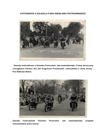 FOTOGRAFIE Z KOLEKCJI PANA WIESŁAWA PIOTROWSKIEGO Zawody motocyklowe w Drawsku Pomorskim, lata sześćdziesiąte. Z lewej strony przy chorągiewce startera stoi pan Eugeniusz Poniatowski, motocyklista z lewej strony Pan Walerian Biełuś. Zawody motocyklowe Drawsko motocyklistów przez miasto. Pomorskie, lata sześćdziesiąte, przejazd Zawody motocyklowe Drawsko Pomorskie, Przejazd zawodników w kategorii Cross. lata sześćdziesiąte. Zawody motocyklowe w Drawsku Pomorskim lata sześćdziesiąte .Najbardziej znaną postacią na zdjęciu jest Pan doktor Witold Reiner miłośnik i jednocześnie międzynarodowy sędzia sportów motorowych. Uhonorowany przez mieszkańców Drawska Pomorskiego nadaniem nazwy ulicy jego imieniem. Na zdjęciu są również trzej najlepsi drawscy motocykliści Pan Biełuś, Bryl, Salwa. „MIMO WSZYSTKO” - PAN LESZEK PARADOWSKI