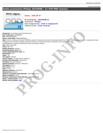 Informacje o produkcie Utworzono 04-03-2017 Radio przenośne Philips AE2600B / 12 (FM MW Czarny) Cena : 164,70 zł Nr katalogowy : AE2600B/12 Producent : Philips Stan magazynowy : brak w magazynie Średnia ocena : brak recenzji PR O G -I N FO Gwarancja: 24 miesiące gwarancji fabrycznej Kod Producenta: AE2600B/12 P/N:: 4895185605876 Numer części EAN:: 4895185605876 Opis: Ciesz się ulubionymi stacjami FM/MW po jednym naciśnięciu przycisku przenośnego radia firmy Philips. Cyfrowe strojenie oraz 5 ustawionych stacji dostępnych po naciśnięciu jednego przycisku sprawia, że radio to jest proste w obsłudze. Duży wyświetlacz LCD z podświetleniem zapewnia widoczność nawet przy słabym świetle. Typ: Radio przenośne Tuner: MW , FM Rodzaj strojenia: Cyfrowe Zapamiętywanie stacji: Tak Liczba zapamiętanych stacji: 10 Wyświetlacz: Tak Zegar: Tak Typ zegara: Cyfrowy Format zegara: 12-godzinny/24 -godzinny Moduły komunikacyjne: Nie dotyczy Interfejsy: Mini jack (wyjście) Sposób zasilania: Sieciowe , Bateryjne Typ baterii: R14 / C Ilość baterii: 4 szt. Kolor: Czarny Napięcie zasilania: 220-240 V Wyposażenie: Zasilacz Wymiary urządzenia (Szer/Wys/Gł): 138,5x186x79 mm Waga urządzenia: 570 g Wymiary opakowania (Szer/Wys/Gł): 215x90x215 mm Waga z opakowaniem: 1078 g Strona www produktu: Link Wygenerowano w programie www.oscGold.com