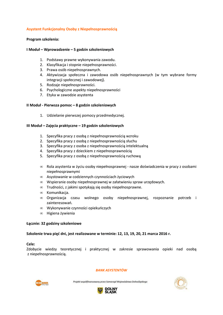 Asystent Funkcjonalny Osoby z Niepełnosprawnością Program szkolenia: I Moduł – Wprowadzenie – 5 godzin szkoleniowych 1. 2. 3. 4. Podstawy prawne wykonywania zawodu. Klasyfikacja i stopnie niepełnosprawności. Prawa osób niepełnosprawnych. Aktywizacja społeczna i zawodowa osób niepełnosprawnych (w tym wybrane formy integracji społecznej i zawodowej). 5. Rodzaje niepełnosprawności. 6. Psychologiczne aspekty niepełnosprawności 7. Etyka w zawodzie asystenta II Moduł - Pierwsza pomoc – 8 godzin szkoleniowych 1. Udzielanie pierwszej pomocy przedmedycznej. III Moduł – Zajęcia praktyczne – 19 godzin szkoleniowych 1. 2. 3. 4. 5. Specyfika pracy z osobą z niepełnosprawnością wzroku Specyfika pracy z osobą z niepełnosprawnością słuchu Specyfika pracy z osoba z niepełnosprawnością intelektualną Specyfika pracy z dzieckiem z niepełnosprawnością Specyfika pracy z osobą z niepełnosprawnością ruchową • Rola asystenta w życiu osoby niepełnosprawnej - nasze doświadczenia w pracy z osobami niepełnosprawnymi Asystowanie w codziennych czynnościach życiowych Wspieranie osoby niepełnosprawnej w załatwieniu spraw urzędowych. Trudności, z jakimi spotykają się osoby niepełnosprawne. Komunikacja. Organizacja czasu wolnego osoby niepełnosprawnej, rozpoznanie potrzeb i zainteresowań. Wykonywanie czynności opiekuńczych Higiena żywienia • • • • • • • Łącznie: 32 godziny szkoleniowe Szkolenie trwa pięć dni, jest realizowane w terminie: 12, 13, 19, 20, 21 marca 2016 r. Cele: Zdobycie wiedzy teoretycznej i praktycznej w zakresie sprawowania opieki nad osobą z niepełnosprawnością. BANK ASYSTENTÓW