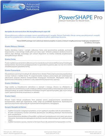 Narzędzie do tworzenia form dla skomplikowanych części 3D Wyspecjalizowane zadania wymagają czasem specjalistycznych narzędzi. Delcam Toolmaker oferuje szereg specjalistycznych narzędzi, aby pomóc projektantom w skróceniu czasu i polepszeniu jakości głębokiego tłoczenia. ”PowerSHAPE pomaga nam zakończyć złożone projekty w czasie, o którym mógłby pomarzyć tradycyjny narzędziowiec” Ian Wilson, Formaplex Kreator Matrycy i Stempla Szybka ekstrakcja matryc i stempli, wtłaczana forma oraz powierzchnia podziału, pochodzą bezpośrednio z naturalnego źródła jakim jest dana część. Unikalne podejście działania kreatora ułatwia jego obsługę, pozwalając tym samym ekspertom na totalną swobodę projektowania skomplikowanych złożeń. Kreator Formy Proste i szybkie tworzenie form odlewniczych ze standardowych lub też zdefiniowanych katalogów komponentów. Dynamiczny podgląd pozwala na sprawdzenie grubości płyt, luz oraz inne istotne charakterystyczne parametry formy. Kreator Przesunięcia Dla podcięcia oraz innych trudnych do odlania form, Kreator Przesunięcia pozwala projektantowi tworzyć matryce z każdej strony. Po wygenerowaniu matrycy, przesunięcie jest automatycznie zakończone poprzez złożenie komponentów tworzących mechanizm. Mechanizm może być dynamicznie animowany na ekranie w celu zapewnienia poprawności operacji. Kreator Chłodzenia Ciągi wodne są interaktywnie nakreślone w stempel i matrycę. Otwory na chłodzenie są automatycznie zorientowane w celu zwiększyć efektywność produkcji. Automatyczne wykrywanie kolizji powoduje, że system chłodzenia nie koliduje z innymi częściami projektu, gdy w tym samym czasie zapewnia kontrolę temperatury w układzie. Kreator Części Kreator Części kieruje projektanta form poprzez proces pozycjonowania standardowych komponentów, takich jak wypychacze, śruby, tuleje czy podkładki dystansowe. Automatyczne operacje przycinania wykrywają złe wymiarowanie komponentu i korygują to. Korzyści Narzędzi od Delcam • • • • Szybkie tworzenie wstępnych projektów, w tym ogólnych zespołów (GA) do zatwierdzenia. W pełni asocjatywny montaż umożliwia dynamiczne weryfikację złożonych mechanizmów form wtryskowych. Zautomatyzowana obróbka (z PowerMILL od Delcam) standardowych cech, takich jak otwory i kieszenie. Automatyczne sporządzanie zarówno rysunku złożeniowego, jak i wykonawczego części. Szybkie tworzenie wyceny, również w formacie Excel, dla zamówień komponentów on-line. D e lc a m plc, AM S D i v i s i o n e ma il: ma r k e t i n g @ de l c am. com w w w.powershape.com w w w.delcam .t v/lz w w w.de lcam-ams.co m w w w.de lcam.t v