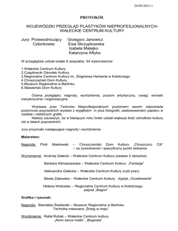 26/09/2013 r. PROTOKÓŁ WOJEWÓDZKI PRZEGLĄD PLASTYKÓW NIEPROFESJONALNYCHWAŁECKIE CENTRUM KULTURY Jury: Przewodniczący Członkowie: Grzegorz Janowicz Ewa Skrzypkowska Izabela Matejko Katarzyna Aftyka W przeglądzie udział wzięło 6 zespołów, 54 wykonawców: 1.Wałeckie Centrum Kultury 2.Czaplinecki Ośrodek Kultury 3.Regionalne Centrum Kultury im. Zbigniewa Herberta w Kołobrzegu 4.Choszczański Dom Kultury 5.Muzeum Regionalne w Barlinku 6.Sławieński Dom Kultury Ocena przeglądu: nagrody, wyróżnienia, poziom artystyczny, uwagi, wnioski merytoryczne i organizacyjne. Wystawa prac Twórców Nieprofesjonalnych poziomem swoim odpowiada poziomowi poprzednich wystaw z wyjątkiem in plus fotografii, zastosowaniem papieru w rzeźbie i niektórych grafik. Należy zauważyć, że w bieżącym roku brało udział większa ilość ośrodków kultury niż w latach poprzednich. Jury przyznało następujące nagrody i wyróżnienia: Malarstwo: Nagroda: Piotr Masłowski – Choszczeński Dom Kultury „Choszczno – za żywiołowość i specyficzny punkt widzenia Wyróżnienie: Andrzej Gałecki – Wałeckie Centrum Kultury (zestaw 2 obrazów) Barbara Klimaszewska – Wałeckie Centrum Kultury „Fantazje” Aleksandra Gałecka – Wałeckie Centrum Kultury (cykl prac) Beata Zalewska – Wałeckie Centrum Kultury dyptyk „Oczekiwanie” Helena Wołowiec – Regionalne Centrum Kultury w Kołobrzegu pejzaż „Bagno” Grafika i rysunek: Nagroda: Stanisław Świderski – Muzeum Regionalne w Barlinku Technika mieszana „Śnieg w maju” Wyróżnienie: Rafał Rubak – Wałeckie Centrum kultury „Atom serce matki”, „Bogowie” Citi” Rzeźba: Nagroda: Adam Kmita i Andrzej Kmita – Środowiskowy Dom Samopomocy w Choszcznie rzeźba z papieru „Na ludową nutę” (zaskakujące wykorzystanie papieru) Wyróżnienie: Bartłomiej Baranowski – Wałeckie Centrum Kultury (wytwory z poroża) Bożena Kulesza – Mazurek – Muzeum Regionalne Barlinek „Metamorfozy” Jerzy Płachta – Czaplinecki Ośrodek Kultury (korzenioplastyka) Tkanina i haft: Nagroda: Galina Błażejewska – Regionalne Centrum Kultury w Kołobrzegu (filcowane – szal+torebka (komplet) ) Wyróżnienie: Barbara Ostapowicz – Regionalne Centrum Kultury w Kołobrzegu (za zestaw) – Haft wstążeczkowy Fotografia: Nagroda: Katarzyna Mielcarek – Muzeum Regionalne w Barlinku „W dolinie Płoni” (zestaw zdjęć) Wyróżnienie poza kategorią: Agata Blomberg – Wałeckie Centrum Kultury „scrapbooki” (za specyficzne podejście do pamiątek okolicznościowych)