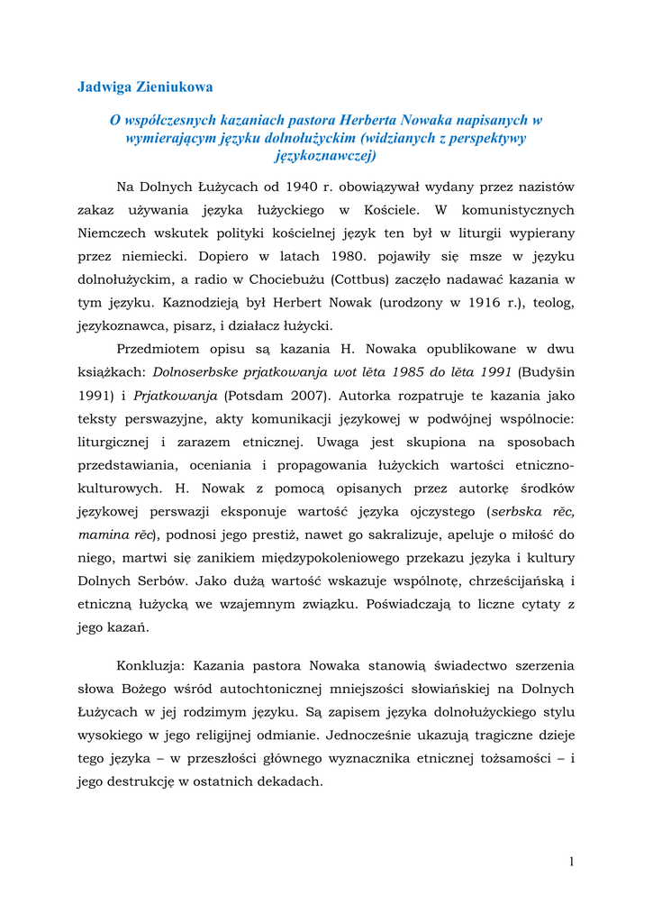 Jadwiga Zieniukowa O współczesnych kazaniach pastora Herberta Nowaka napisanych w wymierającym języku dolnołużyckim (widzianych z perspektywy językoznawczej) Na Dolnych Łużycach od 1940 r. obowiązywał wydany przez nazistów zakaz używania języka łużyckiego w Kościele. W komunistycznych Niemczech wskutek polityki kościelnej język ten był w liturgii wypierany przez niemiecki. Dopiero w latach 1980. pojawiły się msze w języku dolnołużyckim, a radio w Chociebużu (Cottbus) zaczęło nadawać kazania w tym języku. Kaznodzieją był Herbert Nowak (urodzony w 1916 r.), teolog, językoznawca, pisarz, i działacz łużycki. Przedmiotem opisu są kazania H. Nowaka opublikowane w dwu książkach: Dolnoserbske prjatkowanja wot lěta 1985 do lěta 1991 (Budyšin 1991) i Prjatkowanja (Potsdam 2007). Autorka rozpatruje te kazania jako teksty perswazyjne, akty komunikacji językowej w podwójnej wspólnocie: liturgicznej i zarazem etnicznej. Uwaga jest skupiona na sposobach przedstawiania, oceniania i propagowania łużyckich wartości etnicznokulturowych. H. Nowak z pomocą opisanych przez autorkę środków językowej perswazji eksponuje wartość języka ojczystego (serbska rěc, mamina rěc), podnosi jego prestiż, nawet go sakralizuje, apeluje o miłość do niego, martwi się zanikiem międzypokoleniowego przekazu języka i kultury Dolnych Serbów. Jako dużą wartość wskazuje wspólnotę, chrześcijańską i etniczną łużycką we wzajemnym związku. Poświadczają to liczne cytaty z jego kazań. Konkluzja: Kazania pastora Nowaka stanowią świadectwo szerzenia słowa Bożego wśród autochtonicznej mniejszości słowiańskiej na Dolnych Łużycach w jej rodzimym języku. Są zapisem języka dolnołużyckiego stylu wysokiego w jego religijnej odmianie. Jednocześnie ukazują tragiczne dzieje tego języka – w przeszłości głównego wyznacznika etnicznej tożsamości – i jego destrukcję w ostatnich dekadach. 1 On contemporary sermons written by Rev. Herbert Nowak in the moribund Lower Sorbian language (a linguistic insight) In 1940 the Nazis banned using the Sorbian language in the Church in Lower Lusatia, while in communist Germany the church policy favoured the German language. As late as in the 1980s Lower Sorbian-language services entered the church, and the radio in Cottbus/Chośebuz started broadcasting sermons in that language, the preacher being Rev. Herbert Nowak (born in 1916), a theologian, linguist, writer and Sorbian activist. This paper discusses H. Nowak’s sermons published in two books: Dolnoserbske prjatkowanja wot lěta 1985 do lěta 1991 (Budyšin 1991) and Prjatkowanja (Potsdam 2007). The present author examines the sermons as persuasive texts and communicative acts in a double community: liturgical and ethnic at the same time. Attention is focused on how the Lusatian ethnic-cultural values are presented, estimated and popularised. By means of language persuasion, as described by the present author, H. Nowak displays the value of the mother tongue (serbska rěc, mamina rěc), upgrades its prestige, even consecrates, appeals for its due love, worries about the disappearing transmission of the Lower Sorbian language and culture from one generation to the next. The community, both Christian and ethnic Sorbian in a mutual interconnection, is indicated as value of high esteem, as evidenced by quotations from his sermons. Concluding: Rev. Nowak’s sermons spread the Word of the Lord among the autochthonous Slavic minority in Lower Lusatia in their mother tongue. They constitute a record of the Lower Sorbian language in its high-register religious variety. At the same time, they display the dramatic history of the language – which was the main indicator of the ethnic identity in the past – and its destruction in the recent decades. Tłumaczył Tomasz Wicherkiewicz 2