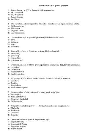 Pytania dla szkół gimnazjalnych 1. a) b) c) d) Zamordowany w 977 w Prusach, biskup praski to: św. Sylwester św. Wojciech Jakub Świnka św. Karol 2. a) b) c) d) Dla określenia obszaru państwa Mieszka I najwłaściwsza będzie analiza tekstu: Galla Anonima Thietmara Dagome Iudex jego testamentu 3. a) b) c) d) „Dziesięcina” był to podatek pobierany od chłopów na rzecz: pana kościoła króla rycerstwa 4. a) b) c) d) Zamek Krzyżacki w Gniewnie jest przykładem budowli: barokowej gotyckiej romańskiej renesansowej 5. a) b) c) d) O przynależności do której grupy społecznej (stanu) nie decydowało urodzenie: rycerstwa chłopstwa mieszczaństwa duchowieństwa 6. a) b) c) d) Na początku XIV wieku Polska utraciła Pomorze Gdańskie na rzecz: Czechów Turków Krzyżaków Brandenburczyków 7. a) b) c) d) Autorem słów „Polacy nie gęsi, iż swój język mają” jest: Mikołaj Rej Jan Kochanowski Wincenty Kadłubek Gall Anonim 8. a) b) c) d) Wojnę trzynastoletnią (1454 – 1466) zakończył pokój podpisany w: Malborku Krakowie Gdańsku Toruniu 9. a) b) c) d) Ostatnim królem z dynastii Jagiellonów był: Zygmunt Stary Zygmunt III Waza Zygmunt August Jan Olbracht 10. Po zawarciu unii lubelskiej Rzeczpospolita zajmowała 815 tysięcy km² i liczyła blisko 8 mln. mieszkańców. Co do wielkości była w Europie: a) 1 b) 2 c) 3 d) 4 11. Które ze zobowiązań nie wynikało z artykułów henrykowskich: a) uznanie wolnej elekcji b) utrzymanie organu pomocniczego króla – rady 16 senatorów c) przestrzeganie postanowień konfederacji warszawskiej d) zwołanie sejmu walnego przynajmniej raz na 4 lata 12. W którym z miast rozpoczęła się Insurekcja kościuszkowska: a) Warszawie b) Targowicy c) Krakowie d) Paryżu 13. Kozacy rejestrowi byli/a to: a) Polska szlachta zamieszkująca tereny Ukrainy b) Kozacy posiadający specjalne przywileje szlacheckie c) Kozacy, którzy za żołd zobowiązani byli do obrony południowo – wschodniej granicy przed Tatarami d) Kozacy, którzy nie posiadali ziemi 14. Terminu „targowiczanie” używamy w odniesieniu do: a) zwolenników reform państwa i Konstytucji 3 maja b) handlarzy na targu c) zdrajców Polski i przeciwników Konstytucji 3 maja d) przeciwników carycy Katarzyny 15. Zaznacz prawidłową kolejność wydarzeń: a) elekcja Stanisława Poniatowskiego – I rozbiór Polski – konfederacja targowicka- Konstytucja 3 maja b) konfederacja barska – Konstytucja 3 maja – I rozbiór Polski – elekcja Stanisława Poniatowskiego c) Konstytucja 3 maja – konfederacja targowicka – powstanie kościuszkowskie – II rozbiór Polski d) elekcja Stanisława Poniatowskiego – I rozbiór Polski – Konstytucja 3 maja – konfederacja targowicka 16. Sanacja to: a) potoczna nazwa zamachu na Piłsudskiego w maju 1926 r. b) potoczna nazwa obozu piłsudczykowskiego c) potoczna nazwa „choroby” państwa polskiego d) potoczna nazwa ugrupowania centrolewu 17. Rozwiń skrót BBWR : a) Bezpartyjny Blok Współpracy z Rządem b) Bezzwiązkowy Blok Współpracy z Radą c) Bezpartyjny Blok Walki Radykalnej d) Bezpartyjny Blok Współpracy z Rosją 18. „ Odwilż październikowa” to określenie powstałe po wydarzeniach z roku: a) 1946 b) 1956 c) 1968 d) 1980 19. Niezależny Samorządny Związek Zawodowy „Solidarność” powstał w roku: a) 1956 b) 1980 c) 1984 d) 1989 20. Który z I sekretarzy KC PZPR, podczas rozmów ze strajkującymi robotnikami, wypowiedział słynny zwrot „Jak, pomożecie?”: a) Bolesław Bierut b) Władysław Gomułka c) Edward Gierek d) Wojciech Jaruzelski a) b) c) d) 21. Kapitulacja III Rzeczy nastąpiła w 1945 roku w: kwietniu maju czerwcu październiku 22. Zaznacz prawidłową kolejność wydarzeń dotyczących II Wojny Światowej : a) podpisanie układu Ribbentrop – Mołotow , atak ZSRR na Polskię, początek operacji „Barbarossa”, mord katyński b) konferencja Teherańska, śmierć Władysława Sikorskiego w Giblartarze, likwidacja getta w Warszawie, zatrzymanie ofensywy niemieckiej pod Moskwą c) założenie obozu w Auschwitz, lądowanie w Normandii- konferencja jałtańska- śmierć Hitlera d) konferencja poczdamska – bitwa pod Monte Cassino – konfederacja jałtańska-włączenie się USA do wojny 23. Jednym z przywódców powstania w getcie warszawskim był zmarły w 2009 roku: a) Marek Edelman b) Jürgen Stroop c) Icchak Cukierman d) Teodor Herzl 24. Przewodniczącym Parlamentu Europejskiego jest: a) Jerzy Buzek b) Hans-Gert Pöttering c) Pat Cox d) Włodzimierz Cimoszewicz 25. Wskaż odpowiedź, w której chronologicznie zapisani są prezydenci III RP Polski: a) Wojciech Jaruzelski – Lech Wałęsa- Aleksander Kwaśniewski – Lech Kaczyński b) Lech Wałęsa – Aleksander Kwaśniewski – Lech Wałęsa – Lech Kaczyński c) Lech Kaczyński – Wojciech Jaruzelski – Aleksander Kwaśniewski – Lech Kaczyński d) Tadeusz Mazowiecki- Lech Wałęsa – Aleksander Kwaśniewski – Lech Kaczyński *** Zapoznaj się z fragmentem tekstu i odpowiedz na poniższe pytania: „Jest rzeczą nieodzowną, abyśmy wprowadzili na tron polski Piasta dla nas dogodnego, użytecznego dla naszych rzeczywistych interesów, jednym słowem człowieka, który by wyłącznie nam zawdzięczał swoje wyniesienie. W osobie hrabiego Poniatowskiego znajduje wszystkie warunki niezbędne dla dogodzenia nam i skutkiem tego postanawiam wynieść go na tron Polski” 26. Kto jest autorem tego fragmentu tajnej instrukcji z roku 1763: a) Fryderyk II b) Katarzyna II c) Stanisław Szczęsny Potocki d) Franciszek Ksawery Branicki 27. Jakie wydarzenie zakończyło panowanie Stanisława Augusta Poniatowskiego: a) śmierć w 1798 roku b) abdykacja w 1772 roku c) II rozbiór Polski d) III rozbiór Polski *** Zapoznaj się z fragmentem tekstu, adresowanego do mieszkańców byłego Wielkiego Księstwa Litewskiego (1919) i odpowiedz na pytania: „Kraj Wasz od stu kilkudziesięciu lat nie zna swobody, uciskany przez wrogą przemoc rosyjską, 