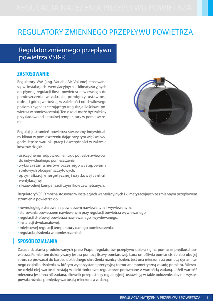 REGULACJA NATĘŻENIA PRZEPŁYWU POWIETRZA REGULATORY ZMIENNEGO PRZEPŁYWU POWIETRZA Regulator zmiennego przepływu powietrza VSR-R ZASTOSOWANIE Regulatory VAV (ang. VariableAir Volume) stosowane są w instalacjach wentylacyjnych i klimatyzacyjnych do płynnej regulacji ilości powietrza nawiewnego do pomieszczenia w zakresie pomiędzy ustawioną dolną i górną wartością, w zależności od chwilowego poziomu sygnału sterującego (regulacja ilościowa powietrza w pomieszczeniu). Ten z kolei może być zależny przykładowo od aktualnej temperatury w pomieszczeniu. Regulując strumień powietrza stwarzamy indywidualny klimat w pomieszczeniu dając przy tym większą wygodę, lepsze warunki pracy i oszczędności w zakresie kosztów dzięki: • oszczędnemu i odpowiedniemu do potrzeb nawiewowi do indywidualnego pomieszczenia, • wykorzystaniu nierównoczesnego występowania strefowych obciążeń szczytowych, • optymalizacji energetycznej i użytkowej centrali wentylacyjnej, • niezawodnej kompensacji czynników zewnętrznych. Regulatory VSR-R można stosować w instalacjach wentylacyjnych i klimatyzacyjnych ze zmiennym przepływem strumienia powietrza do: • równoległego sterowania powietrzem nawiewanym i wywiewanym, • sterowania powietrzem nawiewanym przy regulacji powietrza wywiewanego, • regulacji strefowej powietrza nawiewanego i wywiewanego, • instalacji dwukanałowej, • miejscowej regulacji temperatury danego pomieszczenia, • regulacja ciśnienia w pomieszczeniach. SPOSÓB DZIAŁANIA Zasada działania produkowanych przez Frapol regulatorów przepływu opiera się na pomiarze prędkości powietrza. Pomiar ten dokonywany jest za pomocą listwy pomiarowej, która umożliwia pomiar ciśnienia z obu jej stron, co prowadzi do bardzo dokładnego określenia różnicy ciśnień. Jest ona mierzona za pomocą dynamicznego czujnika ciśnienia, w którym wykorzystano precyzyjną termo-anemometryczną zasadę pomiaru. Mierzone dzięki niej wartości zostają w elektronicznym regulatorze porównane z wartością zadaną. Jeżeli wartość mierzona jest inna niż zadana, siłownik przepustnicy regulacyjnej ustawia ją w takie położenie, aby nie występowała różnica pomiędzy wartością mierzoną a zadaną. REGULACJA NATĘŻENIA PRZEPŁYWU POWIETRZA 1 KONSTRUKCJA Korpus oraz przegroda regulatora o przekroju prostokątnym VSR-R wykonane są ze stali ocynkowanej. Część regulacyjna wykonana jest z aluminium. Lamele doszczelnione są uszczelką gumową. Do pomiaru różnicy ciśnienia dynamicznego służą króćce umieszczone na stalowej listwie pomiarowej. Elementem sterującym jest siłownik Belimo w zależności od wariantu wykonania. WARIANTY WYKONANIA - WYKONANIE STANDARDOWE: W wykonaniu standardowym regulator VSR-R wyposażony jest w siłownik VAV Compact, który umożliwia skuteczną regulację warunków w pomieszczeniu przy użyciu jednego urządzenia. Zestaw ten składa się z siłownika, regulatora oraz dynamicznego czujnika ciśnienia ( jako jedna zwarta jednostka typu LMV-D3-MP). Sposób sterowania regulatorem wyposażonym w siłownik VAV Compact: a) analogowe sterowanie ciągłe – siłownik reguluje przepływ powietrza w przedziale pomiędzy zadanymi nastawami VMIN … VMAX, według proporcjonalnej zależności ciągłego sygnału sterującego (2…10 V - standard, 0…10 V - opcja) do zaprogramowanego zakresu roboczego; możliwe są również niektóre wymuszone położenia b) analogowe sterowanie wymuszone (dostępne pozycje): • przepustnica w pozycji ,,ZAM’’ – zamknięcie przepustnic na doprowadzeniu i odprowadzeniu powietrza do nieużytkowych pomieszczeń pozwala na oszczędzanie energii. Ze względów technicznych sterowanie wymuszone do pozycji ,,ZAM’’ możliwe jest tylko w zakresie roboczym 2 …10V, ale generalnie tylko przy nastawie 0% VMIN. Jeżeli, przy zakresie roboczym 2…10V – wejście ,,w’’ i przyłącze 1 zostaną zwarte, to siłownik steruje przepustnice do pozycji ,,ZAM’’. • przepustnica w pozycji ,,OTW’’ – wspomaganie oddymiania pomieszczeń albo jako pozycja bezpieczna. W tym przypadku następuje całkowite otwarcie przepustnicy. • VMIN– minimalny przepływ objętościowy, w zależności od potrzeb, można przełączyć poszczególne strefy lub pomieszczenia w stan gotowości. Przy takiej pracy następuje tylko minimalne przewietrzanie pomieszczeń i znaczna redukcja energii. • VMAX– maksymalny przepływ objętościowy, pojedyncze pomieszczenia lub grupa pomieszczeń muszą być krótkotrwale zasilane maksymalnym strumieniem powietrza. W ten sposób możliwe jest przewietrzanie, wieczorne schładzanie lub poranne szybkie ogrzanie pomieszczenia. • VS – pozycja pośrednia, zarówno przy ręcznej jak i automatycznej wielostopniowej regulacji strumienia powietrza możliwe jest osiągnięcie-przy średniej wartości pomiędzy minimalną i maksymalna objętością przepływu, bardziej delikatnego stopniowania przepływu np.: przy sterowaniu w -zależności od jakości powietrza. c) cyfrowe sterowanie przy użyciu szyny Belimo MP-Bus. Regulatory VAV firmy Frapol mogą być również wykorzystywane do utrzymania stałego przepływu powietrza (praca jako CAV). Wszystkie regulatory VAV wyposażone są w szynę umożliwiającą komunikację cyfrową za pomocą protokołu MP-Bus. Możliwe jest łączenie regulatorów w grupy do 8 sztuk. Dostępne są regulatory dedykowane do (lub bramki umożliwiające standardowym regulatorom) komunikacji za pomocą protokołów: • regulatorem DDC z interfejsem szyny MP, • systemami LonWorks, • systemami EIB/Konnex, • systemami Modbus RTU, • systemami BACnet MS/TP. 2 REGULACJA NATĘŻENIA PRZEPŁYWU POWIETRZA REGULACJA NATĘŻENIA PRZEPŁYWU POWIETRZA 5 - WYKONANIE SPECJALNE: Regulatory VSR-R w wykonaniu specjalnym wymagają zastosowania układu sterującego typu VAV Universal – rozwiązania dostosowanego do zadania jakie ma spełnić regulator. Najczęściej 