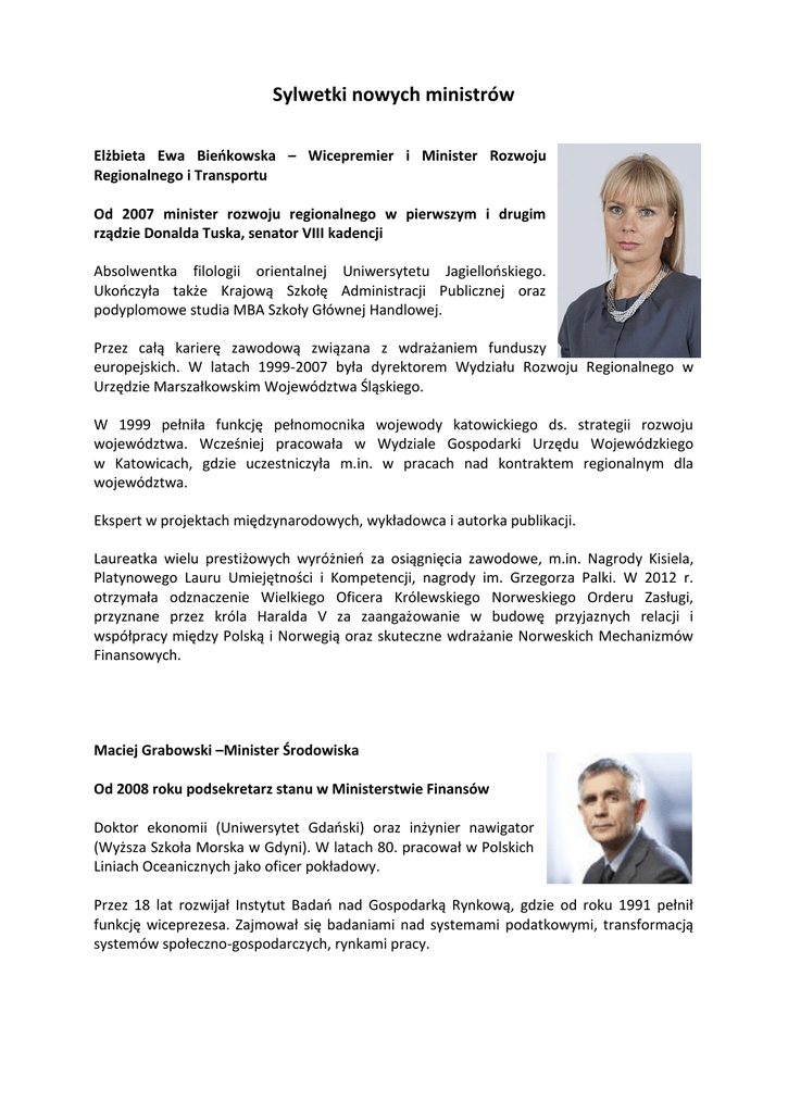Sylwetki nowych ministrów Elżbieta Ewa Bieńkowska – Wicepremier i Minister Rozwoju Regionalnego i Transportu Od 2007 minister rozwoju regionalnego w pierwszym i drugim rządzie Donalda Tuska, senator VIII kadencji Absolwentka filologii orientalnej Uniwersytetu Jagiellońskiego. Ukończyła także Krajową Szkołę Administracji Publicznej oraz podyplomowe studia MBA Szkoły Głównej Handlowej. Przez całą karierę zawodową związana z wdrażaniem funduszy europejskich. W latach 1999-2007 była dyrektorem Wydziału Rozwoju Regionalnego w Urzędzie Marszałkowskim Województwa Śląskiego. W 1999 pełniła funkcję pełnomocnika wojewody katowickiego ds. strategii rozwoju województwa. Wcześniej pracowała w Wydziale Gospodarki Urzędu Wojewódzkiego w Katowicach, gdzie uczestniczyła m.in. w pracach nad kontraktem regionalnym dla województwa. Ekspert w projektach międzynarodowych, wykładowca i autorka publikacji. Laureatka wielu prestiżowych wyróżnień za osiągnięcia zawodowe, m.in. Nagrody Kisiela, Platynowego Lauru Umiejętności i Kompetencji, nagrody im. Grzegorza Palki. W 2012 r. otrzymała odznaczenie Wielkiego Oficera Królewskiego Norweskiego Orderu Zasługi, przyznane przez króla Haralda V za zaangażowanie w budowę przyjaznych relacji i współpracy między Polską i Norwegią oraz skuteczne wdrażanie Norweskich Mechanizmów Finansowych. Maciej Grabowski –Minister Środowiska Od 2008 roku podsekretarz stanu w Ministerstwie Finansów Doktor ekonomii (Uniwersytet Gdański) oraz inżynier nawigator (Wyższa Szkoła Morska w Gdyni). W latach 80. pracował w Polskich Liniach Oceanicznych jako oficer pokładowy. Przez 18 lat rozwijał Instytut Badań nad Gospodarką Rynkową, gdzie od roku 1991 pełnił funkcję wiceprezesa. Zajmował się badaniami nad systemami podatkowymi, transformacją systemów społeczno-gospodarczych, rynkami pracy. W latach 1994-2000 prowadził wykłady na Uniwersytecie Gdańskim. Rozwijał Polskie Forum Strategii Lizbońskiej oraz Polskie Forum Obywatelskie. Brał udział w pracach nad przygotowaniem Strategii Rozwoju Kraju 2007-2015. Od marca 2008 roku w Zespole Doradców Strategicznych Prezesa Rady Ministrów. W listopadzie 2008 roku został powołany na podsekretarza stanu w Ministerstwie Finansów, gdzie jest odpowiedzialny za system podatkowy. W latach 2011-2012 członek Komisji Nadzoru Finansowego, a od lutego 2013 Główny Rzecznik Dyscypliny Finansów Publicznych. Mateusz Szczurek – Minister Finansów Główny ekonomista ING Group na Europę Środkową i Wschodnią. W 1997 uzyskał tytuł Master of Arts z ekonomii międzynarodowej University of Sussex. W 1998 i 2007 odbył kursy ekonometrii International Center for Money and Banking Studies w Genewie i Londynie. W latach 19941997 brał udział we wspólnym programie i uzyskał tytuł Bachelor of Arts Uniwersytetu Warszawskiego i Columbia University in the City of New York, School of International and Public Affairs. Od 2011 był głównym ekonomistą ING Group na Europę Środkową i Wschodnią. W latach 1997-2011 ekonomista ING Barings, potem główny ekonomista ING Banku Śląskiego. Wykładowca ekonomii w Szkole Głównej Handlowej w Warszawie, University of Sussex i Goethe Business School (Frankfurt). W latach 2003-2005 współzałożyciel i prezes Towarzystwa Absolwentów Uniwersytetów Brytyjskich. Członek Towarzystwa Ekonomistów Polskich. Joanna Kluzik - Rostkowska – Minister Edukacji Narodowej Posłanka na Sejm VI i VII kadencji. Minister pracy i polityki społecznej w rządzie Jarosława Kaczyńskiego. Była wiceminister rozwoju regionalnego, była przewodnicząca klubu parlamentarnego Polska Jest Najważniejsza, założycielka partii PJN. Pracuje w sejmowej komisji polityki społecznej i rodziny oraz komisji spraw zagranicznych. Jest przedstawicielem polskiego parlamentu w Zgromadzeniu Parlamentarnym OBWE oraz szefową polsko-afgańskiej grupy parlamentarnej. Lena Kolarska-Bobińska – Minister Nauki i Szkolnictwa Wyższego Od 2009 roku poseł do Parlamentu Europejskiego. Ukończyła studia na Wydziale Socjologii Uniwersytetu Warszawskiego. W 1993 uzyskała tytuł profesora nauk humanistycznych. Jest członkiem Komitetu Socjologii Polskiej Akademii Nauk oraz Rady Naukowej Instytutu Studiów Społecznych Uniwersytetu Warszawskiego. W latach 1991-1997 była dyrektorem Centrum Badania Opinii Społecznej. Od 1997 sprawowała funkcję dyrektora Instytutu Spraw Publicznych. Doradzała prezydentom Rzeczpospolitej Polskiej: w latach 1992-1995 Lechowi Wałęsie (Komitet Ekonomiczny), w 2001-2005 Aleksandrowi Kwaśniewskiemu, a także pełnomocnikowi rządu ds. negocjacji członkowskich z Unią Europejską. Była m.in. członkiem Rady Integracji Europejskiej przy premierze. W latach 2003-2006 doradzała też komisarzowi UE ds. nauki i badań. Odznaczona m.in. Krzyżem Oficerskim Orderu Odrodzenia Polski, a także „Idre National du Mérite” - odznaczeniem przyznawanym przez prezydenta Francji. Jest autorem ponad 200 prac naukowych: książek, artykułów, opracowań i badań naukowych publikowanych w prasie polskiej i zagranicznej. Komentator mediów polskich i zagranicznych. Andrzej Biernat – Minister Sportu i Turystyki polski polityk, nauczyciel, poseł na Sejm V, VI i VII kadencji. Ukończył studia na Wydziale Pedagogiki Wyższej Szkoły Pedagogicznej w Częstochowie z tytułem zawodowym magistra pedagogiki. Odbył podyplomowe studia w Akademii Wychowania Fizycznego w Poznaniu w zakresie organizacji i zarządzania sportem. Od 1988 do 1996 pracował jako nauczyciel w Szkole Podstawowej w Konstantynowie Łódzkim. Był jednym z współtwórców, a do 1996 dyrektorem Centrum Sportu i Rekreacji w tym mieście. Od 2005 poseł z ramienia Platformy Obywatelskiej. Zastępca przewodniczącego Komisji Kultury Fizycznej, Turystyki i Sportu. Wcześniej przewodniczący stałej podkomisji ds. przygotowań Polski do organizacji mistrzostw Europy w piłce nożnej "UEFA EURO 2012