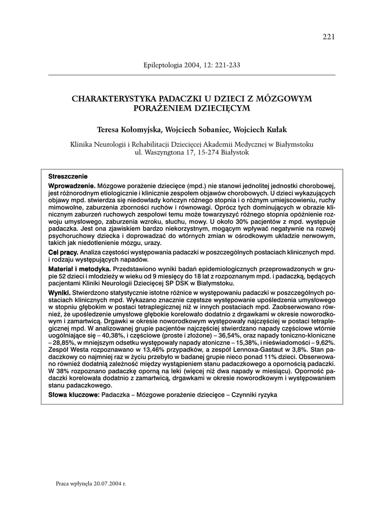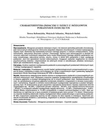 221 Epileptologia 2004, 12: 221-233 CHARAKTERYSTYKA PADACZKI U DZIECI Z MÓZGOWYM PORAŻENIEM DZIECIĘCYM Teresa Kołomyjska, Wojciech Sobaniec, Wojciech Kułak Klinika Neurologii i Rehabilitacji Dziecięcej Akademii Medycznej w Białymstoku ul. Waszyngtona 17, 15-274 Białystok Streszczenie Wprowadzenie. Mózgowe porażenie dziecięce (mpd.) nie stanowi jednolitej jednostki chorobowej, jest różnorodnym etiologicznie i klinicznie zespołem objawów chorobowych. U dzieci wykazujących objawy mpd. stwierdza się niedowłady kończyn różnego stopnia i o różnym umiejscowieniu, ruchy mimowolne, zaburzenia zborności ruchów i równowagi. Oprócz tych dominujących w obrazie klinicznym zaburzeń ruchowych zespołowi temu może towarzyszyć różnego stopnia opóźnienie rozwoju umysłowego, zaburzenia wzroku, słuchu, mowy. U około 30% pacjentów z mpd. występuje padaczka. Jest ona zjawiskiem bardzo niekorzystnym, mogącym wpływać negatywnie na rozwój psychoruchowy dziecka i doprowadzać do wtórnych zmian w ośrodkowym układzie nerwowym, takich jak niedotlenienie mózgu, urazy. Cel pracy pracy.. Analiza częstości występowania padaczki w poszczególnych postaciach klinicznych mpd. i rodzaju występujących napadów. Materiał i metodyka. Przedstawiono wyniki badań epidemiologicznych przeprowadzonych w grupie 52 dzieci i młodzieży w wieku od 9 miesięcy do 18 lat z rozpoznanym mpd. i padaczką, będących pacjentami Kliniki Neurologii Dziecięcej SP DSK w Białymstoku. Wyniki. Stwierdzono statystycznie istotne różnice w występowaniu padaczki w poszczególnych postaciach klinicznych mpd. Wykazano znacznie częstsze występowanie upośledzenia umysłowego w stopniu głębokim w postaci tetraplegicznej niż w innych postaciach mpd. Zaobserwowano również, że upośledzenie umysłowe głębokie korelowało dodatnio z drgawkami w okresie noworodkowym i zamartwicą. Drgawki w okresie noworodkowym występowały najczęściej w postaci tetraplegicznej mpd. W analizowanej grupie pacjentów najczęściej stwierdzano napady częściowe wtórnie uogólniające się – 40,38%, i częściowe (proste i złożone) – 36,54%, oraz napady toniczno-kloniczne – 28,85%, w mniejszym odsetku występowały napady atoniczne – 15,38%, i nieświadomości – 9,62%. Zespół Westa rozpoznawano w 13,46% przypadków, a zespół Lennoxa-Gastaut w 3,8%. Stan padaczkowy co najmniej raz w życiu przebyło w badanej grupie nieco ponad 11% dzieci. Obserwowano również dodatnią zależność między wystąpieniem stanu padaczkowego a opornością padaczki. W 38% rozpoznano padaczkę oporną na leki (więcej niż dwa napady w miesiącu). Oporność padaczki korelowała dodatnio z zamartwicą, drgawkami w okresie noworodkowym i występowaniem stanu padaczkowego. Słowa kluczowe: Padaczka – Mózgowe porażenie dziecięce – Czynniki ryzyka Praca wpłynęła 20.07.2004 r.
