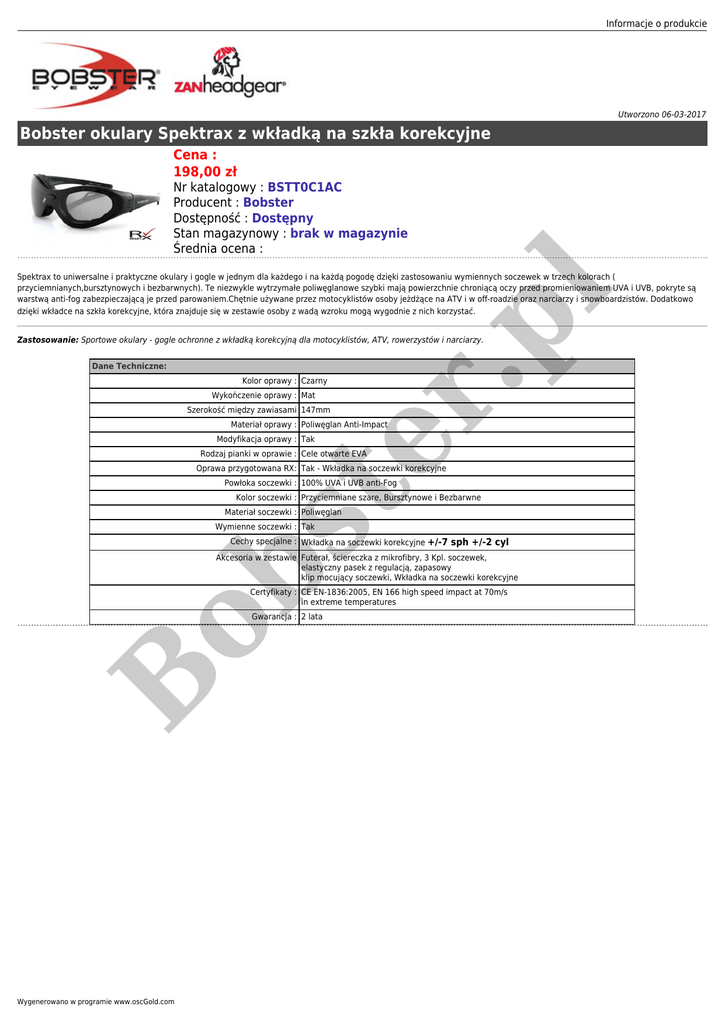 Informacje o produkcie Utworzono 06-03-2017 Bobster okulary Spektrax z wkładką na szkła korekcyjne Cena : 198,00 zł Nr katalogowy : BSTT0C1AC Producent : Bobster Dostępność : Dostępny Stan magazynowy : brak w magazynie Średnia ocena : .p l Spektrax to uniwersalne i praktyczne okulary i gogle w jednym dla każdego i na każdą pogodę dzięki zastosowaniu wymiennych soczewek w trzech kolorach ( przyciemnianych,bursztynowych i bezbarwnych). Te niezwykle wytrzymałe poliwęglanowe szybki mają powierzchnie chroniącą oczy przed promieniowaniem UVA i UVB, pokryte są warstwą anti-fog zabezpieczającą je przed parowaniem.Chętnie używane przez motocyklistów osoby jeżdżące na ATV i w off-roadzie oraz narciarzy i snowboardzistów. Dodatkowo dzięki wkładce na szkła korekcyjne, która znajduje się w zestawie osoby z wadą wzroku mogą wygodnie z nich korzystać. Zastosowanie: Sportowe okulary - gogle ochronne z wkładką korekcyjną dla motocyklistów, ATV, rowerzystów i narciarzy. Dane Techniczne: Kolor oprawy : Czarny er Wykończenie oprawy : Mat Szerokość między zawiasami 147mm Materiał oprawy : Poliwęglan Anti-Impact Modyfikacja oprawy : Tak Rodzaj pianki w oprawie : Cele otwarte EVA Oprawa przygotowana RX: Tak - Wkładka na soczewki korekcyjne st Powłoka soczewki : 100% UVA i UVB anti-Fog Kolor soczewki : Przyciemniane szare, Bursztynowe i Bezbarwne Materiał soczewki : Poliwęglan Wymienne soczewki : Tak Cechy specjalne : Wkładka na soczewki korekcyjne +/-7 sph +/-2 cyl ob Akcesoria w zestawie Futerał, ściereczka z mikrofibry, 3 Kpl. soczewek, elastyczny pasek z regulacją, zapasowy klip mocujący soczewki, Wkładka na soczewki korekcyjne Certyfikaty : CE EN-1836:2005, EN 166 high speed impact at 70m/s in extreme temperatures B Gwarancja : 2 lata Wygenerowano w programie www.oscGold.com