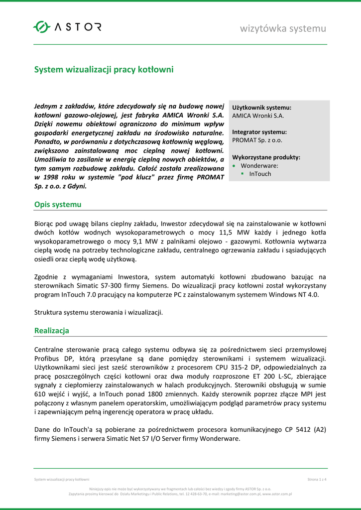 wizytówka systemu System wizualizacji pracy kotłowni Jednym z zakładów, które zdecydowały się na budowę nowej kotłowni gazowo-olejowej, jest fabryka AMICA Wronki S.A. Dzięki nowemu obiektowi ograniczono do minimum wpływ gospodarki energetycznej zakładu na środowisko naturalne. Ponadto, w porównaniu z dotychczasową kotłownią węglową, zwiększono zainstalowaną moc cieplną nowej kotłowni. Umożliwia to zasilanie w energię cieplną nowych obiektów, a tym samym rozbudowę zakładu. Całość została zrealizowana w 1998 roku w systemie "pod klucz" przez firmę PROMAT Sp. z o.o. z Gdyni. Użytkownik systemu: AMICA Wronki S.A. Integrator systemu: PROMAT Sp. z o.o. Wykorzystane produkty: Wonderware: InTouch Opis systemu Biorąc pod uwagę bilans cieplny zakładu, Inwestor zdecydował się na zainstalowanie w kotłowni dwóch kotłów wodnych wysokoparametrowych o mocy 11,5 MW każdy i jednego kotła wysokoparametrowego o mocy 9,1 MW z palnikami olejowo - gazowymi. Kotłownia wytwarza ciepłą wodę na potrzeby technologiczne zakładu, centralnego ogrzewania zakładu i sąsiadujących osiedli oraz ciepłą wodę użytkową. Zgodnie z wymaganiami Inwestora, system automatyki kotłowni zbudowano bazując na sterownikach Simatic S7-300 firmy Siemens. Do wizualizacji pracy kotłowni został wykorzystany program InTouch 7.0 pracujący na komputerze PC z zainstalowanym systemem Windows NT 4.0. Struktura systemu sterowania i wizualizacji. Realizacja Centralne sterowanie pracą całego systemu odbywa się za pośrednictwem sieci przemysłowej Profibus DP, którą przesyłane są dane pomiędzy sterownikami i systemem wizualizacji. Użytkownikami sieci jest sześć sterowników z procesorem CPU 315-2 DP, odpowiedzialnych za pracę poszczególnych części kotłowni oraz dwa moduły rozproszone ET 200 L-SC, zbierające sygnały z ciepłomierzy zainstalowanych w halach produkcyjnych. Sterowniki obsługują w sumie 610 wejść i wyjść, a InTouch ponad 1800 zmiennych. Każdy sterownik poprzez złącze MPI jest połączony z własnym panelem operatorskim, umożliwiającym podgląd parametrów pracy systemu i zapewniającym pełną ingerencję operatora w pracę układu. Dane do InTouch'a są pobierane za pośrednictwem procesora komunikacyjnego CP 5412 (A2) firmy Siemens i serwera Simatic Net S7 I/O Server firmy Wonderware. System wizualizacji pracy kotłowni Niniejszy opis nie może być wykorzystywany we fragmentach lub całości bez wiedzy i zgody firmy ASTOR Sp. z o.o. Zapytania prosimy kierować do Działu Marketingu i Public Relations, tel. 12 428-63-70, e-mail: [email protected], www.astor.com.pl Strona 1 z 4 wizytówka systemu Podstawowym zadaniem wizualizacji jest monitorowanie pracy poszczególnych urządzeń. System dostarcza wszelkich informacji o procesie, takich jak wartości temperatur i ciśnień, aktualna moc cieplna kotła, zużycie oleju i gazu, blokady i zabezpieczenia oraz podstawowe parametry całego układu kotłów, pompowni wody, węzła c.o. i c.w.u. oraz instalacji paliwowej. System wizualizacji daje operatorowi pełną kontrolę nad pracą całej instalacji. Rysunek 1. Wizualizacja pracy kotła. Operator ma możliwość konfigurowania poszczególnych regulatorów PID, nastawy wartości zadanych regulowanych parametrów sieci ciepłowniczych oraz załączania i wyłączania poszczególnych obiegów i zestawów pompowych. Jednym z ważniejszych zadań systemu sterowania jest optymalizacja pracy kotłów. System porównuje aktualne zapotrzebowanie mocy cieplnej z wydajnością kotłów pracujących i w zależności od zdefiniowanych przez operatora progów, odstawia lub wprowadza kolejny kocioł znajdujący się w gorącej rezerwie. System sterowania pozwala również na ograniczenie mocy poszczególnych kotłów. Ma to szczególne znaczenie w przypadku pracy na gazie, gdyż zabezpiecza Inwestora przed przekroczeniem zamówionej mocy. W obiegach ciepłowniczych (pompowni wody) zastosowano algorytm do automatycznej zmiany konfiguracji pompy wiodącej. Zestaw trzech pomp obiegowych jest sterowany jednym falownikiem przypisanym w danej chwili do pompy podstawowej. Głównym zadaniem algorytmu jest równomierne zużycie poszczególnych pomp w zestawie. Operator ma możliwość zadania czasu, po którym nastąpi zmiana pompy podstawowej (pracującej na falowniku). W trybie pracy ręcznej można załączyć wybraną pompę bądź przy zasilaniu bezpośrednio z sieci, bądź z falownika. System wizualizacji pracy kotłowni Niniejszy opis nie może być wykorzystywany we fragmentach lub całości bez wiedzy i zgody firmy ASTOR Sp. z o.o. Zapytania prosimy kierować do Działu Marketingu i Public Relations, tel. 12 428-63-70, e-mail: [email protected], www.astor.com.pl Strona 2 z 4 wizytówka systemu Oprócz monitorowania i sterowania, system wizualizacji spełnia szereg innych funkcji ułatwiających obsługę i analizę procesów zachodzących w kotłowni. Z punktu widzenia bezpiecznej pracy kotłowni, ważnym zagadnieniem jest kontrola dostępu poszczególnych operatorów do ingerencji w układ sterowania (załączanie /wyłączanie poszczególnych urządzeń, konfigurowanie regulatorów PID, itd.). Tylko operator z najwyższymi uprawnieniami ma pełny dostęp do wszystkich parametrów konfiguracyjnych systemu sterowania i wizualizacji. Rysunek 2. Okno pompowni wody. Aplikacja umożliwia wyświetlanie, zapisywanie oraz drukowanie informacji o zaistniałych w systemie zdarzeniach i alarmach. Zastosowane mechanizmy grupowania alarmów znacznie ułatwiają ich przeglądanie i analizę. W razie potrzeby operator może sięgnąć do alarmów historycznych. W przypadku pojawienia się nowego alarmu pojawia się okno informujące operatora o tym zdarzeniu. W czasie trwania alarmu, na dolnym menu (przełączającym poszczególne części kotłowni) miga wykrzyknik informujący, w jakiej grupie wystąpił alarm. Kliknięcie na danym symbolu powoduje przejście do okna alarmo