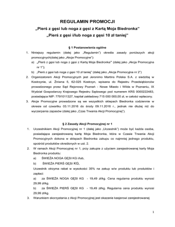 REGULAMIN PROMOCJI „Pierś z gęsi lub noga z gęsi z Kartą Moja Biedronka” „Pierś z gęsi i/lub noga z gęsi 10 zł taniej” § 1 Postanowienia ogólne 1. Niniejszy regulamin (dalej jako „Regulamin”) określa zasady poniższych akcji promocyjnych(dalej jako „Akcje Promocyjne”): a) „Pierś z gęsi lub noga z gęsi z Kartą Moja Biedronka” (dalej jako „Akcja Promocyjna nr 1”); b) „Pierś z gęsi lub noga z gęsi 10 zł taniej” (dalej jako „Akcja Promocyjna nr 2”) 2. Organizatorem Akcji Promocyjnych jest Jeronimo Martins Polska S.A. z siedzibą w Kostrzynie, ul. Żniwna 5, 62-025 Kostrzyn, wpisana do Rejestru Przedsiębiorców prowadzonego przez Sąd Rejonowy Poznań - Nowe Miasto i Wilda w Poznaniu, IX Wydział Gospodarczy Krajowego Rejestru Sądowego pod numerem KRS 0000222483, posiadająca NIP: 7791011327, kapitał zakładowy 715 000 000,00 zł, w całości wpłacony. 3. Akcje Promocyjne prowadzone są we wszystkich sklepach Biedronka codziennie w okresie od czwartku 03.11.2016 do środy 09.11.2016 r., jednak nie dłużej niż do wyczerpania zapasów (dalej jako „Czas Trwania Akcji Promocyjnej”). § 2 Zasady Akcji Promocyjnej nr 1 1. Uczestnikiem Akcji Promocyjnej nr 1 (dalej jako „Uczestnik”) może być każda osoba, posiadająca zarejestrowaną kartę Moja Biedronka, która w Czasie Trwania Akcji Promocyjnych dokona w sklepach Biedronka zakupu co najmniej jednego produktu, spośród produktów określonych w ust. 2. 2. W ramach Akcji Promocyjnej nr 1, przy zakupie z użyciem zarejestrowanej karty Moja Biedronka produktu: a) ŚWIEŻA NOGA GĘSI KG i/lub, b) ŚWIEŻA PIERŚ GĘSI KG, Uczestnik otrzyma rabat w wysokości 35% na zakup w/w produktu lub produktów i zapłaci: a) za ŚWIEŻA NOGA GĘSI KG - 19,49 zł/kg. Cena regularna produktu wynosi 29,99 zł/kg. b) za ŚWIEŻA PIERŚ GĘSI KG - 19,49 zł/kg. Regularna cena produktu wynosi 29,99 zł/kg. 3. Warunkiem skorzystania z Akcji Promocyjnej jest okazanie kasjerowi zarejestrowanej 1 karty Moja Biedronka przed dokonaniem wyboru płatności. Karta Moja Biedronka zostanie zeskanowana przez kasjera. 4. W przypadku reklamacji lub zwrotu towaru, przy zakupie którego Uczestnik skorzystał z rabatu, Uczestnik otrzyma wyłącznie zwrot ceny rzeczywiście uiszczonej – tj. ceny regularnej pomniejszonej o rabat. § 3 Zasady Akcji Promocyjnej nr 2 1. Uczestnikiem Akcji Promocyjnej nr 2 (dalej jako „Uczestnik”) może być każda osoba, która w Czasie Trwania Akcji Promocyjnych dokona w sklepach Biedronka jednorazowego zakupu minimum 1 kg co najmniej jednego produktu: ŚWIEŻA NOGA GĘSI KG i/lub ŚWIEŻA PIERŚ GĘSI KG. 2. W ramach Akcji Promocyjnej nr 2 przy jednorazowym zakupie minimum 1 kg co najmniej jednego z produktów wymienionych w ust. 1 powyżej, Uczestnik otrzyma jednorazowy rabat w wysokości 10,00 zł (słownie: dziesięć złotych) na zakup tych produktów. 3. W przypadku jednorazowego zakupu obu produktów wskazanych w ust. 1 powyżej, dla potrzeb ustalenia limitu 1 kg, waga obu zakupionych produktów sumuje się. 4. Rabat, o którym mowa w ust 2 powyżej nie łączy się z innymi promocjami na produkty ŚWIEŻA NOGA GĘSI KG i/lub ŚWIEŻA PIERŚ GĘSI KG, w szczególności nie łączy się z Akcją Promocyjną nr 1. 5. W przypadku reklamacji lub zwrotu towaru, przy zakupie którego Uczestnik skorzystał z rabatu, Uczestnik otrzyma wyłącznie zwrot ceny rzeczywiście uiszczonej – tj. ceny regularnej pomniejszonej o rabat. §4 Reklamacje 1. W przypadku przeprowadzenia Akcji Promocyjnej niezgodnie z Regulaminem Uczestnikowi przysługuje prawo do złożenia reklamacji. 2. Reklamacja powinna zostać zgłoszona w terminie 30 dni od dnia skorzystania z Akcji Promocyjnej. 3. W celu usprawnienia procesu zgłaszania i rozpatrywania, reklamacja może zostać złożona w formie pisemnej na adres: Jeronimo Martins Polska S.A., ul. Żniwna 5, 62-025 Kostrzyn. 4. Składający reklamację powinien uwidocznić w jej treści swoje dane, tak aby kontakt z nim w celu poinformowania o wyniku postępowania reklamacyjnego był możliwy. 5. W celu usprawnienia postępowania reklamacyjnego składający reklamację powinien załączyć do reklamacji kserokopię dowodu zakupu produktu w sieci sklepów Biedronka. 6. Reklamacje będą rozpatrywane przez Organizatora. Uczestnik wnoszący reklamację zostanie poinformowany o jej rozstrzygnięciu w terminie 14 dni od jej otrzymania przez 2 Organizatora. Informacja o rozstrzygnięciu reklamacji zostanie przekazana Uczestnikowi w takiej formie, w jakiej zostało dokonane zgłoszenie reklamacyjne, tudzież w innej formie uzgodnionej pomiędzy Uczestnikiem a Organizatorem. 7. Organizator będzie przetwarzał dane osobowe Uczestnika zgłaszającego reklamację wyłącznie w związku z procedurą reklamacyjną. § 5 Postanowienia końcowe 1. Regulamin Akcji Promocyjnych dostępny jest w sklepach Biedronka oraz na stronie internetowej www.biedronka.pl. 2. Postanowienia Regulaminu podlegają przepisom prawa polskiego. W kwestiach nieuregulowanych Regulaminem zastosowanie mają przepisu kodeksu cywilnego oraz innych ustaw. 3. Wszelkie spory wynikłe z tytułu wykonania zobowiązań związanych z niniejszymi Akcjami Promocyjnymi będą rozstrzygane przez właściwy sąd powszechny. 3