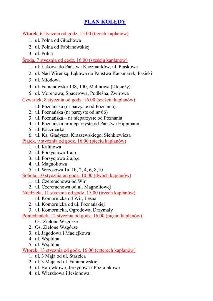 PLAN KOLĘDY Wtorek, 6 stycznia od godz. 15.00 (trzech kapłanów) 1. ul. Polna od Głuchowa 2. ul. Polna od Fabianowskiej 3. ul. Polna Środa, 7 stycznia od godz. 16.00 (sześciu kapłanów) 1. ul. Łąkowa do Państwa Kaczmarków, ul. Piaskowa 2. ul. Nad Wirenką, Łąkowa do Państwa Kaczmarek, Pasieki 3. ul. Miodowa 4. ul. Fabianowska 138, 140, Malinowa (2 księży) 5. ul. Morenowa, Spacerowa, Podleśna, Żwirowa Czwartek, 8 stycznia od godz. 16.00 (sześciu kapłanów) 1. ul. Poznańska (nr parzyste od Poznania). 2. ul. Poznańska (nr parzyste od nr 66) 3. ul. Poznańska – nr nieparzyste od Poznania 4. ul. Poznańska nr nieparzyste od Państwa Hippmann 5. ul. Kaczmarka 6. ul. Ks. Gładysza, Kraszewskiego, Sienkiewicza Piątek, 9 stycznia od godz. 16.00 (pięciu kapłanów) 1. ul. Kalinowa 2. ul. Forsycjowa 1 a,b 3. ul. Forsycjowa 2 a,b,c 4. ul. Magnoliowa 5. ul. Wrzosowa 1a, 1b, 2, 4, 6, 8,10 Sobota, 10 stycznia od godz. 10.00 (dwóch kapłanów) 1. ul. Czeremchowa od Wir 2. ul. Czeremchowa od ul. Magnoliowej Niedziela, 11 stycznia od godz. 15.00 (trzech kapłanów) 1. ul. Komornicka od Wir, Leśna 2. ul. Komornicka od ul. Poznańskiej 3. ul. Komornicka, Ogrodowa, Drzymały Poniedziałek, 12 stycznia od godz. 16.00 (pięciu kapłanów) 1. Os. Zielone Wzgórze 2. Os. Zielone Wzgórze 3. ul. Jagodowa i Maciejkowa 4. ul. Wspólna 5. ul. Wspólna Wtorek, 13 stycznia od godz. 16.00 (czterech kapłanów) 1. ul. 3 Maja od ul. Staszica 2. ul. 3 Maja od ul. Fabianowskiej 3. ul. Borówkowa, Jerzynowa i Poziomkowa 4. ul. Wierzbowa i Jesionowa