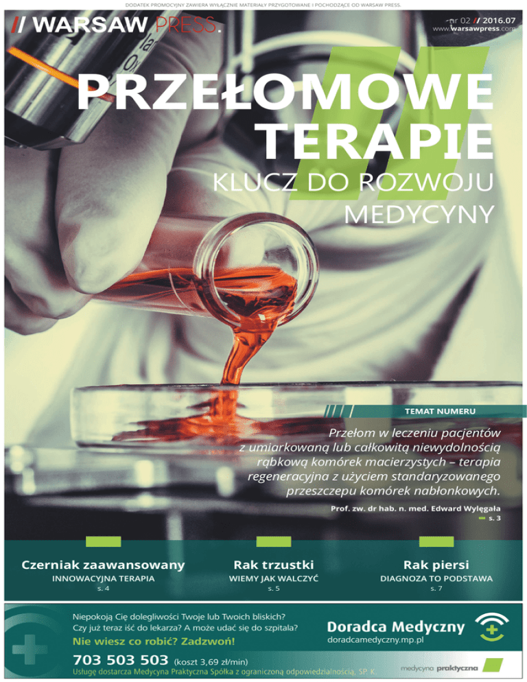 DODATEK PROMOCYJNY ZAWIERA WYŁĄCZNIE MATERIAŁY PRZYGOTOWANE I POCHODZĄCE OD WARSAW PRESS. nr 02 // 2016.07 www.warsawpress.com Przełomowe terapie Klucz do rozwoju medycyny TEMAT NUMERU Przełom w leczeniu pacjentów z umiarkowaną lub całkowitą niewydolnością rąbkową komórek macierzystych – terapia regeneracyjna z użyciem standaryzowanego przeszczepu komórek nabłonkowych. Prof. zw. dr hab. n. med. Edward Wylęgała s. 3 Czerniak zaawansowany Rak trzustki Rak piersi Innowacyjna terapia Wiemy jak walczyć Diagnoza to podstawa s. 4 s. 5 s. 7 DODATEK PROMOCYJNY ZAWIERA WYŁĄCZNIE MATERIAŁY PRZYGOTOWANE I POCHODZĄCE OD WARSAW PRESS. 2 Zdaniem eksperta Współczesna medycyna przełamuje wiele barier, które dotychczas wydawały się nieprzekraczalne. Innowacyjność w medycynie Prof. dr hab. n. med. Marek Krawczyk – Rektor Warszawskiego Uniwersytetu Medycznego – przybliża temat innowacji, jako synonimu nowoczesnego Państwa i znaczenia innowacyjności w medycynie. cego świata. To także punkt wyjścia innowacyjności, której podstawę stanowią badania. Ciągłe doskonalenie siebie, swojej wiedzy, obowiązek kształcenia się, rozwijania medycyny i przekazywania światu medycznemu osiągnięć są wpisane w zawód lekarza. Naukowcy dążą do tego, żeby wyniki ich prac znalazły zastosowanie w praktyce. Dobrym przykładem może być branża farmaceutyczna, w której przedsiębiorstwa są zainteresowane wdrażaniem nowych rozwiązań, podejmują działania, żeby nowe leki poszerzały dostępność terapii, pomagały ratować życie pacjentów i przynosiły dochód. O rozwoju w poszczególnych dyscyplinach nauki decydują wynalazki. Gdyby nie wielkie odkrycia naukowe dzisiaj świat wyglądałby zupełnie inaczej. Spróbujmy wyobrazić sobie rzeczywistość bez wynalazków i osiągnięć uhonorowanych Nagrodą Nobla. Wymienię kilka wydarzeń z początku XX wieku, które zmieniły medycynę: wynalezienie szczepionki przeciw błonicy, która ocaliła życie wielu ludziom, odkrycie promieni X, zastosowanie radu wydzielonego przez Marię Skłodowską-Curie i wykorzystanie go do leczenia choroby nowotworowej, czy skonstruowanie aparatury do badań elektrokardiograficznych. Bez tych osiągnięć współczesny lekarz nie potrafiłby pracować. Innowacja u podstaw Motorem postępu w każdej dziedzinie jest ciekawość, chęć zrozumienia otaczają- Współczesna medycyna przełamuje wiele barier, które dotychczas wydawały się nieprzekraczalne. Przyjrzymy się przykładom, takim jak np. stworzenie sztucznego ucha za pomocą drukarki 3D, czy wyhodowanie w laboratorium trójwymiarowego fragmentu ludzkiej wątroby. To przełomowe wynalazki, które rewolucjonizują medycynę XXI wieku. Przełomowe technologie Jeżeli chcemy żyć długo i w dobrym zdrowiu, to musimy mieć między innymi dostęp do skutecznej i innowacyjnej medycyny, która potrafi sprostać wciąż nowym wyzwaniom cywilizacyjnym. Opracowanie przełomowych rozwiązań medycznych opiera się na poszukiwaniu nowych molekuł i tworzeniu nowoczesnych technologii. W naukach medycznych nieodłączną cechą rozwoju i każdego odkrycia jest interdyscyplinarność. Obecnie nauki biomedyczne stoją przed nowymi wyzwaniami. Starzenie się populacji, choroby cywilizacyjne wywołane zmianami w środowisku człowieka, to problemy, z którymi musimy się zmierzyć. Niezbędny jest dalszy rozwój metod obrazowania i nowe materiały biomedyczne. Musimy umieć w przyszłości zajrzeć do pojedynczej komórki, a do tego konieczne są jeszcze bardziej udoskonalone metody obrazowania. Medycyna molekularna pozwala już na opracowanie nowych leków na podstawie badań genetycznych. To początki medycyny spersonalizowanej. Technika operacji z minimalnego dostępu daje dziś szansę szerszej grupie pacjentów i minimalizuje komplikacje związane z tradycyjnym zabiegiem kardiochirurgicznym. Nowoczesna technika wkroczyła również do ortopedii. Stosowane do niedawna metody zastąpiły: materiały kościozastępcze, materiały biowchłanialne, ruchome stawy z mikroprocesorami, techniki 3D. Rozwój robotyki pozwala na przeprowadzenie zabiegu z najwyższą dokładnością. Motorem postępu w każdej dziedzinie jest ciekawość, chęć zrozumienia otaczającego świata. To także punkt wyjścia innowacyjności, której podstawę stanowią badania. Terapie celowane przeżywają nieprawdopodobne tempo rozwoju w onkologii. Co roku powstają nowe leki, wyspecjalizowane w walce z określonego rodzaju nowotworami. Znajomość budowy komórek różnych typów nowotworów stwarza możliwość konstruowania leków dopasowanych do nich jak klucz do zamka. Interesującym przykładem terapii celowanych jest zastosowanie przeciwciał monoklonalnych. W stomatologii przyszłością jest nanotechnologia, która pozwoli zwiększyć trwałość i skuteczność leczenia. Innowacyjne techniki zmieniły również obraz współczesnej kardiologii. Za pomocą nieinwazyjnej tomografii komputerowej czy nieinwazyjnej koronarografii uzyskujemy dane, które pozwalają uprościć i skrócić diagnostykę. Wykonanie skutecznej operacji kardiologicznej bez otwierania klatki piersiowej wydawało się kiedyś mrzonką. Healthcare Project’s Director: Joanna Lewandowska, [email protected] www.duszekstudio.com Nowoczesne techniki w medycynie Redakcja: Lilianna Miśkiewicz Do innowacji w medycynie można zaliczyć także symulacje, które pozwalają szkolić studentów i lekarzy. Dzięki symulacjom operacji można opanować umiejętności ratujące życie bez narażania pacjentów. W Warszawskim Uniwersytecie Medycznym powstaje nowoczesne Centrum Symulacji Medycznych, które będzie służyło dydaktyce i prowadzeniu badań naukowych. Innowacje są synonimem nowoczesnego państwa, stanowią koło zamachowe rozwoju gospodarki. Kraje, które poradzą sobie z rozwojem innowacyjności, będą się bogaciły, a standard życia ich obywateli będzie wzrastał. Wszyscy chcemy, że