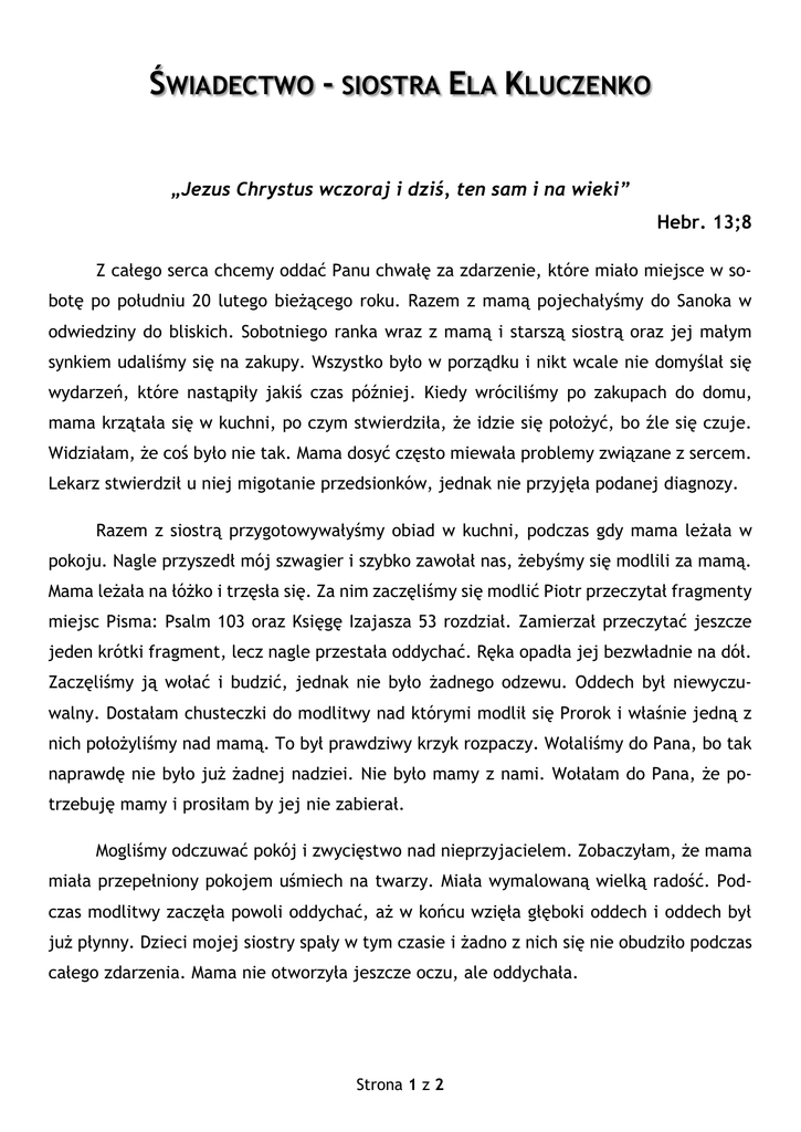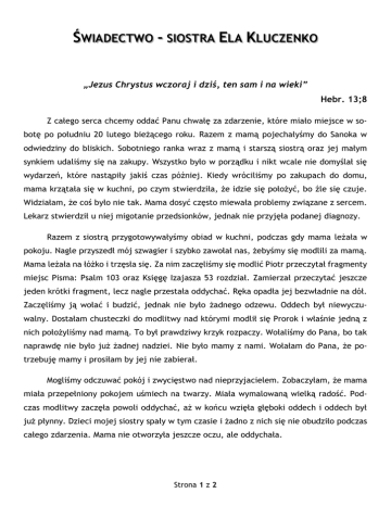 ŚWIADECTWO - SIOSTRA ELA KLUCZENKO „Jezus Chrystus wczoraj i dziś, ten sam i na wieki” Hebr. 13;8 Z całego serca chcemy oddać Panu chwałę za zdarzenie, które miało miejsce w sobotę po południu 20 lutego bieżącego roku. Razem z mamą pojechałyśmy do Sanoka w odwiedziny do bliskich. Sobotniego ranka wraz z mamą i starszą siostrą oraz jej małym synkiem udaliśmy się na zakupy. Wszystko było w porządku i nikt wcale nie domyślał się wydarzeń, które nastąpiły jakiś czas później. Kiedy wróciliśmy po zakupach do domu, mama krzątała się w kuchni, po czym stwierdziła, że idzie się położyć, bo źle się czuje. Widziałam, że coś było nie tak. Mama dosyć często miewała problemy związane z sercem. Lekarz stwierdził u niej migotanie przedsionków, jednak nie przyjęła podanej diagnozy. Razem z siostrą przygotowywałyśmy obiad w kuchni, podczas gdy mama leżała w pokoju. Nagle przyszedł mój szwagier i szybko zawołał nas, żebyśmy się modlili za mamą. Mama leżała na łóżko i trzęsła się. Za nim zaczęliśmy się modlić Piotr przeczytał fragmenty miejsc Pisma: Psalm 103 oraz Księgę Izajasza 53 rozdział. Zamierzał przeczytać jeszcze jeden krótki fragment, lecz nagle przestała oddychać. Ręka opadła jej bezwładnie na dół. Zaczęliśmy ją wołać i budzić, jednak nie było żadnego odzewu. Oddech był niewyczuwalny. Dostałam chusteczki do modlitwy nad którymi modlił się Prorok i właśnie jedną z nich położyliśmy nad mamą. To był prawdziwy krzyk rozpaczy. Wołaliśmy do Pana, bo tak naprawdę nie było już żadnej nadziei. Nie było mamy z nami. Wołałam do Pana, że potrzebuję mamy i prosiłam by jej nie zabierał. Mogliśmy odczuwać pokój i zwycięstwo nad nieprzyjacielem. Zobaczyłam, że mama miała przepełniony pokojem uśmiech na twarzy. Miała wymalowaną wielką radość. Podczas modlitwy zaczęła powoli oddychać, aż w końcu wzięła głęboki oddech i oddech był już płynny. Dzieci mojej siostry spały w tym czasie i żadno z nich się nie obudziło podczas całego zdarzenia. Mama nie otworzyła jeszcze oczu, ale oddychała. Strona 1 z 2 W tym samym momencie, kiedy mój szwagier wyjrzał przez okno zobaczył stojącą tam karetkę. Akurat ktoś wezwał ją do sąsiadów. Było to dla nas zmaganiem, ponieważ nie wiedzieliśmy czy wezwać sanitariuszy, jednak nie zrobiliśmy tego. Po chwili mama otworzyła oczy i pytała dlaczego leży. Zupełnie nie pamiętała co się stało i gdzie jest. Zaczęła dopytywać się o tatę, który w tym czasie był w domu (około 800 km drogi od Sanoka) . Była zupełnie nieświadoma tego co się stało i mówiła, że wszystko ją piecze. Leżała bardzo wymęczona. Kiedy pochyliłam się nad mamą i powiedziałam jej co się stało łzy zaczęły spływać po jej policzkach. Powiedziała, że pamięta tylko jedną rzecz. Opowiedziała o tym jak szła pod rękę z białą postacią, po lśniących ulicach. Miała taki pokój i niczym się nie martwiła. Nie potrafiła opisać tego, co zobaczyła. Nagle ujrzała płaczącego tatę i usłyszała krzyk w oddali. Odwróciła się i poczuła coś takiego jakby wróciła z powrotem do ciała. To całe zdarzenie trwało może około 3-4 minut. Po jakichś 30 minutach mama wstała całkowicie zdrowa z łóżka i mogła robić wszystko. Wtedy dzieci się obudziły. Jakiś czas temu Oglądaliśmy świadectwo brata z Jeffersonville, któremu Bóg wrócił życie. Pomyślałam wtedy: Czy takie Reczy dzieją się tylko w Ameryce? Chciałabym czegoś takiego dożyć. Nie spodziewałam się, że kilka dni później będę mogła być świadkiem podobnej sytuacji. Tak bardzo się cieszymy, że Bóg jest ciągle Bogiem akcji i, że On manifestuje się w Swojej Oblubienicy. Tak jak Pan powiedział przez swojego Proroka, tak też działa w tych ostatecznych dniach. Niechbyśmy wszyscy weszli jeszcze głębiej w to cudowne Słowo i oddawali Panu chwałę za to jak działa pomiędzy nami. Justyna Kluczenko Strona 2 z 2