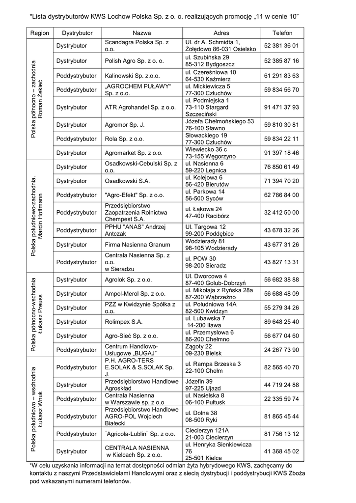 *Lista dystrybutorów KWS Lochow Polska Sp. z o. o. realizujących promocję „11 w cenie 10” Dystrybutor Nazwa Dystrybutor Scandagra Polska Sp. z o.o. Dystrybutor Polish Agro Sp. z o. o. Poddystrybutor Kalinowski Sp. z.o.o. Poddystrybutor „AGROCHEM PUŁAWY“ Sp. z o.o. Dystrybutor ATR Agrohandel Sp. z o.o. Dystrybutor Agromor Sp. J. Poddystrybutor Rola Sp. z o.o. Dystrybutor Agromarket Sp. z o.o. Dystrybutor Osadkowski-Cebulski Sp. z o.o. Dystrybutor Osadkowski S.A. Poddystrybutor "Agro-Efekt" Sp. z o.o. Poddystrybutor Dystrybutor Firma Nasienna Granum Poddystrybutor Centrala Nasienna Sp. z o.o. w Sieradzu Polska północno-wschodnia Łukasz Preuss Poddystrybutor Przedsiębiorstwo Zaopatrzenia Rolnictwa Chempest S.A. PPHU "ANAS" Andrzej Antczak Dystrybutor Agrolok Sp. z o.o. Dystrybutor Ampol-Merol Sp. z o.o. Dystrybutor PZZ w Kwidzynie Spółka z o.o. Dystrybutor Rolimpex S.A. Dystrybutor Agro-Sieć Sp. z o.o. Polska południowo – wschodnia Łukasz Wnuk Polska południowo-zachodnia. Marcin Hoffmann Polska północno – zachodnia Roman Żekieć Region Poddystrybutor Poddystrybutor Dystrybutor Poddystrybutor Poddystrybutor Centrum HandlowoUsługowe „BUGAJ” P.H. AGRO-TERS E.SOLAK & S.SOLAK Sp. J. Przedsiębiorstwo Handlowe Agroskład Centrala Nasienna w Warszawie sp. z o.o Przedsiębiorstwo Handlowe AGRO-POL Wojciech Białecki Adres Ul. dr A. Schmidta 1, Żołędowo 86-031 Osielsko ul. Szubińska 29 85-312 Bydgoszcz ul. Czereśniowa 10 64-530 Kaźmierz ul. Mickiewicza 5 77-300 Człuchów ul. Podmiejska 1 73-110 Stargard Szczeciński Józefa Chełmońskiego 53 76-100 Sławno Słowackiego 19 77-300 Człuchów Wiewiecko 36 c 73-155 Węgorzyno ul. Nasienna 6 59-220 Legnica ul. Kolejowa 6 56-420 Bierutów ul. Parkowa 14 56-500 Syców ul. Łąkowa 24 47-400 Racibórz Ul. Targowa 12 99-200 Poddębice Wodzierady 81 98-105 Wodzierady ul. POW 30 98-200 Sieradz Ul. Dworcowa 4 87-400 Golub-Dobrzyń ul. Mikołaja z Ryńska 28a 87-200 Wąbrzeźno ul. Południowa 14A 82-500 Kwidzyn ul. Lubawska 7 14-200 Iława ul. Przemysłowa 6 86-200 Chełmno Zągoty 22 09-230 Bielsk ul. Rampa Brzeska 3 22-100 Chełm Józefin 39 97-225 Ujazd ul. Nasielska 8 06-100 Pułtusk ul. Dolna 38 08-500 Ryki Telefon 52 381 36 01 52 385 87 16 61 291 83 63 59 834 56 70 91 471 37 93 59 810 30 81 59 834 22 11 91 397 18 46 76 850 61 49 71 394 70 20 62 786 84 00 32 412 50 00 43 678 32 26 43 677 31 26 43 827 13 31 56 682 38 88 56 688 48 09 55 279 34 26 89 648 25 40 56 677 04 60 24 267 73 90 82 565 40 70 44 719 24 88 22 335 59 74 81 865 45 44 Ciecierzyn 121A 81 756 13 12 21-003 Ciecierzyn ul. Henryka Sienkiewicza CENTRALA NASIENNA Dystrybutor 76 41 368 45 02 w Kielcach Sp. z o.o. 25-501 Kielce *W celu uzyskania informacji na temat dostępności odmian żyta hybrydowego KWS, zachęcamy do kontaktu z naszymi Przedstawicielami Handlowymi oraz z siecią dystrybucji i poddystrybucji KWS Zboża pod wskazanymi numerami telefonów. Poddystrybutor ¨Agricola-Lublin¨ Sp. z o.o.