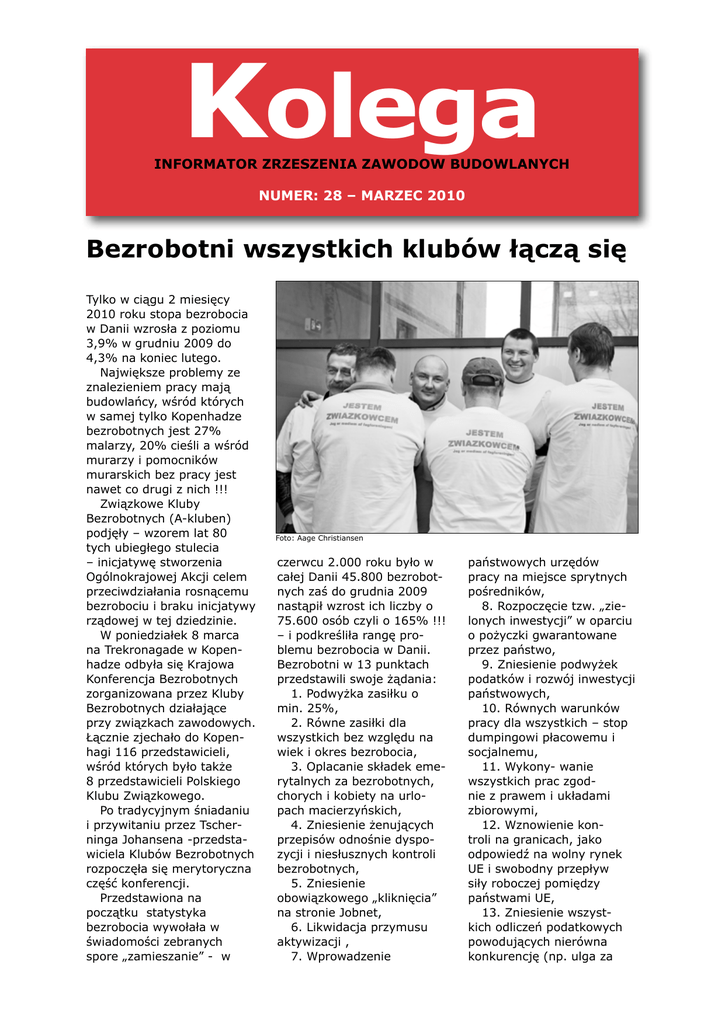 Kolega INFORMATOR ZRZESZENIA ZAWODOW BUDOWLANYCH NUMER: 28 – MARZEC 2010 Bezrobotni wszystkich klubów łączą się Tylko w ciągu 2 miesięcy 2010 roku stopa bezrobocia w Danii wzrosła z poziomu 3,9% w grudniu 2009 do 4,3% na koniec lutego. Największe problemy ze znalezieniem pracy mają budowlańcy, wśród których w samej tylko Kopenhadze bezrobotnych jest 27% malarzy, 20% cieśli a wśród murarzy i pomocników murarskich bez pracy jest nawet co drugi z nich !!! Związkowe Kluby Bezrobotnych (A-kluben) podjęły – wzorem lat 80 tych ubiegłego stulecia – inicjatywę stworzenia Ogólnokrajowej Akcji celem przeciwdziałania rosnącemu bezrobociu i braku inicjatywy rządowej w tej dziedzinie. W poniedziałek 8 marca na Trekronagade w Kopenhadze odbyła się Krajowa Konferencja Bezrobotnych zorganizowana przez Kluby Bezrobotnych działające przy związkach zawodowych. Łącznie zjechało do Kopenhagi 116 przedstawicieli, wśród których było także 8 przedstawicieli Polskiego Klubu Związkowego. Po tradycyjnym śniadaniu i przywitaniu przez Tscherninga Johansena -przedstawiciela Klubów Bezrobotnych rozpoczęła się merytoryczna część konferencji. Przedstawiona na początku statystyka bezrobocia wywołała w świadomości zebranych spore „zamieszanie” - w Foto: Aage Christiansen czerwcu 2.000 roku było w całej Danii 45.800 bezrobotnych zaś do grudnia 2009 nastąpił wzrost ich liczby o 75.600 osób czyli o 165% !!! – i podkreśliła rangę problemu bezrobocia w Danii. Bezrobotni w 13 punktach przedstawili swoje żądania: 1. Podwyżka zasiłku o min. 25%, 2. Równe zasiłki dla wszystkich bez względu na wiek i okres bezrobocia, 3. Oplacanie składek emerytalnych za bezrobotnych, chorych i kobiety na urlopach macierzyńskich, 4. Zniesienie żenujących przepisów odnośnie dyspozycji i niesłusznych kontroli bezrobotnych, 5. Zniesienie obowiązkowego „kliknięcia” na stronie Jobnet, 6. Likwidacja przymusu aktywizacji , 7. Wprowadzenie państwowych urzędów pracy na miejsce sprytnych pośredników, 8. Rozpoczęcie tzw. „zielonych inwestycji” w oparciu o pożyczki gwarantowane przez państwo, 9. Zniesienie podwyżek podatków i rozwój inwestycji państwowych, 10. Równych warunków pracy dla wszystkich – stop dumpingowi płacowemu i socjalnemu, 11. Wykony- wanie wszystkich prac zgodnie z prawem i układami zbiorowymi, 12. Wznowienie kontroli na granicach, jako odpowiedź na wolny rynek UE i swobodny przepływ siły roboczej pomiędzy państwami UE, 13. Zniesienie wszystkich odliczeń podatkowych powodujących nierówna konkurencję (np. ulga za Foto: Aage Christiansen pracę poza miejscem zamieszkania, odliczanie kosztów wyżywienia i dojazdów do pracy). Nad tymi żądaniami rozgorzała dyskusja. Przedstawiciel Polskiego Klubu Związkowego ostro zaprotestował przeciwko zapisom punktu 12 zbierając za swoje wystąpienie gromkie oklaski. Wycofano się z niego w całości gdyż był on praktycznie nie do zrealizowania. Mamy przecież Europę bez granic, mamy swobodę przemieszczania się i wprowadzenie jakichkolwiek rygorów w tym zakresie przez którekolwiek państwo UE byłoby sprzeczne z obowiązującym w UE porządkiem prawnym. Jedną z propozycji przeciwdziałaniu bezrobociu poprzez inwestycje w Grønne Job (Zielone Prace) przedstawił Jesper Lund Larsen z 3F. Okazuje się, że 1 mld DKK inwestycji w tym zakresie daje 1.000 nowych miejsc pracy a w ciągu kilku lat może ich powstać nawet 50.000. Szczególnie dotyczy to takich „zielonych” branż jak produkcja biogazu, geotermia, baterie słoneczne, energia wiatrowa, pompy cieplne, ekologiczne środki transportu. W lokalnych społecznościach związki zawodowe odgrywają bardzo dużą rolę dlatego też – jak podkreślali mówcy – należy naciskać na lokalnych polityków i lobbować w kierunku uruchamiania lokalnych inicjatyw i inwestycji ekologicznych. Tylko takie działania przyniosą w przyszłości zamierzony skutek. Jeden z bezrobotnych Polaków zapytany jak wygląda narzucona przez Jobcenter aktywizacja, powiedział, iż aby utrzymać prawo do świadczenia musi wykazać się, iż w ciągu 3 miesięcy odwiedził 72 firmy. Jobcenter – nie tylko jego zdaniem – nie pomaga w ogóle w znalezieniu pracy, mnoży za to biurokrację. n Krzysztof Kozik Zaproszenie na spotkanie Polskiego Klubu Zwiazkowego W sobote dnia 20 marca 2010 o godz.16.00 w siedzibie TIB9 odbedzie sie spotkanie klubu. Zapraszamy wszystkich czlonkow, zainteresowanych i gosci. Program spotkania: porozumienia zbiorowe, kasa bezrobocia i kurs integracji na dunskim rynku pracy. Ze wzgledu na cieply posilek prosimy o telefoniczne poinformowanie Marcina lub Roberta o udziale w spotkaniu. Zrzeszenie Zwiazkow Zawodowych Budownictwa - Jest to zrzeszenie 13 zwiazkow budowlanych w Kopenhadze (murarze, ciesle, malarze, elektrycy, ogrodnicy, pracownicy robot ziemno – betonowych, montezy rusztowan, pracownicy wodno – kanalizacji i gazu oraz hydraulicy, kowale i spawacze). Skontaktuj sie z nami pod adresem: Mølle Alle 26, 2500 Valby Redakcja: Robert Olejnik og Mads Bruun Pedersen (DJ). Napisz i zadzwon do polsko mowiacych zwiazkowcow: E-mail: [email protected] (22 79 89 60) lub [email protected] (23 45 75 34). Przeczytaj wiecej po polsku na: www.bygsam.dk, www.3f.dk, www.malerneshus.dk