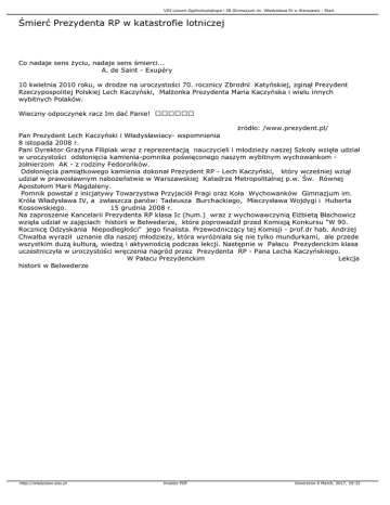 VIII Liceum Ogólnokształcące i 58 Gimnazjum im. Władysława IV w Warszawie - Start Śmierć Prezydenta RP w katastrofie lotniczej Co nadaje sens życiu, nadaje sens śmierci... A. de Saint - Exupéry 10 kwietnia 2010 roku, w drodze na uroczystości 70. rocznicy Zbrodni Katyńskiej, zginął Prezydent Rzeczypospolitej Polskiej Lech Kaczyński, Małżonka Prezydenta Maria Kaczyńska i wielu innych wybitnych Polaków. Wieczny odpoczynek racz Im dać Panie! żródło: /www.prezydent.pl/ Pan Prezydent Lech Kaczyński i Władysławiacy- wspomnienia 8 istopada 2008 r. Pani Dyrektor Grażyna Filipiak wraz z reprezentacją nauczycieli i młodzieży naszej Szkoły wzięła udział w uroczystości odsłonięcia kamienia-pomnika poświęconego naszym wybitnym wychowankom żołnierzom AK - z rodziny Fedorońków. Odsłonięcia pamiątkowego kamienia dokonał Prezydent RP - Lech Kaczyński, który wcześniej wziął udział w prawosławnym nabożeństwie w Warszawskiej Katedrze Metropolitalnej p.w. Św. Równej Apostołom Marii Magdaleny. Pomnik powstał z inicjatywy Towarzystwa Przyjaciół Pragi oraz Koła Wychowanków Gimnazjum im. Króla Władysława IV, a zwłaszcza panów: Tadeusza Burchackiego, Mieczysława Wojdygi i Huberta Kossowskiego. 15 grudnia 2008 r. Na zaproszenie Kancelarii Prezydenta RP klasa Ic (hum.) wraz z wychowawczynią Elżbietą Błachowicz wzięła udział w zajęciach historii w Belwederze, które poprowadził przed Komisją Konkursu "W 90. Rocznicę Odzyskania Niepodległości" jego finalista. Przewodniczący tej Komisji - prof.dr hab. Andrzej Chwalba wyraził uznanie dla naszej młodzieży, która wyróżniała się nie tylko mundurkami, ale przede wszystkim dużą kulturą, wiedzą i aktywnością podczas lekcji. Następnie w Pałacu Prezydenckim klasa uczestniczyła w uroczystości wręczenia nagród przez Prezydenta RP - Pana Lecha Kaczyńskiego. W Pałacu Prezydenckim Lekcja historii w Belwederze http://wladyslaw.edu.pl Kreator PDF Utworzono 6 March, 2017, 19:32