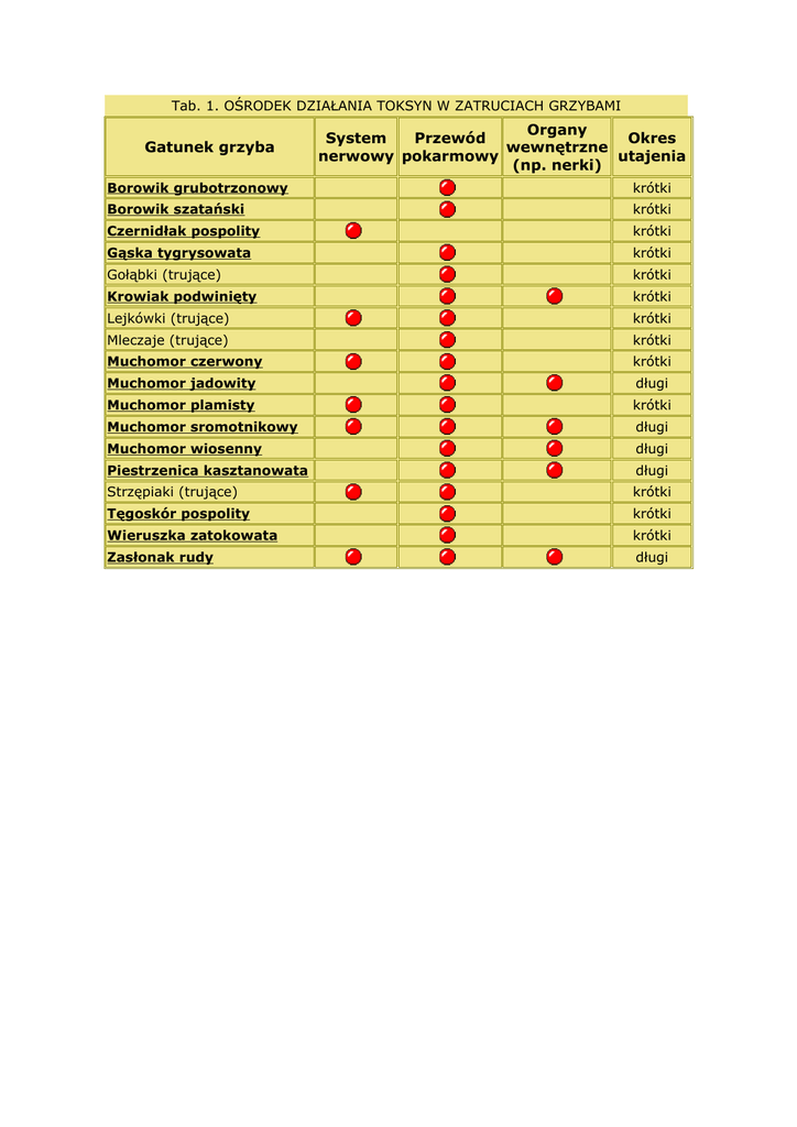 Tab. 1. OŚRODEK DZIAŁANIA TOKSYN W ZATRUCIACH GRZYBAMI Gatunek grzyba Organy System Przewód Okres wewnętrzne nerwowy pokarmowy utajenia (np. nerki) Borowik grubotrzonowy krótki Borowik szatański krótki Czernidłak pospolity krótki Gąska tygrysowata krótki Gołąbki (trujące) krótki Krowiak podwinięty krótki Lejkówki (trujące) krótki Mleczaje (trujące) krótki Muchomor czerwony krótki Muchomor jadowity długi Muchomor plamisty krótki Muchomor sromotnikowy długi Muchomor wiosenny długi Piestrzenica kasztanowata długi Strzępiaki (trujące) krótki Tęgoskór pospolity krótki Wieruszka zatokowata krótki Zasłonak rudy długi Tab. 2. PODSTAWOWE OBJAWY W ZATRUCIACH POKARMOWYCH GRZYBAMI Objawy chorobowe ból głowy zawroty głowy zaburzenia równowagi nudności - wymioty ból brzucha biegunka zaparcie skąpomocz zaburzenia wzroku zwężenie źrenic - łzawienie rozszerzenie źrenic uczucie gorąca - pocenie się podwyższona temperatura zaburzenia oddychania ślinotok szum w uszach drgawki (dreszcze) skurcze mięśni kończyn silne pragnienie zwolnienie tętna przyspieszenie tętna silne nerwowe podniecenie halucynacje osłabienie i bezwład utrata przytomności śpiączka ogólna depresja B o r o w i k g r u b o t r z o n o w y B o r o w i k s z a t a ń s k i C z e r n i d ł a k p o s p o li t y G ą s k a t y g r y s o w a t a G o ł ą b k i (t r u j ą c e ) K r o w i a k p o d w i n i ę t y L e j k ó w k i t r u j ą c e M l e c z a j e (t r u j a c e ) M u c h o m o r c z e r w o n y M u c h o m o r j a d o w it y M u c h o m o r p l a m is t y M u c h o m o r s r o m o t n i k o w y M u c h o m o r w i o s e n n y P i e s t r z e n i c a k a s z t a n o w a t a S t r z ę p i a k i (t r u j ą c e ) T e g o s k ó r p o s p o li t y W i e r u s z k a z a t o k o w a Z as ło na k ru dy