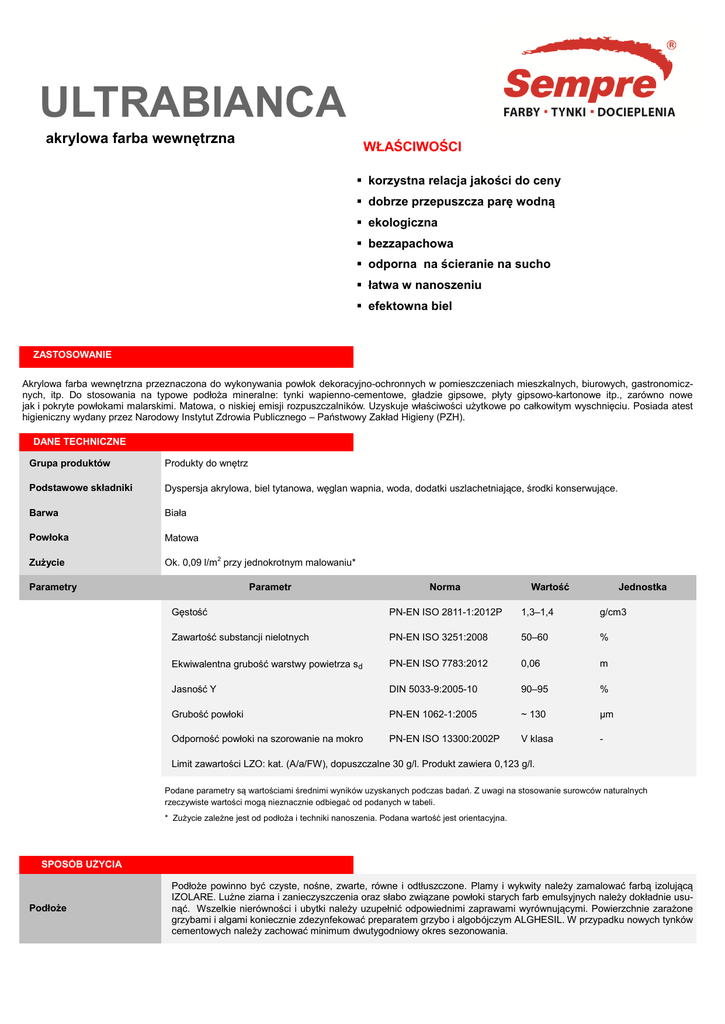 ULTRABIANCA akrylowa farba wewnętrzna WŁAŚCIWOŚCI korzystna relacja jakości do ceny dobrze przepuszcza parę wodną ekologiczna bezzapachowa odporna na ścieranie na sucho łatwa w nanoszeniu efektowna biel ZASTOSOWANIE Akrylowa farba wewnętrzna przeznaczona do wykonywania powłok dekoracyjno-ochronnych w pomieszczeniach mieszkalnych, biurowych, gastronomicznych, itp. Do stosowania na typowe podłoża mineralne: tynki wapienno-cementowe, gładzie gipsowe, płyty gipsowo-kartonowe itp., zarówno nowe jak i pokryte powłokami malarskimi. Matowa, o niskiej emisji rozpuszczalników. Uzyskuje właściwości użytkowe po całkowitym wyschnięciu. Posiada atest higieniczny wydany przez Narodowy Instytut Zdrowia Publicznego – Państwowy Zakład Higieny (PZH). DANE TECHNICZNE Grupa produktów Produkty do wnętrz Podstawowe składniki Dyspersja akrylowa, biel tytanowa, węglan wapnia, woda, dodatki uszlachetniające, środki konserwujące. Barwa Biała Powłoka Matowa Zużycie Ok. 0,09 l/m2 przy jednokrotnym malowaniu* Parametry Parametr Norma Wartość Jednostka Gęstość PN-EN ISO 2811-1:2012P 1,3–1,4 g/cm3 Zawartość substancji nielotnych PN-EN ISO 3251:2008 50–60 % Ekwiwalentna grubość warstwy powietrza sd PN-EN ISO 7783:2012 0,06 m Jasność Y DIN 5033-9:2005-10 90–95 % Grubość powłoki PN-EN 1062-1:2005 ~ 130 µm Odporność powłoki na szorowanie na mokro PN-EN ISO 13300:2002P V klasa - Limit zawartości LZO: kat. (A/a/FW), dopuszczalne 30 g/l. Produkt zawiera 0,123 g/l. Podane parametry są wartościami średnimi wyników uzyskanych podczas badań. Z uwagi na stosowanie surowców naturalnych rzeczywiste wartości mogą nieznacznie odbiegać od podanych w tabeli. * Zużycie zależne jest od podłoża i techniki nanoszenia. Podana wartość jest orientacyjna. SPOSÓB UŻYCIA Podłoże Podłoże powinno być czyste, nośne, zwarte, równe i odtłuszczone. Plamy i wykwity należy zamalować farbą izolującą IZOLARE. Luźne ziarna i zanieczyszczenia oraz słabo związane powłoki starych farb emulsyjnych należy dokładnie usunąć. Wszelkie nierówności i ubytki należy uzupełnić odpowiednimi zaprawami wyrównującymi. Powierzchnie zarażone grzybami i algami koniecznie zdezynfekować preparatem grzybo i algobójczym ALGHESIL. W przypadku nowych tynków cementowych należy zachować minimum dwutygodniowy okres sezonowania. KARTA TECHNICZNA – ULTRABIANCA Gruntowanie data aktualizacji: 03.11.2014 Przed naniesieniem farby należy zagruntować podłoże preparatem SEMPRE GRUNT W, ULTRAGRUNT lub LATEX GRUNT. Nanosić dwukrotnie wałkiem, szczotką lub przez natrysk (w tym także metodą AIRLESS, parametry nanoszenia w tabeli). Po otwarciu opakowania należy zwrócić uwagę, czy na pokrywie nie znajdują się zaschnięte pozostałości farby powstałe w wyniku nieodpowiedniego składowania. Ich obecność w wyrobie może niekorzystnie wpływać na wygląd utworzonej powłoki. W przypadku konieczności stosowania materiałów pochodzących z różnych partii produkcyjnych na jednym elemencie architektonicznym należy je wymieszać, np. w pojemniku mogącym pomieścić kilka wiaderek farby. W celu uniknięcia różnic kolorystycznych konieczne jest wykonywanie odrębnych elementów architektonicznych w jednym cyklu roboczym. Zaleca się prowadzenie prac w temp. od 10 do 30°C. Nanoszenie Producent Urządzenie Dysza Ciśnienie [bar] Filtr [mesh] Rozcieńczenie [%] Wydajność [l/min] WAGNER ProSpray 3.21 0552-519 200 60 5 1,25 TITAN Titan 450e 661-517 200 60 10 1,25 GRACO StMax 395 PAA517 180 60 10 1,25 Rozcieńczanie Produkt gotowy do użycia. W razie konieczności rozcieńczać wodą w ilości nie przekraczającej 10 %. Zbyt duże rozcieńczenie może być przyczyną zmniejszenia siły krycia, co skutkuje pojawianiem się przebarwień. Wysychanie W temperaturze 20°C i względnej wilgotności powietrza 55% czas wysychania powłoki wynosi ok. 2 godzin. Niska temperatura oraz podwyższona wilgotność powietrza wydłużają czas wysychania. Czyszczenie narzędzi Wodą natychmiast po użyciu. OPAKOWANIE 3, 5, 10 litrów PRZECHOWYWANIE Przechowywać w pomieszczeniu chłodnym, lecz chronionym przed mrozem, w oryginalnym, zamkniętym opakowaniu. Po przemrożeniu produkt nie nadaje się do użycia. Data ważności znajduje się na pokrywie opakowania. BHP/PPOŻ Chronić przed dziećmi. Wyrób niepalny. W obowiązującym prawie nie jest klasyfikowany jako niebezpieczny. Podczas pracy zachowywać podstawowe zasady BHP. W przypadku kontaktu produktu z oczami należy przemyć je dużą ilością wody, a następnie zasięgnąć porady lekarskiej. Używać zgodnie z przeznaczeniem. Producent gwarantuje jakość wyrobu, lecz nie ma wpływu na sposób jego zastosowania. Podstawą zamieszczonych tu informacji jest wiedza producenta, wynikająca z długoletnich obserwacji praktycznych zastosowań. Nie mogą one jednak zastąpić fachowego przygotowania wykonawcy i nie zwalniają go ze stosowania się do zasad sztuki budowlanej i przepisów BHP, stąd nie stanowią podstawy do rozstrzygania sporów na drodze sądowej. W przypadku pytań lub wątpliwości prosimy o kontakt z producentem.